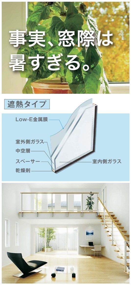 》来店不要、現場確認、見積りは無料《 窓ガラス修理、窓ガラス(断熱硝子)交換は、富山県内全域に対応します。富山県西部:高岡市、射水市、氷見市、小矢部市、砺波市、南砺市 富山県東部:富山市、滑川市、中新川郡、魚津市、黒部市、下新川郡 いい製品を、どこよりも安く! 「窓ガラスが割れた」、「エコ内窓のカギ(クレセント錠)が壊れた」、「防犯ガラスに交換したい」、「高性能トリプルガラス樹脂窓に興味がある」など、窓ガラスの修理から、ニーズに対応した窓のリフォーム工事まで、窓まわりのことなら何でもお任せください。窓ガラス専門店です。 "Smart&Eco"な生活スタイル みなさんの住まいでは、 冷暖房機器のパワーをいくら上げてもなかなか効果を感じない、ということはありませんか? 一般的な住まいでは、 外壁や屋根のほか、窓や扉などの開口部からも意外に多くの熱が出入りしています。住まいの断熱は、 人が環境と共生しながら快適に暮らしていくうえで、とても大きなメリットがあります。 これからの断熱キーワード? 「窓」夏は外からの熱の侵入は、約 7 割が窓から、また、冬になると暖房熱の約 5 割が窓から流出します。 窓からの熱の侵入・流出を効果的に防ぐことで経済的で快適な暮らしをささえます。ガラス選びで更に賢く節約夏期の日射遮蔽と冬期の日射取得を考えて Low-Eガラスにしたら、 年間冷暖房費「10%カット」冬は室内熱を外へ逃がさないため、冷暖房効率を高めます。いちばん効きやすいところから手を入れる。 それがかしこいリフォームのコツ。 そのカギをにぎっているのは、何といっても、窓。 手軽にはじめて、効果が出やすい窓のリフォームがおすすめです。 YKK AP Low-E複層ガラス(遮熱タイプ) 夏は太陽熱の侵入を防ぎ、冬は暖房熱を外に逃がしません夏の冷房時に窓・ドアから侵入してくる熱は、家全体に入ってくる熱の半分以上を占めます。室外側ガラスにLow-E複層ガラス(遮熱タイプ)なら、夏は室内に入る太陽の熱線を50%以上カット。冬は室内熱を外に逃がさないため、一般複層ガラスより冷暖房効率を高めます。紫外線を76%カット紫外線領域の吸収性能が高いため、太陽光だけでなく、紫外線も大幅カット。大切な家具やカーペットを、日焼けによる褪色・退色から守ります。住まいの大敵、結露を減らして、健康的に結露は、カーテンや窓額縁、床の汚れにつながるだけでなく、住まい住まいの寿命を縮めてしまうことすらある不快な存在。Low-E複層ガラス(遮熱タイプ)は、この結露を抑えることができるので、カビ・ダニなどの繁殖もセーブ。ご家族の健康的な暮らしを守ります。YKK AP Low-E複層ガラス(断熱タイプ)室内温度差をなくし、足元まで暖かい部屋に冬の暖房時、窓やドアから外に逃げる熱は、屋根や外壁よりも大きな割合を占めます。室内側ガラスにLow-E金属膜をコーティングしたLow-E複層ガラス(断熱タイプ)は、太陽熱を通過させながらも、室内の熱線(赤外線)を鏡のように反射します。採光や、太陽熱の取入れを図りながら、温室効果によって太陽エネルギーや暖房などの熱を外に逃がしません。一般複層ガラスより暖房効率を高めます。住まいの大敵、結露を減らして、健康的に結露は、カーテンや窓額縁、床の汚れにつながるだけでなく、住まい住まいの寿命を縮めてしまうことすらある不快な存在。Low-E複層ガラス(断熱タイプ)は、この結露を抑えることができるので、カビ・ダニなどの繁殖もセーブ。ご家族の健康的な暮らしを守ります。 》施工実績・トップクラス・創業42周年《 【工事の流れ】1.事前の打合せ。窓まわりの大きさや窓ガラスの種類を確認。2.工事開始。古いガラスを撤去して、新しい断熱ガラスを設置。3.建付調整・チェックを行い工事完了。 【工事時間】 約1時間。 現場確認、見積りは無料!まずはお電話ください! 24時間受付 0120-375-345アルミ建材和田 〒933-0062 富山県高岡市江尻856-2価格保証 かならず他店より安くします!ぜひ、ご相談ください! (社)日本サッシ協会加盟店(社)カーテンウォール・防火開口部協会加盟店 ◇スタッフは、(社)富山県建築組合連合会に加盟した高岡市の建築組合員です。 富山県建築組合連合会では、 市や町のご協力のもと県内13箇所で、『無料の住宅相談所』を開設しています。 富山県の気候風土に適した丈夫で快適な新築や増改築はもちろん、 住宅診断や耐震補強工事まで、住まいのことなら何でも、お気軽にご相談ください。 【富山県西部:営業エリア】高岡市、射水市、氷見市、小矢部市、砺波市、南砺市【富山県東部:営業エリア】富山市、滑川市、中新川郡、魚津市、黒部市、下新川郡 【所在地】富山県高岡市江尻856-2 Tel 0120-375-345 【取扱メーカー】三協アルミ、YKK AP、リクシル、旭硝子、日本板硝子、美和ロック、住友3M 来店不要!(電話で、24時間受付中!)