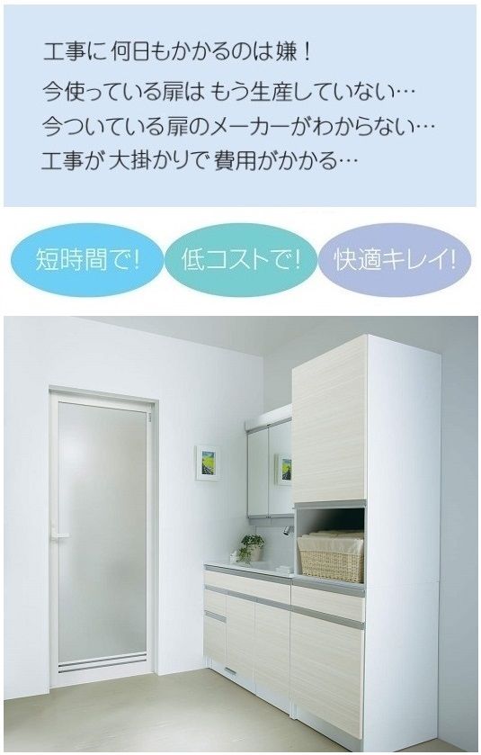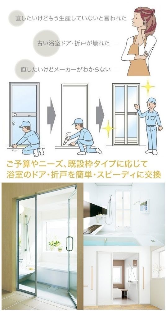》来店不要、現場確認、見積りは無料《 浴室のドア・折戸の修理、スピーディな交換は、富山県内全域に対応します。富山県西部:高岡市、射水市、氷見市、小矢部市、砺波市、南砺市富山県東部:富山市、滑川市、中新川郡、魚津市、黒部市、下新川郡 いい製品を、どこよりも安く! 「古い浴室ドア・折戸のガラスが割れた」、「直したいけどメーカーが分からない」、「もう生産してないと言われた」、「浴室の出入口を広く、使いやすい大開口引戸に、リフォームしたい」など、浴室ドアの修理から、ニーズに対応した浴室出入口のリフォーム工事まで、浴室出入口のことなら何でもお任せください。 YKK AP 浴室出入口 サニセーフ2サニセーフ2シリーズに、ドアHGタイプが新たにラインアップ。強化ガラス仕様のすっきりとしたデザインで、浴室を開放感あふれる空間に演出します。 》施工実績・トップクラス・創業42周年《 【工事の流れ】1.事前の打合せ。浴室出入口の大きさや種類を確認。2.工事開始。古い浴室ドアを撤去して、新しい浴室ドアを設置。3.シーリング・建付調整・チェックを行い工事完了。 【工事期間】 約1日。 現場確認、見積りは無料!まずはお電話ください! 24時間受付 0120-375-345アルミ建材和田 〒933-0062 富山県高岡市江尻856-2 価格保証 かならず他店より安くします!ぜひ、ご相談ください! (社)日本サッシ協会加盟店(社)カーテンウォール・防火開口部協会加盟店 ◇スタッフは、(社)富山県建築組合連合会に加盟した高岡市の建築組合員です。富山県建築組合連合会では、市や町のご協力のもと県内13箇所で、『無料の住宅相談所』を開設しています。富山県の気候風土に適した丈夫で快適な新築や増改築はもちろん、住宅診断や耐震補強工事まで、住まいのことなら何でも、お気軽にご相談ください。 【富山県西部:営業エリア】高岡市、射水市、氷見市、小矢部市、砺波市、南砺市【富山県東部:営業エリア】富山市、滑川市、中新川郡、魚津市、黒部市、下新川郡 【所在地】富山県高岡市江尻856-2 Tel 0120-375-345 【取扱メーカー】三協アルミ、YKK AP、リクシル、旭硝子、日本板硝子、美和ロック、住友3M 来店不要!(電話で、24時間受付中!)