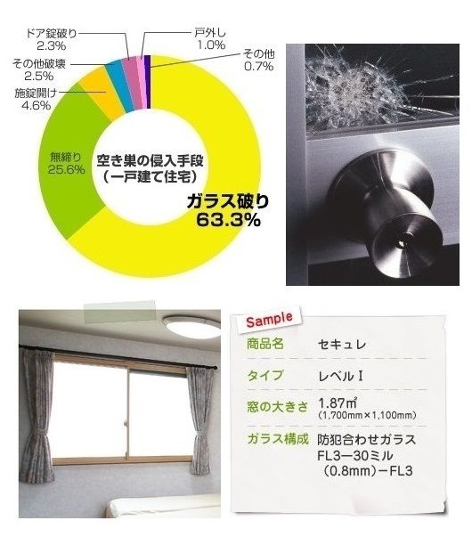 》来店不要、現場確認、見積りは無料《 窓ガラスの修理、窓ガラス(防犯硝子)の交換は、富山県内全域に対応します。富山県西部:高岡市、射水市、氷見市、小矢部市、砺波市、南砺市富山県東部:富山市、滑川市、中新川郡、魚津市、黒部市、下新川郡 いい製品を、どこよりも安く! 「窓ガラスが割れた」、「エコ内窓のカギ(クレセント錠)が壊れた」、「防犯ガラスに交換したい」、「高性能トリプルガラス樹脂窓に興味がある」など、窓ガラスの修理から、ニーズに対応した窓のリフォーム工事まで、窓まわりのことなら何でもお任せください。窓の専門店です。 AGC 旭硝子 防犯ガラス セキュレ自分の家は、自分で守るという考え方。泥棒から、結露から、暑さ寒さから、陽射しから大切な住まいを守ります。ガラスを割っての侵入を困難にさせる防犯効果、割れた時に破片が飛散・脱落しにくい防災効果に優れたお見舞金制度付きの合わせガラスです。〈セキュレ〉は、防犯・防災性能を持つ合わせガラスに、盗難・台風お見舞金制度を設けた防犯ガラスです。万一、〈セキュレ〉が破られて盗難の被害が発生した場合、限度額の範囲内でお見舞金をお支払いします。また、台風などの風災被害により〈セキュレ〉が破損した場合も、1万円のお見舞金をお支払いします。更に、侵入目的や風災被害により破壊された〈セキュレ〉は、お取替のために同じ材料を提供します。(購入後5年間)。 》施工実績・トップクラス・創業42周年《 【工事の流れ】1.事前の打合せ。窓まわりの大きさや窓ガラスの種類を確認。2.工事開始。古いガラスを撤去して、新しい防犯ガラスを設置。3.建付調整・チェックを行い工事完了。 【工事時間】 約1時間。 現場確認、見積りは無料!まずはお電話ください! 24時間受付 0120-375-345アルミ建材和田 〒933-0062 富山県高岡市江尻856-2 価格保証 かならず他店より安くします!ぜひ、ご相談ください! (社)日本サッシ協会加盟店(社)カーテンウォール・防火開口部協会加盟店 ◇スタッフは、(社)富山県建築組合連合会に加盟した高岡市の建築組合員です。富山県建築組合連合会では、市や町のご協力のもと県内13箇所で、『無料の住宅相談所』を開設しています。富山県の気候風土に適した丈夫で快適な新築や増改築はもちろん、住宅診断や耐震補強工事まで、住まいのことなら何でも、お気軽にご相談ください。 【富山県西部:営業エリア】高岡市、射水市、氷見市、小矢部市、砺波市、南砺市【富山県東部:営業エリア】富山市、滑川市、中新川郡、魚津市、黒部市、下新川郡 【所在地】富山県高岡市江尻856-2 Tel 0120-375-345 【取扱メーカー】三協アルミ、YKK AP、リクシル、旭硝子、日本板硝子、美和ロック、住友3M 来店不要!(電話で、24時間受付中!)