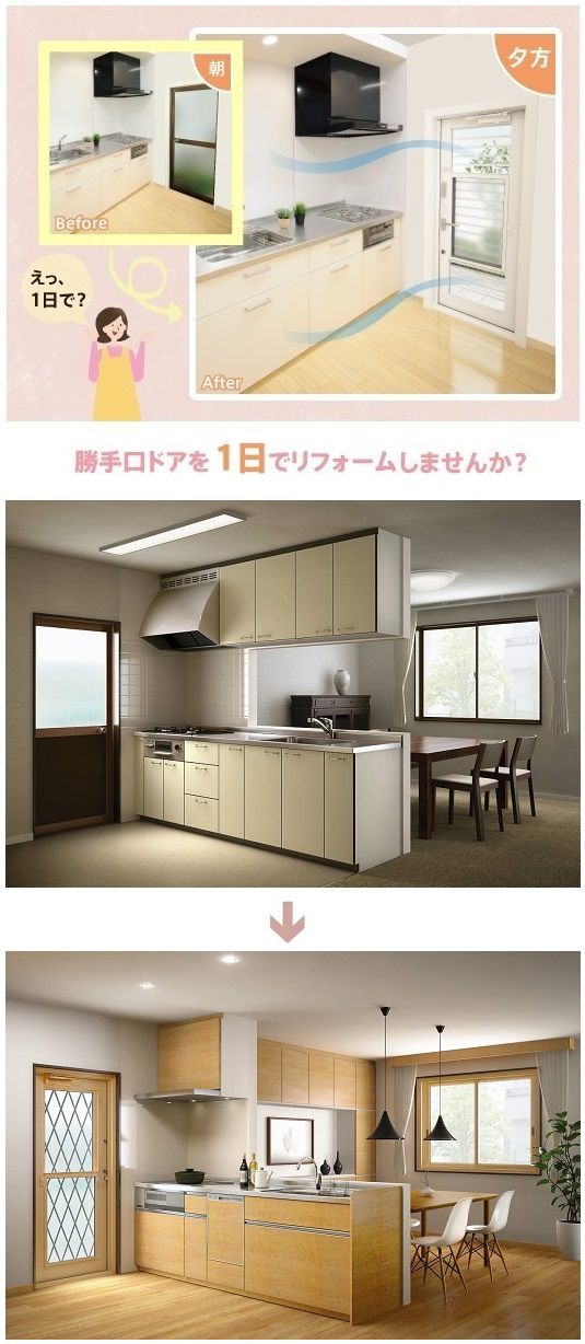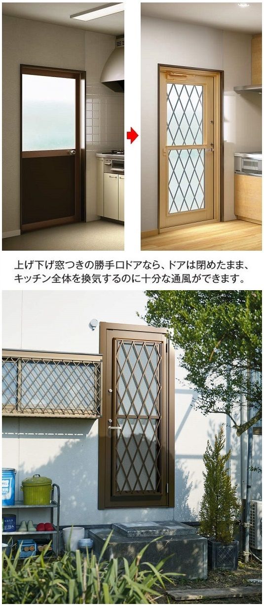 》来店不要、現場確認、見積りは無料《 勝手口ドアの修理や、勝手口ドアの交換は、富山県内全域に対応します。富山県西部:高岡市、射水市、氷見市、小矢部市、砺波市、南砺市富山県東部:富山市、滑川市、中新川郡、魚津市、黒部市、下新川郡 いい製品を、どこよりも安く! 「古い勝手口ドアのガラスが割れた」、「直したいけどメーカーが分からない」、「もう生産してないと言われた」、「もっと明るく暖かなキッチンにしたい」、「キッチンに、さわやかな風を入れたい」、「勝手口ドアの防犯性を良くしたい。家族を守りたい」など、勝手口ドアの修理から、ニーズに対応した勝手口ドアのリフォーム工事まで、勝手口まわりのことなら何でもお任せください。 勝手口ドアをかえれば、キッチンでの家事が楽しくなる!キッチンは毎日使う場所だからこそ、ちょっとした不便さであっても気になるもの。「臭いがこもる」 「足元が寒い」 などの悩みごとを解消して心地よい空間にしませんか?リフォーム勝手口ドアなら、手軽に短時間で明るく快適なキッチンに生まれ変わります。 デザイン性、機能性、安全性、快適性…さまざまな角度からあなたのこだわりにお応えするYKK APの勝手口ドア YKK AP 通風ドア エアリフレ自然の風が心地よい「エアリフレ」、ドアは閉めたまま、上げ下げ障子を開けるだけで、部屋の中を換気するのに十分な通風面積が得られます。また、障子ロックをロック状態にすれば外から上げ下げ障子を動かすことできません。網付格子には新たに「クリアネット」を標準採用。従来の網戸に比べ通風性・防虫性に優れています。 快適に過ごしたい、省エネ効果を期待したい方には断熱ドアがおすすめです。 》施工実績・トップクラス・創業42周年《 【工事の流れ】1.事前の打合せ。勝手口まわりの大きさや勝手口ドアの種類を確認。2.工事開始。古いドアを撤去して、新しい通風ドアを設置。3.シーリング・建付調整・チェックを行い工事完了。 【工事期間】 約1日。 現場確認、見積りは無料!まずはお電話ください! 24時間受付 0120-375-345アルミ建材和田 〒933-0062 富山県高岡市江尻856-2 価格保証 かならず他店より安くします!ぜひ、ご相談ください! (社)日本サッシ協会加盟店(社)カーテンウォール・防火開口部協会加盟店 ◇スタッフは、(社)富山県建築組合連合会に加盟した高岡市の建築組合員です。富山県建築組合連合会では、市や町のご協力のもと県内13箇所で、『無料の住宅相談所』を開設しています。富山県の気候風土に適した丈夫で快適な新築や増改築はもちろん、住宅診断や耐震補強工事まで、住まいのことなら何でも、お気軽にご相談ください。 【富山県西部:営業エリア】高岡市、射水市、氷見市、小矢部市、砺波市、南砺市【富山県東部:営業エリア】富山市、滑川市、中新川郡、魚津市、黒部市、下新川郡 【所在地】富山県高岡市江尻856-2 Tel 0120-375-345 【取扱メーカー】三協アルミ、YKK AP、リクシル、旭硝子、日本板硝子、美和ロック、住友3M 来店不要!(電話で、24時間受付中!)