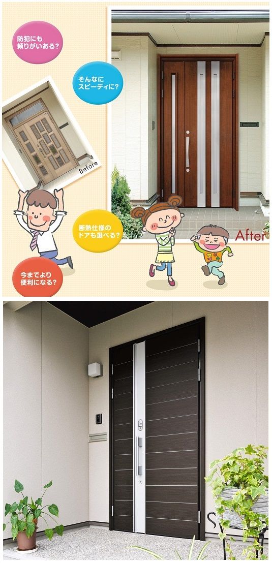 》来店不要、現場確認、見積りは無料《 玄関ドアの修理、玄関ドアの交換は、富山県内全域に対応します。富山県西部:高岡市、射水市、氷見市、小矢部市、砺波市、南砺市富山県東部:富山市、滑川市、中新川郡、魚津市、黒部市、下新川郡 いい製品を、どこよりも安く! 「玄関ドアが重くなった、開きにくい」、「玄関ドアのカギが壊れた」、「もっと明るく暖かい玄関にリフォームしたい」、「玄関ドアの防犯面をよくしたい」、「1日で、最新のスマート ドアに交換したい」など、玄関ドアの修理から、リフォームニーズに対応した玄関ドアの交換工事まで、玄関まわりのことなら何でもお任せください。 三協アルミ 玄関ドア ラフォースシリーズ豊富なカラーと個性的な飾り鋳物、欧風デザインの魅力溢れる"ナチュレ"エントランスからはじまる私らしい暮らし。それは、女性目線から生まれた感性のカタチ。女性の感性を生かした玄関ドアシリーズ。 》施工実績・トップクラス・創業42周年《 【工事の流れ】1.事前の打合せ。玄関まわりの大きさや玄関ドアの種類を確認。2.工事開始。古い玄関ドアを撤去し、新しい断熱玄関ドアを設置。3.シーリング・建付調整・チェックを行い工事完了。 【工事期間】 約1日。 現場確認、見積りは無料!まずはお電話ください! 24時間受付 0120-375-345アルミ建材和田 〒933-0062 富山県高岡市江尻856-2 価格保証 かならず他店より安くします!ぜひ、ご相談ください! (社)日本サッシ協会加盟店(社)カーテンウォール・防火開口部協会加盟店 ◇スタッフは、(社)富山県建築組合連合会に加盟した高岡市の建築組合員です。富山県建築組合連合会では、市や町のご協力のもと県内13箇所で、『無料の住宅相談所』を開設しています。富山県の気候風土に適した丈夫で快適な新築や増改築はもちろん、耐震補強工事や住宅診断まで、住まいのことなら何でも、お気軽にご相談ください。 【富山県西部:営業エリア】高岡市、射水市、氷見市、小矢部市、砺波市、南砺市【富山県東部:営業エリア】富山市、滑川市、中新川郡、魚津市、黒部市、下新川郡 【所在地】富山県高岡市江尻856-2 Tel 0120-375-345 【取扱メーカー】三協アルミ、YKK AP、リクシル、旭硝子、日本板硝子、美和ロック、住友3M 来店不要!(電話で、24時間受付中!)
