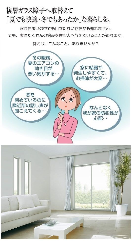 》来店不要、現場確認、見積りは無料《 窓ガラス修理、窓ガラス(ガス入り複層硝子)交換は、富山県内全域に対応します。 富山県西部:高岡市、射水市、氷見市、小矢部市、砺波市、南砺市 富山県東部:富山市、滑川市、中新川郡、魚津市、黒部市、下新川郡 いい製品を、どこよりも安く! 「窓ガラスが割れた」、「エコ内窓のカギ(クレセント錠)が壊れた」、 「防犯ガラスに交換したい」、「高性能トリプルガラス樹脂窓に興味がある」など、 窓ガラスの修理から、ニーズに対応した窓のリフォーム工事まで、 窓まわりのことなら何でもお任せください。窓の専門店です。 "Smart&Eco"な生活スタイル みなさんの住まいでは、冷暖房機器のパワーをいくら上げてもなかなか効果を感じない、ということはありませんか?一般的な住まいでは、外壁や屋根のほか、窓や扉などの開口部からも意外に多くの熱が出入りしています。 住まいの断熱は、人が環境と共生しながら快適に暮らしていくうえで、とても大きなメリットがあります。 これからの断熱キーワード? 「窓」 平成4年省エネ基準で建てた住宅モデルにおける例では、夏は外からの熱の侵入は、約 7 割が窓から、また、冬になると暖房熱の約 5 割が窓から流出します。窓からの熱の侵入・流出を効果的に防ぐことで経済的で快適な暮らしをささえます。 いちばん効きやすいところから手を入れる。それがかしこいリフォームのコツ。そのカギをにぎっているのは、何といっても、窓。手軽にはじめて、効果が出やすい窓のリフォームがおすすめです。YKK AP ガス入り複層ガラスアルゴンガスで断熱性アップ 複層ガラスに気体の断熱材ともいわれるアルゴンガスを注入した仕様で、断熱性能をさらに向上。冬の寒さの厳しい地域におすすめです。アルゴンガスとは アルゴンガスは、空気中に1パーセント存在する不活性ガスです。毒性はなく不燃性で、人体に悪影響はありません。電球や蛍光灯の中にも封入されているガスです。このガスは、空気よりも熱伝導率が低いため熱を伝えにくく、また、空気よりも比重が重く、複層ガラスの中空層で滞留を抑えて断熱効果を高めます。 》施工実績・トップクラス・創業42周年《 【工事の流れ】 1.事前の打合せ。窓まわりの大きさや窓ガラスの種類を確認。 2.工事開始。古いガラスを撤去して、新しいガス入り複層ガラスを設置。 3.建付調整・チェックを行い工事完了。 【工事時間】 約1時間。現場確認、見積りは無料!まずはお電話ください! 24時間受付 0120-375-345アルミ建材和田 〒933-0062 富山県高岡市江尻856-2 価格保証 かならず他店より安くします!ぜひ、ご相談ください! (社)日本サッシ協会加盟店 (社)カーテンウォール・防火開口部協会加盟店 ◇スタッフは、(社)富山県建築組合連合会に加盟した高岡市の建築組合員です。富山県建築組合連合会では、市や町のご協力のもと県内13箇所で、『無料の住宅相談所』を開設しています。富山県の気候風土に適した丈夫で快適な新築や増改築はもちろん、住宅診断や耐震補強工事まで、住まいのことなら何でも、お気軽にご相談ください。 【富山県西部:営業エリア】高岡市、射水市、氷見市、小矢部市、砺波市、南砺市 【富山県東部:営業エリア】富山市、滑川市、中新川郡、魚津市、黒部市、下新川郡 【所在地】富山県高岡市江尻856-2 Tel 0120-375-345 【取扱メーカー】三協アルミ、YKK AP、リクシル、旭硝子、日本板硝子、美和ロック、住友3M 来店不要!(電話で、24時間受付中!)