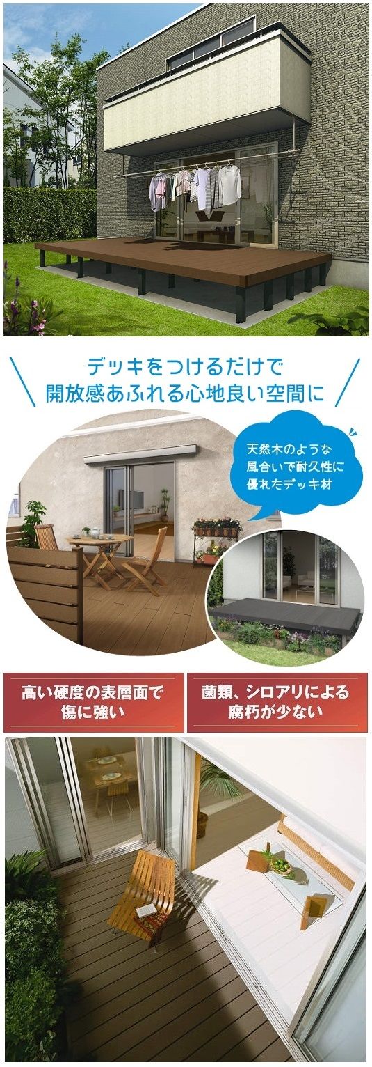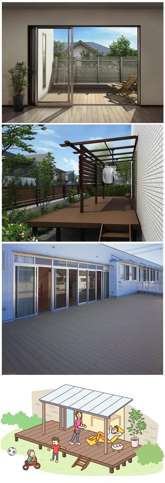 》来店不要、現場確認、見積りは無料《 デッキの修理、デッキの新設工事は、富山県内全域に対応します。富山県西部:高岡市、射水市、氷見市、小矢部市、砺波市、南砺市富山県東部:富山市、滑川市、中新川郡、魚津市、黒部市、下新川郡 いい製品を、どこよりも安く! 「デッキ材が変色した」、「デッキが腐った、壊れた」、「ドッグランできるデッキスペースに興味がある」、「家族でバーベキューできる場所がほしい」など、デッキの修理から、ニーズに対応したデッキまわりのリフォーム工事まで、デッキのことなら何でもお任せください。エクステリア工事の専門店です。 YKK AP ガーデンエクステリア リウッドデッキ200外を眺め、庭に出れば気分ウキウキ、四季を通じて楽しい時間が作れます。「リウッド」は、天然木特有の温かみを活かしたYKK APグループ独自の新素材です。天然木との違いは、長期間変色しにくい、腐りにくい、水はけがいい、ささくれがないことです。「リウッドデッキ」200は、耐候性、耐腐朽性、耐久性、高硬度で、天然木と比べ多くの特長がある再生木を使用した、環境にやさしい商品です。2階のバルコニーやルーフテラスに使えるタイプも揃えています。住宅やガーデンスタイルに合せたデッキ空間を提案します。 デッキ材のカラーは選べる4色 》施工実績・トップクラス・創業42周年《 【工事の流れ】1.事前の打合せ。デッキまわりの大きさやデッキの種類を確認。2.工事開始。リウッドデッキを設置。3.チェックを行い工事完了。 【工事期間】 約1日。 現場確認、見積りは無料!まずはお電話ください! 24時間受付 0120-375-345アルミ建材和田 〒933-062 富山県高岡市江尻856-2 価格保証 かならず他店より安くします!ぜひ、ご相談ください! (社)日本サッシ協会加盟店(社)カーテンウォール・防火開口部協会加盟店 ◇スタッフは、(社)富山県建築組合連合会に加盟した高岡市の建築組合員です。富山県建築組合連合会では市や町のご協力のもと県内13箇所で、『無料の住宅相談所』を開設しています。富山県の気候風土に適した丈夫で快適な新築や増改築はもちろん、住宅診断や耐震補強工事まで、住まいのことなら何でも、お気軽にご相談ください。 【富山県西部:営業エリア】高岡市、射水市、氷見市、小矢部市、砺波市、南砺市【富山県東部:営業エリア】富山市、滑川市、中新川郡、魚津市、黒部市、下新川郡 【所在地】富山県高岡市江尻856-2 Tel 0120-375-345 【取扱メーカー】三協アルミ、YKK AP、リクシル、旭硝子、日本板硝子、美和ロック、住友3M 来店不要!(電話で、24時間受付中!)