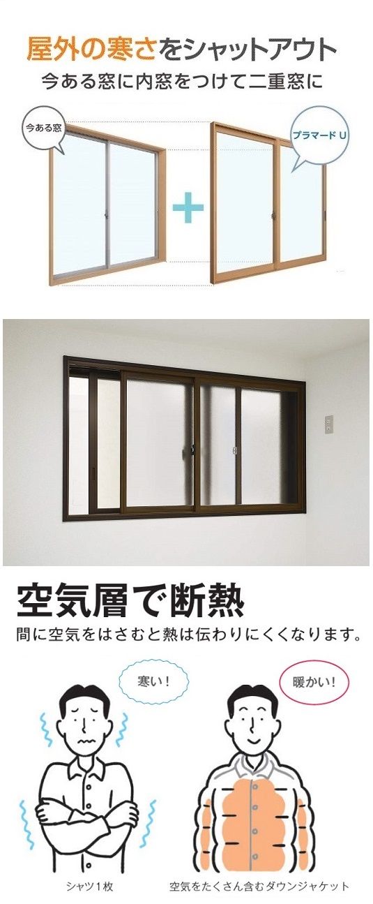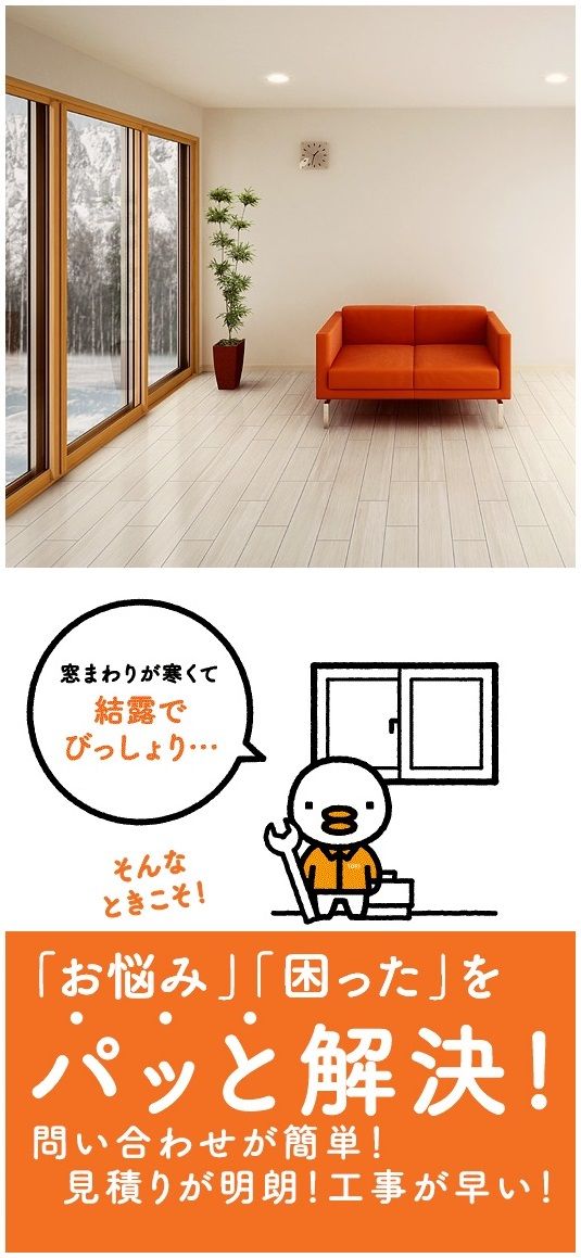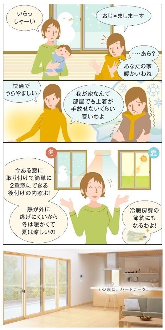 》来店不要、現場確認、見積りは無料《 断熱内窓の修理、断熱内窓の取付けは、富山県内全域に対応します。富山県西部:高岡市、射水市、氷見市、小矢部市、砺波市、南砺市富山県西部:富山市、滑川市、中新川郡、魚津市、黒部市、下新川郡 いい製品を、どこよりも安く! 「断熱内窓のガラスが割れた」、「断熱内窓のカギ(クレセント錠)が壊れた」、「防音のために断熱内窓がほしい」、「断熱内窓の省エネ(節電)効果に興味がある」など、断熱内窓の修理から、ニーズに対応した窓のリフォーム工事まで、窓まわりのことなら何でもお任せください。窓の専門店です。 リクシル リフォーム内窓 インプラスウッド/インプラスあなたの家の窓にも、カンタンに後付けできる 防音・断熱内窓「インプラス」を。もう一枚、窓をプラスしてぐっと快適な住空間へ。あつい!さむい!うるさい!のは、窓の問題じゃないですか?家の暖かさを逃がしているのは、窓でした。インプラスを付ければ暖冷房費がグッと減り、家計にも地球にもやさしくなります。外の音が気になる方にも、家の中の音を漏らしたくない方にも、インプラスを付ければ、双方向の遮音性が大幅にUPします。さらに不快な結露も抑えます。ダストバリア(業界初)で ホコリを寄せ付けないので、汚れにくく、お掃除がグンとラクになります。[断熱効果]をプラスインプラスは樹脂製。樹脂はアルミに比べて熱伝導率が、1/1000程度と、断熱効果に優れた素材です。さらに今ある窓との間に生まれる空気層が室内の熱を外に伝えにくくし、断熱効果を発揮します。外気温の影響を受けにくい快適な室内環境を実現します。[遮熱効果]をプラス遮熱高断熱複層ガラス入インプラスを使うと、室外側ガラスにコーティングした特殊金属膜により、夏の強い日差しを約60%カットし、冷房効果を高めます。室内の明るさはそのままに、窓から入る熱をカットし、紫外線も大幅に遮断。健康を守るのはもちろん、家具やインテリアの色あせも防ぎます。 》施工実績・トップクラス・創業42周年《 【工事の流れ】1.事前の打合せ。窓まわりの大きさや断熱内窓の種類を確認。2.工事開始。今ある窓の室内側(窓額縁)に、断熱内窓を設置。3.建付調整・チェックを行い工事完了。 【工事時間】 約60分。 現場確認、見積りは無料!まずはお電話ください! 24時間受付 0120‐375‐345アルミ建材和田 〒933-0062 富山県高岡市江尻856-2 価格保証 かならず他店より安くします!ぜひ、ご相談ください! (社)日本サッシ協会加盟店(社)カーテンウォール・防火開口部協会加盟店 ◇スタッフは、(社)富山県建築組合連合会に加盟した高岡市の建築組合員です。富山県建築組合連合会では、市や町のご協力のもと県内13箇所で、『無料の住宅相談所』を開設しています。富山県の気候風土に適した丈夫で快適な新築や増改築はもちろん、住宅診断や耐震補強工事まで、住まいのことなら何でも、お気軽にご相談ください。 【富山県西部:営業エリア】高岡市、射水市、氷見市、小矢部市、砺波市、南砺市【富山県東部:営業エリア】富山市、滑川市、中新川郡、魚津市、黒部市、下新川郡 【所在地】富山県高岡市江尻856-2 Tel 0120-375-345 【取扱メーカー】三協アルミ、YKK AP、リクシル、旭硝子、日本板硝子、美和ロック、住友3M 来店不要!(電話で、24時間受付中!)