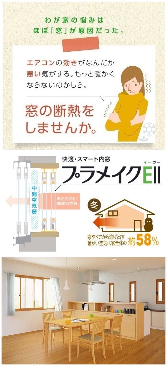 》来店不要、現場確認、見積りは無料《 スマート内窓の修理、スマート内窓の取付けは、富山県内全域に対応します。富山県西部:高岡市、射水市、氷見市、小矢部市、砺波市、南砺市富山県西部:富山市、滑川市、中新川郡、魚津市、黒部市、下新川郡 いい製品を、どこよりも安く! 「スマート内窓のガラスが割れた」、「スマート内窓のカギ(クレセント錠)が壊れた」、「防音のためにスマート内窓がほしい」、「スマート内窓の節電(断熱)効果に興味がある」など、スマート内窓の修理から、ニーズに対応した窓のリフォーム工事まで、窓まわりのことなら何でもお任せください。窓の専門店です。 三協アルミ 快適・スマート内窓 プラメイクE2窓辺が変われば、暮らしはスマートになる。窓は住まいの中で熱と音が最も出入りする場所です。冷暖房の効きが悪い・・・窓が結露でビッショリ・・・外の騒音が耳障り・・・だとしたら、それはほぼ窓が原因。今ある窓に付けるだけの「快適・スマート内窓プラメイクE2」なら、そんな窓辺の環境を一気に解決します。しかも木目が際立つカラーも新登場してグレード感もアップ。暮らしに快適とスマートをどうぞ。 》施工実績・トップクラス・創業42周年《 【工事の流れ】1.事前の打合せ。窓まわりの大きさやスマート内窓の種類を確認。2.工事開始。今ある窓の額縁(内側)に、スマート内窓を設置。3.建付調整・チェックを行い工事完了。 【工事時間】 約60分。 現場確認、見積りは無料!まずはお電話ください! 24時間受付 0120‐375‐345アルミ建材和田 〒933-0062 富山県高岡市江尻856-2 価格保証 かならず他店より安くします!ぜひ、ご相談ください! (社)日本サッシ協会加盟店(社)カーテンウォール・防火開口部協会加盟店 ◇スタッフは、(社)富山県建築組合連合会に加盟した他高岡市の建築組合員です。富山県建築組合連合会では、市や町のご協力のもと県内13箇所で、『無料の住宅相談所』を開設しています。富山県の気候風土に適した丈夫で快適な新築や増改築はもちろん、住宅診断や耐震補強工事まで、住まいのことなら何でも、お気軽にご相談ください。 【富山県西部:営業エリア】高岡市、射水市、氷見市、小矢部市、砺波市、南砺市【富山県東部:営業エリア】富山市、滑川市、中新川郡、魚津市、黒部市、下新川郡 【所在地】富山県高岡市江尻856-2 Tel 0120-375-345 【取扱メーカー】三協アルミ、YKK AP、リクシル、旭硝子、日本板硝子、美和ロック、住友3M 来店不要!(電話で、24時間受付!)
