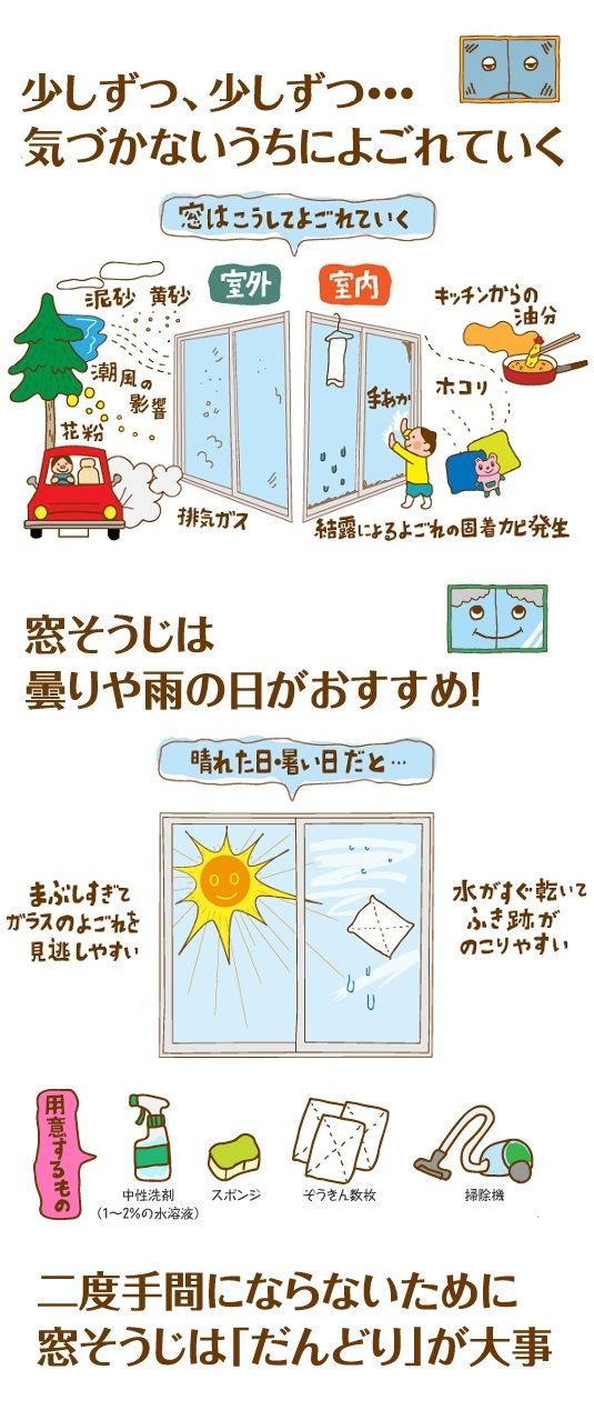 窓は、毎日よごれがたまっていく場所。窓のよごれは気づかないうちにお部屋の印象を暗くし、 外からの住まいの見栄えにも影響をあたえがちです。また、窓辺に干した洗濯物によごれが移ってしまう、カビの原因になるなど さらなるよごれを生み出してしまうこともあります。せっかく窓をきれいにしても、その後、網戸やカーテンのゴミやホコリが舞って、ガラスをよごしてしまうことも。 何度も同じところをやり直ししないためにも、順序を考えて進めましょう。ガラスのそうじは、よごれやすい面から、つまり一般的によごれやすい室外側からはじめます。そうしないと室外側のよごれにまぎれて室内側のよごれが見えにくいですし、先に室外側をやっておくと、後から室内側をそうじするときに、ふき残しを見つけやすくなります。また、洗剤が乾いてこびりつくのを防ぐために、1枚ずつそうじしていくことも大切です。手順① ぞうきんに洗剤を浸します。ガラスに直接洗剤をスプレーする方法もありますが、ムラになりやすく洗剤の液ダレが残りやすいので、洗剤は先にぞうきんにつけるのがおすすめです。ぞうきんは常にきれいなもの、きれいな面を使うようにしてください。手順②洗剤が乾く前に固く絞ったぞうきんでガラスを拭きます。まずはサッシに沿ってガラスの端を四角く拭き、中央に向かってコの字型に拭いていくと効率よくきれいになります。手順③ガラスに残った水気を取除きます。拭き残しや拭きムラがないか正面だけでなく、いろいろな角度から確認するのがポイントです。