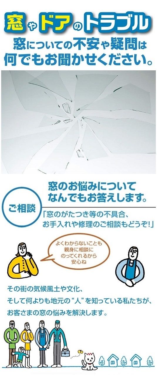 》来店不要、現場確認、見積りは無料《 緊急の窓ガラス修理、緊急の窓ガラス交換は、富山県内全域に対応します。 富山県西部:高岡市、射水市、氷見市、小矢部市、砺波市、南砺市 富山県東部:富山市、滑川市、中新川郡、魚津市、黒部市、下新川郡 ◆地域に根差した窓・ドアの修理の専門店です。お気軽にご相談ください。 いい製品を、どこよりも安く! 「窓ガラスが割れた」、「エコ内窓のカギ(クレセント錠)が壊れた」、「防犯ガラスに交換したい」、「高性能トリプルガラス樹脂窓に興味がある」など、窓ガラスの修理から、ニーズに対応した窓のリフォーム工事まで、窓まわりのことなら何でもお任せください。窓の専門店です。 "Smart&Eco"な生活スタイル みなさんの住まいでは、 冷暖房機器のパワーをいくら上げてもなかなか効果を感じない、ということはありませんか? 一般的な住まいでは、外壁や屋根のほか、 窓や扉などの開口部からも意外に多くの熱が出入りしています。住まいの断熱は、 人が環境と共生しながら快適に暮らしていくうえで、とても大きなメリットがあります。 これからの断熱キーワード? 「窓」平成4年省エネ基準で建てた住宅モデルにおける例では、 夏は外からの熱の侵入は、約 7 割が窓から、また、冬になると暖房熱の約 5 割が窓から流出します。 窓からの熱の侵入・流出を効果的に防ぐことで経済的で快適な暮らしをささえます。ガラス選びで更に賢く節約夏期の日射遮蔽と冬期の日射取得を考えて Low-Eガラスにしたら、 年間冷暖房費「10%カット」冬は室内熱を外へ逃がさないため、冷暖房効率を高めます。いちばん効きやすいところから手を入れる。 それがかしこいリフォームのコツ。 そのカギをにぎっているのは、何といっても、窓。 手軽にはじめて、効果が出やすい窓のリフォームがおすすめです。 》施工実績・トップクラス・創業42周年《 【工事の流れ】1.事前の打合せ。窓まわりの大きさや窓ガラスの種類を確認。2.工事開始。古いガラスを撤去して、新しい窓ガラスを設置。3.建付調整・チェックを行い工事完了。 【工事時間】 約1時間。 現場確認、見積りは無料!まずはお電話ください! 24時間受付 0120-375-345アルミ建材和田 〒933-0062 富山県高岡市江尻856-2価格保証 かならず他店より安くします!ぜひ、ご相談ください! (社)日本サッシ協会加盟店(社)カーテンウォール・防火開口部協会加盟店 ◇スタッフは、(社)富山県建築組合連合会に加盟した高岡市の建築組合員です。 富山県建築組合連合会では、 市や町のご協力のもと県内13箇所で、『無料の住宅相談所』を開設しています。 富山県の気候風土に適した丈夫で快適な新築や増改築はもちろん、 住宅診断や耐震補強工事まで、住まいのことなら何でも、お気軽にご相談ください。 【富山県西部:営業エリア】高岡市、射水市、氷見市、小矢部市、砺波市、南砺市【富山県東部:営業エリア】富山市、滑川市、中新川郡、魚津市、黒部市、下新川郡 【所在地】富山県高岡市江尻856-2 Tel 0120-375-345 【取扱メーカー】三協アルミ、YKK AP、リクシル、旭硝子、日本板硝子、美和ロック、住友3M 来店不要!(電話で、24時間受付中!)
