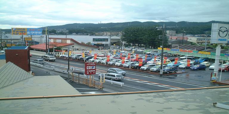 午前中はかなりの雨が降りましたねー銀行に行った時が一番強く降って車から出られない状態でした。お昼近くになってからは小降りになってきたので近くのホームセンターに行きドッグフードとか、蚊取り線香とかを購入・・その時屋上の駐車上からパチリと一枚写してきました。明日も今日のような天気になるらしいです。