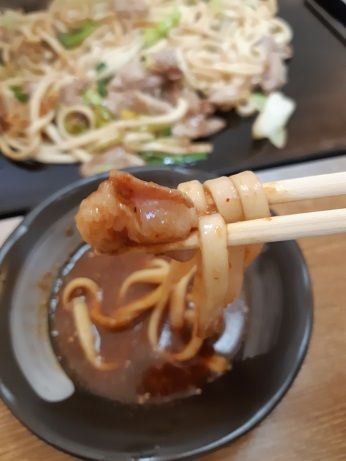 鉄板から小皿へうどんを取りわけ頂くと、うまし!