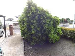 昨日の台風による風と雨がおさまり、日差しがとても強く良い天気。雨戸を開け外に出てみると我が家入り口にあるゴールドクレストの木が根元から倒れていました。強風に煽られ根っこの部分から持ち上がり倒れたように見えます。隣に植えてあるブルーベリーの木もゴールドクレストの木がもたれかかり苦しそうにしています。台風5号がもうじき来る予定なので、暫くはこのままで我慢するしかないでしょう。倒れた木を早く元に戻してあげたい・・・。そんな思いで一杯です。
