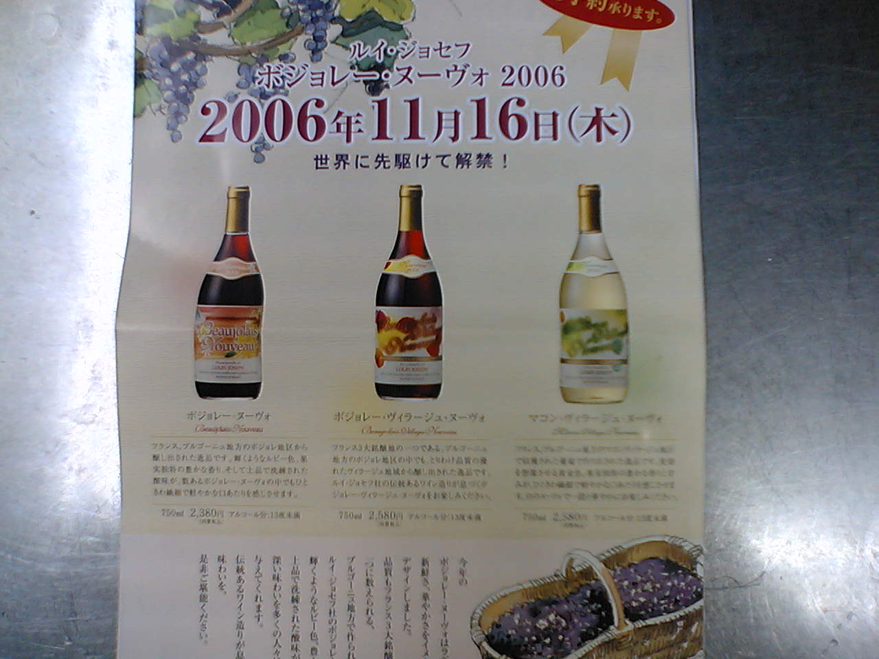 もうこんな時季かぁ~。一年は早いものですねぇ~。こないだ飲んだ?ような気がするんだけどな きっとまた「今年のボジョレーは例年になく出来がイイ!」とか言うんだろうなぁ。 、って言うか毎年そんなこと言ってないかい そう思っているのはオレだけ まぁ 毎年おいしく飲んでいるからいいけど さて今年は何本飲むのだろう・・・