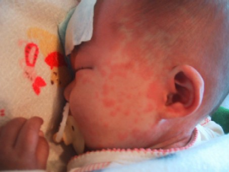 でも熱が下がりきらないうちから、頭の先から顔・体中に赤い濃い発疹が出はじめました。