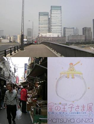 写真上は,晴海大橋からトリトンスクエア方面を写したものです。左下は築地場外,右下は「星の王子さま展」のパンフ。