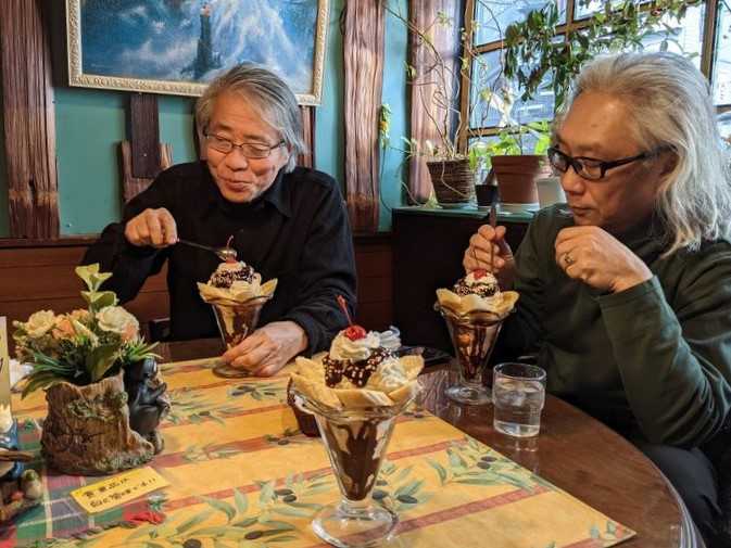 むっちゃん先生のチャリティ・イベントをしようと打ち合わせしてから1年が経ってしまった。新型コロナの騒ぎがまだ終わりませんがバカバカしくて話題にもしたくない。コレ、まだズルズルとやってたら次の災害くるかもしれないし...笑)とにかく、皆様、精度の高い情報をつかんで、たくましく生き延びることです。そして、再び、むっちゃん先生を常世の国から迎えてみんなで集まりましょう☆********* ******** *********2021年1月22日 おじさんとおばさんがチョコレートパフェを頬張りながら秘密会議(笑)ワンダー・アイズの大塚さんとクラブワールドの大村さん