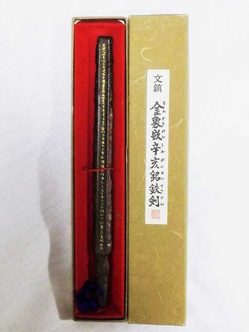 ★神道と日本刀。日本刀と言えば時代劇のイメージがある。だけれども古代刀も多く出土している。稲荷山古墳出土鉄剣は有名だ。私はレプリカの文鎮を2つ持っている。崇神天皇の将軍の大彦命の親衛隊長の佩刀である。欠世八代の時代の生まれであるからやはり実在していた証明になる。聖徳太子の佩刀は七星剣。北斗七星が刀身に刻まれている。それを操れるのは北極星のみ。天皇大帝だ。神道では剣祓いというものがある。剣で邪気を祓うのだ。鹿島神道流や香取神道流、また塚原卜伝の新当流も神道の流派である。当然、日本刀は必要。名刀・政宗の岡崎政宗は隕石が落ちたところに旅をしている。要するに隕鉄=地球外物質をもちいて最強の刀を 鍛錬した。弟子の村正は徳川にたたる刀をつくり妖刀・村正と言われた。眞田幸村の佩刀である。その為、幕末維新の志士たちは、村正を求めた。近藤勇は虎徹。土方歳三は兼定。沖田総司は菊一文字。僕の包丁も菊一文字です(笑)。佐々木道誉と同じです。三島由紀夫は関孫六でしたね。これも持っていました。でも一番欲しいのは・・・石上神宮の七支刀です。ネクタイピンは持っています(笑)。 ********* ********* *********稲荷山古墳出土鉄剣 レプリカの文鎮お腹のネクタイピンは石上神宮の七支刀印は降三世明王法オン!!!