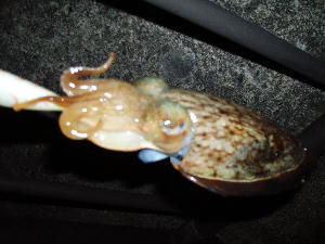 こんばんわ、たこおやじです今宵は、晴天風も微風も結構いい感じこんな日は、じぇ~ったい、メバルなんだけど・・・・・先日来、拉致って海に連れて行ってる後輩君何でも、先日単独でコウイカ釣りに行って、つれたのはいいけど、タモ持ってなくて引っこ抜こうとしたけど、ポチャンだそうで「コウイカ、行きませんか」え?ちっちゃい声だと聞こえないよ「コウイカ釣りたい、食べたい」どうやら、リベンジにいきたいようだならば、付き合ってあげようジャンもうすぐ始まる親アオリに向けて、コウイカのビミョーな釣りでイメージトレーニングだえ?なに?「明日仕事なので・・・」え~い、19時から3時間だけの勝負じゃあああで、マクドで腹ごしらえしていきなり「釣れました」ほぇ?はいはい、タモ入れさしていただきますよミッション終了ジャン僕釣ってないし、僕、ボーズじゃ話しにならんでしょ、負けてなるものか意地でも釣らなきゃ(ここで意地張ってどうする、意地張るならあおりで張れよ)で、睨むんじゃねーよほいきたと、怒涛の3連荘で逆転そして、とどめの4杯目を狙っていたら・・・・・ビミョーなあたりだ・・・・・確かに、ビミョーだったウルトラマンの怪獣みたいなのがつれたなまこか~と、あっという間の3時間なのでしたそれにしても、空は晴れ渡り、お月様も早くから出てたしメバルも釣れたかもな~、気になる気になると、思いながら帰ってきたら遠く和歌山から、で~っかいあおりのメールが届きましたく~、和歌山イキテ~ おやすみなさい