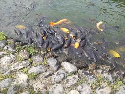 鯉がやたら食欲旺盛でエサの麩をやると陸に上がる勢いで寄ってくる