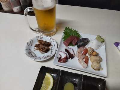一番奥に立たせてもらって金麦よ、アテは刺身盛り合わせ