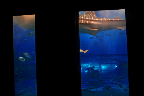 ビル並みの高さと幅を誇るアクリルガラスの向こうに魚類「最大」であるジンベイザメが3頭も泳ぐ水槽。人類、そして日本人は無差別に巨大が好きで、象やキリンなどアフリカの生物が日本各地(動物園)で見ることができますし、東京スカイツリーは完成間近、ジンベイザメが泳ぐ水槽はすでに日本にいくつかあります。しかしまだマッコウクジラやシロナガスクジラなど超巨大哺乳類を収納できる水槽はありませんね。