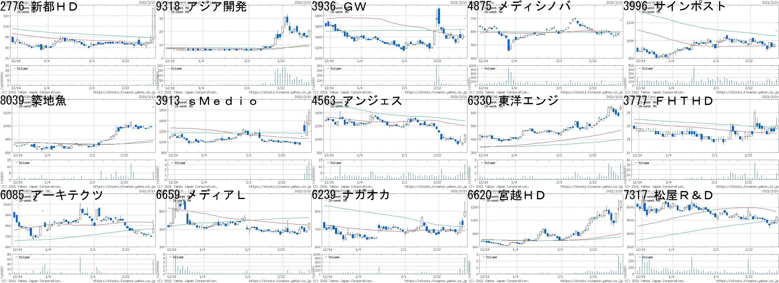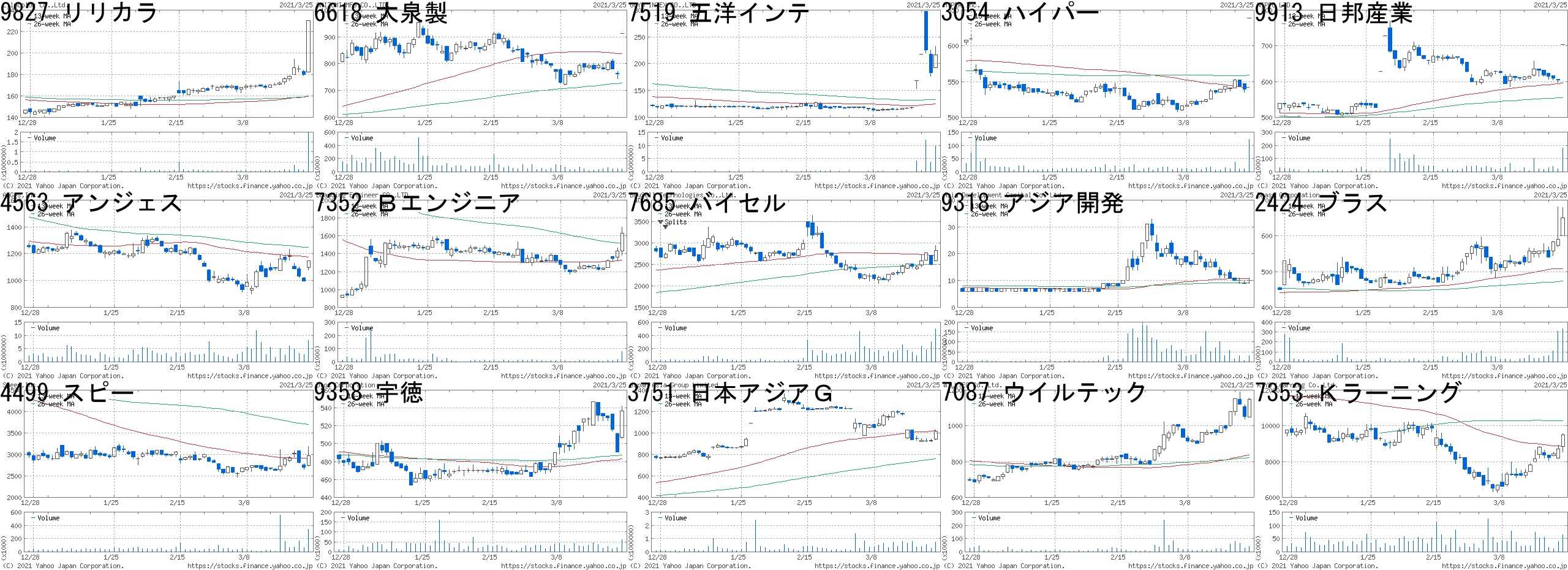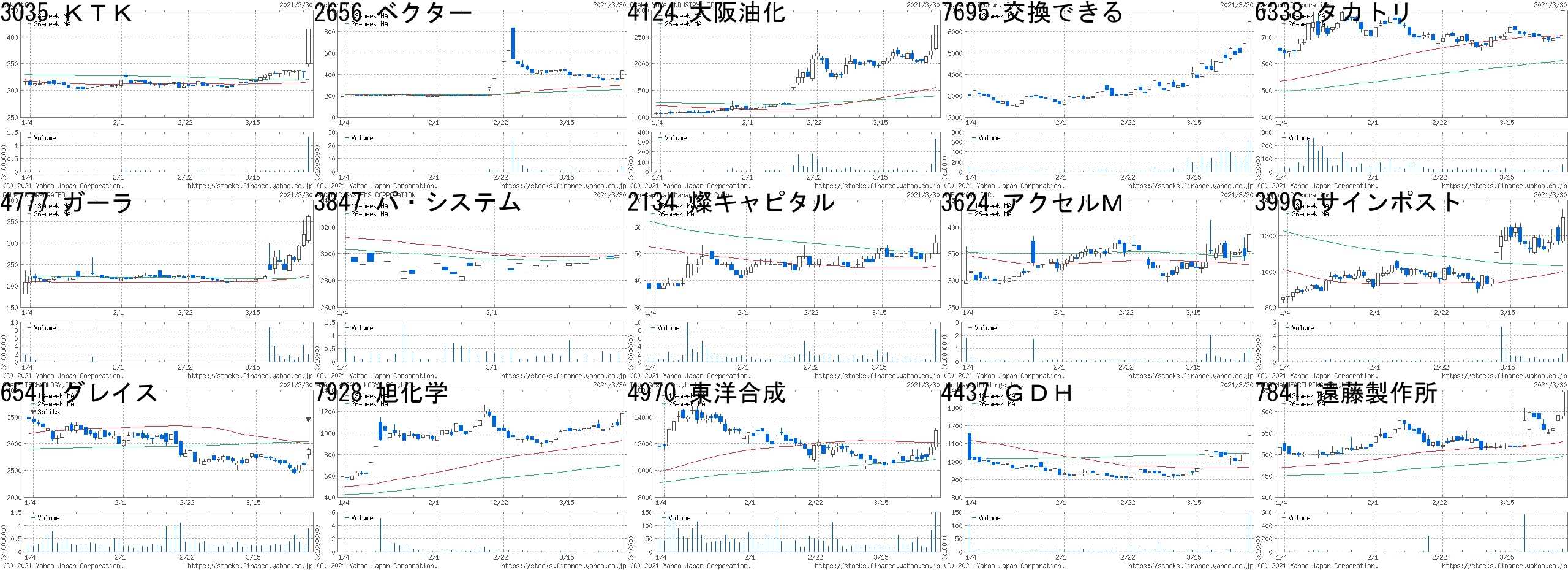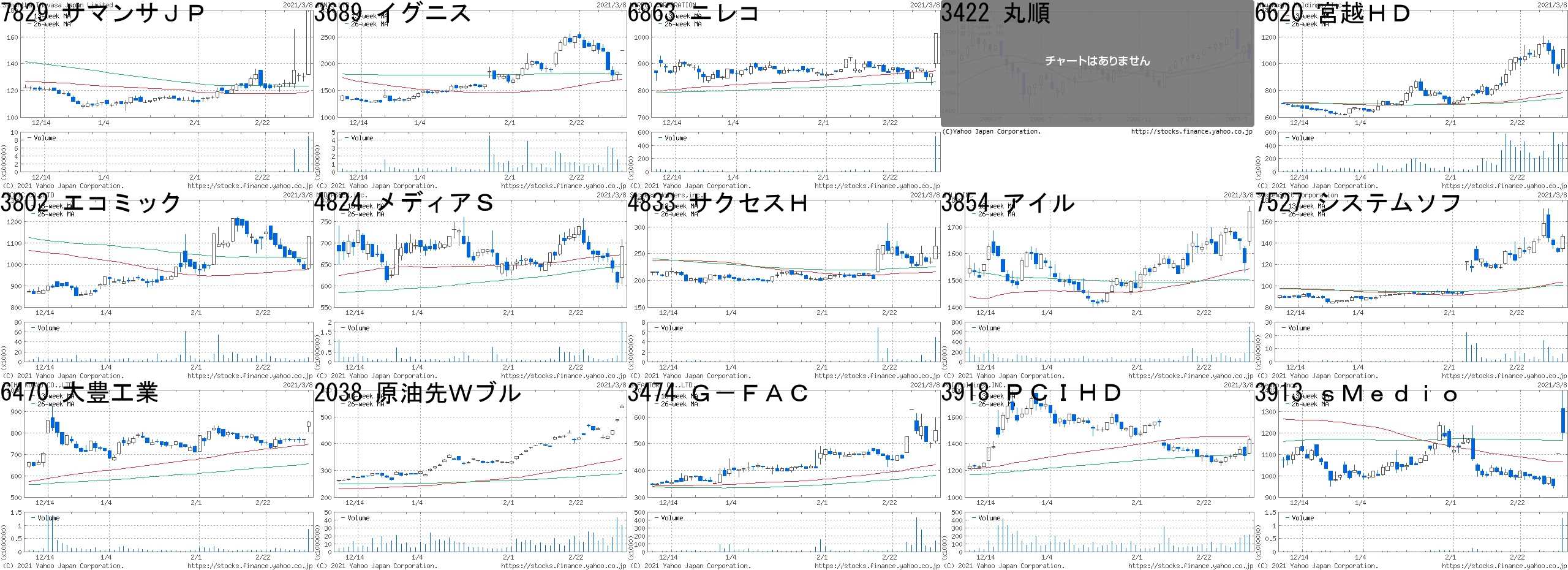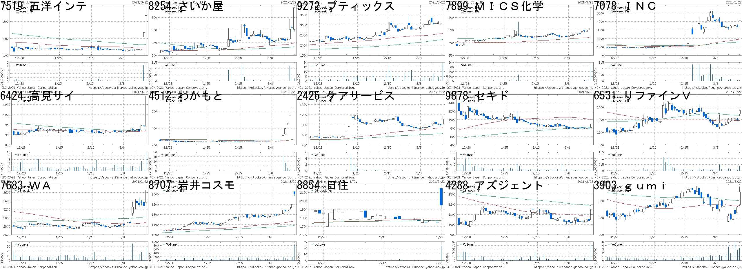 2020年実績から2021年予想への業績予想の伸び率を上位10社ずつランキングしました。伸び率=(2021予想/2020実績-1)*100 %〇売上高銘柄コード 名称 市場 売上高の増減予想4881 (株)ファンペップ マザーズ 6400%4597 ソレイジア・ファーマ(株) マザーズ 252%3856 Abalance(株) 東証2部 252%1783 (株)アジアゲートホールディングス 東証JQS 210%4582 シンバイオ製薬(株) 東証JQG 208%4598 Delta−Fly Pharma(株) マザーズ 200%4488 AI inside(株) マザーズ 189%4586 (株)メドレックス マザーズ 187%8705 岡藤日産証券ホールディングス(株) 東証JQS 174%6721 ウインテスト(株) 東証2部 170%〇営業利益銘柄コード 名称 市場 営業利益の増減予想5476 日本高周波鋼業(株) 東証1部 49900%8622 水戸証券(株) 東証1部 38471%7239 (株)タチエス 東証1部 33233%6966 (株)三井ハイテック 東証1部 13953%2892 日本食品化工(株) 東証2部 11718%6666 リバーエレテック(株) 東証JQS 11100%6176 (株)ブランジスタ マザーズ 8233%6198 (株)キャリア マザーズ 4900%2764 (株)ひらまつ 東証1部 4594%2708 (株)久世 東証JQS 4409%〇経常利益銘柄コード 名称 市場 経常利益の増減予想3978 (株)マクロミル 東証1部 37400%7901 (株)マツモト 東証JQS 36900%3770 (株)ザッパラス 東証1部 17900%8889 APAMAN(株) 東証JQS 12400%9984 ソフトバンクグループ(株) 東証1部 9761%4485 (株)JTOWER マザーズ 6300%7279 (株)ハイレックスコーポレーション 東証2部 4634%6946 日本アビオニクス(株) 東証2部 4300%6810 マクセルホールディングス(株) 東証1部 4111%6067 インパクトホールディングス(株) マザーズ 3471%〇純利益銘柄コード 名称 市場 純利益の増減予想3028 (株)アルペン 東証1部 49547%3315 日本コークス工業(株) 東証1部 10257%6704 岩崎通信機(株) 東証1部 7970%4840 (株)トライアイズ 東証JQG 5400%2789 (株)カルラ 東証JQS 5033%9854 愛眼(株) 東証1部 4983%7814 (株)日本創発グループ 東証JQS 4606%8200 (株)リンガーハット 東証1部 4043%5210 日本山村硝子(株) 東証1部 3609%8123 川辺(株) 東証JQS 3362%〇予想配当利回り銘柄コード 名称 市場 予想配当利回6104 芝浦機械(株) 東証1部 7.1%2914 JT 東証1部 6.7%9434 ソフトバンク(株) 東証1部 5.9%6257 (株)藤商事 東証JQS 5.9%9366 (株)サンリツ 東証1部 5.6%8624 いちよし証券(株) 東証1部 5.4%8996 (株)ハウスフリーダム 福岡Q 5.4%1961 三機工業(株) 東証1部 5.3%1852 (株)淺沼組 東証1部 5.3%7322 (株)三十三フィナンシャルグループ 東証1部 5.3%こういうところを買って、持ち続けるのもいいかもしれません。〇設備投資銘柄コード 名称 市場 設備投資3045 (株)カワサキ 東証2部 2400.0%6093 (株)エスクロー・エージェント・ジャパン 東証1部 2400.0%2919 (株)マルタイ 福証 2165.5%3121 マーチャント・バンカーズ(株) 東証2部 2085.8%7058 共栄セキュリティーサービス(株) 東証JQS 2042.9%4491 コンピューターマネージメント(株) 東証JQS 1900.0%5923 高田機工(株) 東証1部 930.9%7422 東邦レマック(株) 東証JQS 900.0%4935 (株)リベルタ 東証JQS 800.0%4923 コタ(株) 東証1部 708.3%〇研究開発銘柄コード 名称 市場 研究開発9913 日邦産業(株) 東証JQS 2150.0%4728 (株)トーセ 東証1部 900.0%7819 粧美堂(株) 東証1部 900.0%1775 富士古河E&C(株) 東証2部 888.9%6347 (株)プラコー 東証JQS 700.0%3816 (株)大和コンピューター 東証JQS 650.0%7068 (株)フィードフォース マザーズ 650.0%4719 (株)アルファシステムズ 東証1部 542.9%6362 (株)石井鐵工所 東証1部 400.0%7922 三光産業(株) 東証JQS 400.0%設備投資と研究開発費は実績と予想の比較です。これらが伸びているということは、将来の事業拡大を見込んでいるのかもしれません。〇営業キャッシュフロー銘柄コード 名称 市場 営業CF9624 (株)長大 東証1部 54114.3%9967 堺商事(株) 東証2部 33850.0%9969 (株)ショクブン 東証2部 33850.0%3668 (株)コロプラ 東証1部 28220.8%2291 福留ハム(株) 東証2部 12900.0%7090 (株)リグア マザーズ 12100.0%7915 NISSHA(株) 東証1部 8853.0%6362 (株)石井鐵工所 東証1部 8790.9%6879 (株)IMAGICA GROUP 東証1部 5860.7%7172 (株)ジャパンインベストメントアドバイザー 東証1部 5835.0%〇現金等銘柄コード 名称 市場 現金等7513 (株)コジマ 東証1部 1438.7%4013 日通システム(株) マザーズ 1362.1%4151 協和キリン(株) 東証1部 1286.5%2484 (株)出前館 東証JQS 1225.7%4884 クリングルファーマ(株) マザーズ 1166.3%7068 (株)フィードフォース マザーズ 1112.8%3782 (株)ディー・ディー・エス マザーズ 700.9%7071 (株)アンビスホールディングス 東証JQS 637.8%4169 ENECHANGE(株) マザーズ 553.9%4479 (株)マクアケ マザーズ 481.2%営業キャッシュフローと現金等は昨年と今年の比較になります。(まちがえやすい。。)これらが伸びていると会社が儲かっていることが推測されます。参考になれば、幸いです。にほんブログ村