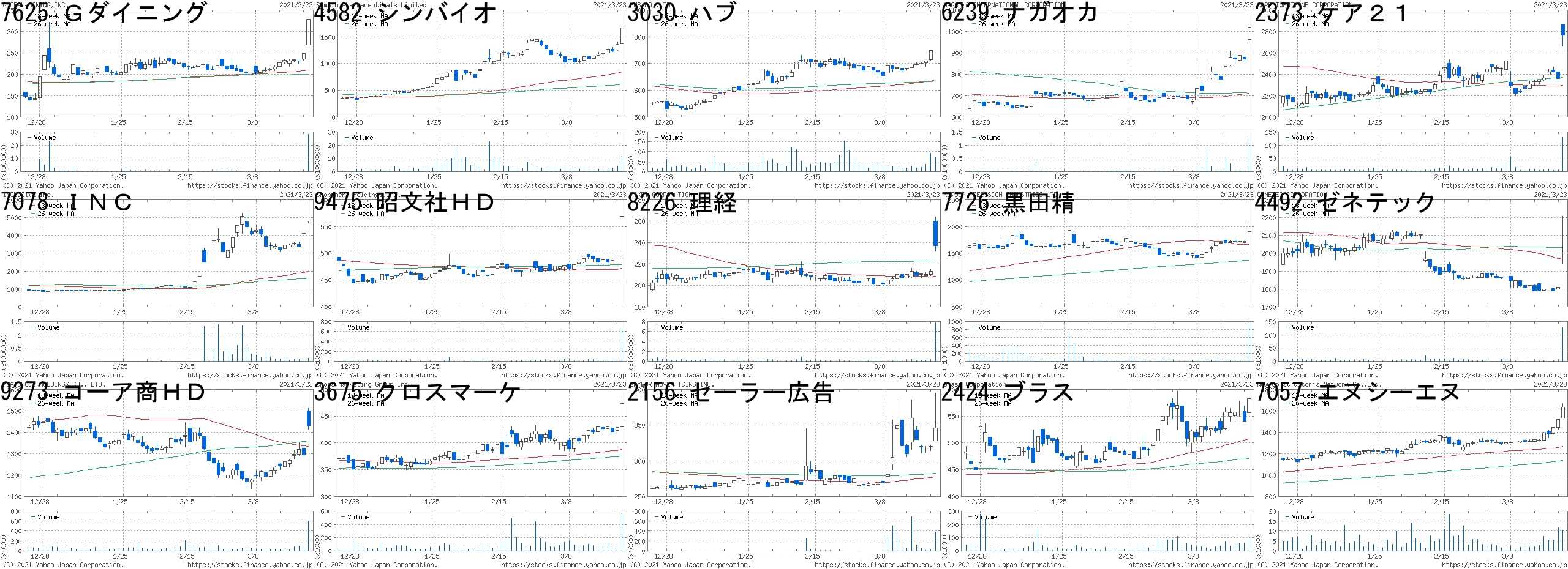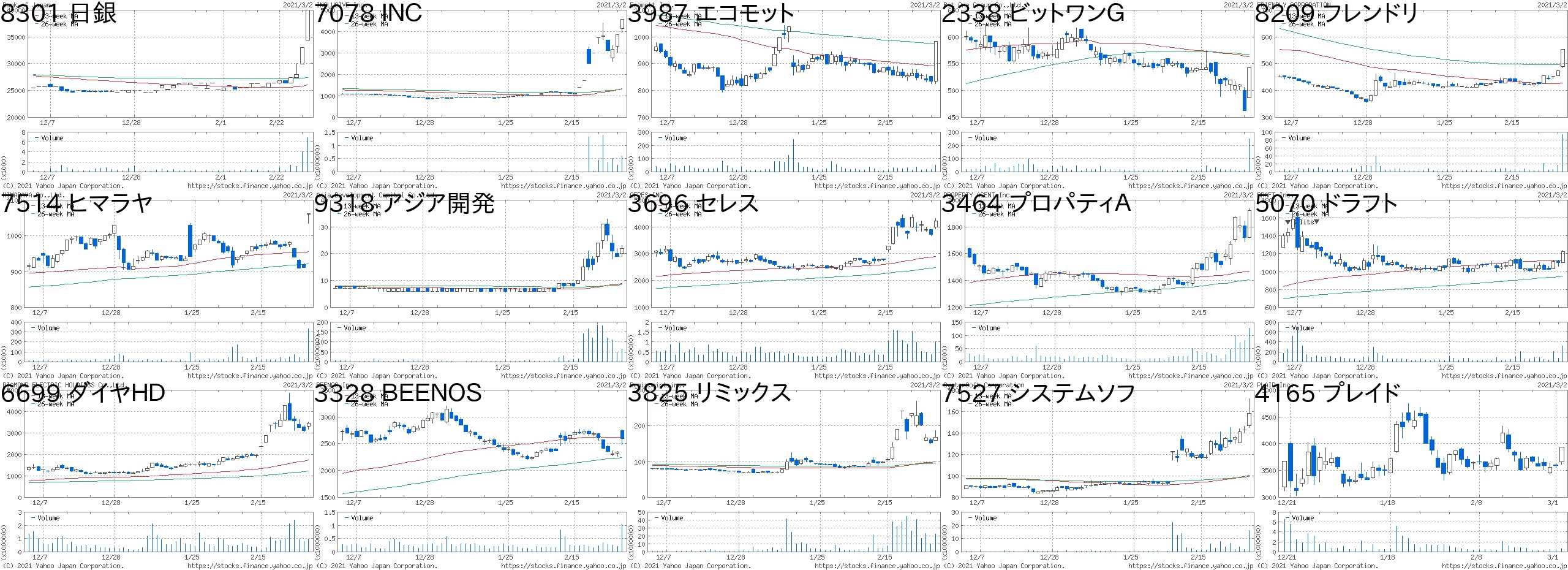 コード 銘柄名 市場 株価 前日比 前日比.1 出来高 PER PBR 利回り8301 日銀 JQ 40000 +7,000 +21.21% 6900 - - -7078 INC 東M 4570 700 +18.09% 601400 - 8.5 -3987 エコモット 東M 984 150 +17.99% 50800 40.2 4.69 -2338 ビットワンG 東2 542 80 +17.32% 250500 - 8.93 -8209 フレンドリ 東2 554 80 +16.88% 94000 - - -7514 ヒマラヤ 東1 1062 150 +16.45% 329600 14.5 0.93 1.889318 アジア開発 東2 22 3 +15.79% 65779500 - 7.77 -3696 セレス 東1 4215 490 +13.15% 1002000 29 7.12 0.713464 プロパティA 東1 1920 197 +11.43% 128000 13.8 2.2 1.355070 ドラフト 東M 1224 125 +11.37% 316900 28.3 5.82 0.336699 ダイヤHD 東1 3460 340 +10.90% 955900 - 4.48 0.143328 BEENOS 東1 2597 249 +10.60% 1045900 - 2.99 -3825 リミックス 東2 168 16 +10.53% 21967400 - 3.06 -7527 システムソフ 東1 158 15 +10.49% 15997600 64.5 3.19 1.274165 プレイド 東M 3940 350 +9.75% 649900 - 41.11 -コード 銘柄名 市場 株価 前日比 前日比.1 出来高 PER PBR 利回り6444 サンデンHD 東1 383 -80 -17.28% 1530000 - 1.47 -4174 アピリッツ JQ 6330 -1270 -16.71% 1628700 76 5.34 -9973 小僧寿し JQ 60 -9 -13.04% 36201900 51.3 23.44 -9271 和心 東M 850 -126 -12.91% 376200 - - -4175 コリー 東M 8450 -1190 -12.34% 6808900 34.4 29.27 -3474 G-FAC 東M 550 -76 -12.14% 433800 509 2.84 -4885 室町ケミカル JQ 1200 -163 -11.96% 1915300 14.7 9 1.253751 日本アジアG 東1 1089 -138 -11.25% 1382400 183 1.42 -3083 シーズメン JQ 359 -45 -11.14% 528900 - 0.95 -3260 エスポア 名C 540 -60 -10.00% 2400 50.2 0.76 -8143 ラピーヌ 東2 381 -42 -9.93% 80300 - 1.3 -6577 ベストワン 東M 2955 -320 -9.77% 29600 - 5.6 -4582 シンバイオ JG 1160 -122 -9.52% 3885800 38.5 10.97 -6993 大黒屋 東2 29 -3 -9.38% 5728600 - 2.58 -4173 WACUL 東M 3250 -335 -9.34% 661600 589 69.77 -にほんブログ村