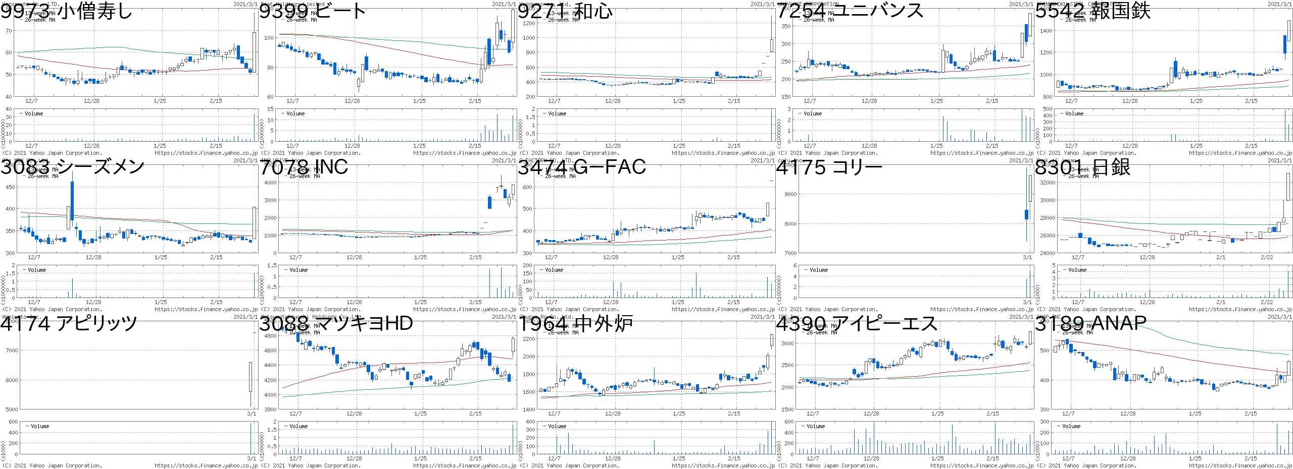 コード 銘柄名 市場 株価 前日比 前日比.1 出来高 PER PBR 利回り9973 小僧寿し JQ 69 18 +35.29% 33279200 59 26.95 -9399 ビート 東2 119 29 +32.22% 11808634 - - -9271 和心 東M 976 225 +29.96% 1839700 - - -7254 ユニバンス 東2 386 80 +26.14% 2231800 - 0.56 0.525542 報国鉄 JQ 1491 300 +25.19% 262500 24.9 1.18 2.013083 シーズメン JQ 404 80 +24.69% 1516500 - 1.07 -7078 INC 東M 3870 700 +22.08% 250100 - 7.2 -3474 G-FAC 東M 626 100 +19.01% 85100 579 3.24 -4175 コリー 東M 9640 +1,500 +18.43% 5022200 39.2 33.4 -8301 日銀 JQ 33000 +5,000 +17.86% 4100 - - -4174 アピリッツ JQ 7600 +1,000 +15.15% 8900 91.3 6.42 -3088 マツキヨHD 東1 4770 590 +14.11% 1799600 20.6 2.02 1.471964 中外炉 東1 2245 233 +11.58% 395900 - 0.86 2.234390 アイピーエス 東1 3255 336 +11.51% 356100 35 8.15 -3189 ANAP JQ 462 47 +11.33% 213900 25.8 1.57 0.87コード 銘柄名 市場 株価 前日比 前日比.1 出来高 PER PBR 利回り6628 オンキヨーH JQ 16 -3 -15.79% 79010700 - - -8918 ランド 東1 11 -2 -15.38% 99248700 - 2.24 -7992 セーラー 東2 212 -28 -11.67% 852400 103 1.51 -9376 ユーラシア JQ 521 -64 -10.94% 64100 - 1 -1686 WTメタル 東E 1663 -202 -10.83% 1000 - - -9318 アジア開発 東2 19 -2 -9.52% 50150900 - 6.71 -2338 ビットワンG 東2 462 -48 -9.41% 12200 - 7.61 -1567 MXリス5 東E 1168 -117 -9.11% 850 - - -6182 ロゼッタ 東M 2399 -226 -8.61% 1857800 - 9.39 -6172 メタップス 東M 1404 -130 -8.47% 868300 - 3.36 -3825 リミックス 東2 152 -14 -8.43% 10208400 - 2.77 -4597 ソレイジア 東M 166 -15 -8.29% 7929200 - 5.72 -6901 沢藤電 東1 2221 -190 -7.88% 465000 957 1.24 -4173 WACUL 東M 3585 -295 -7.60% 711000 650 76.96 -4235 UFHD JQ 1408 -115 -7.55% 21000 24.1 1.37 1.85にほんブログ村