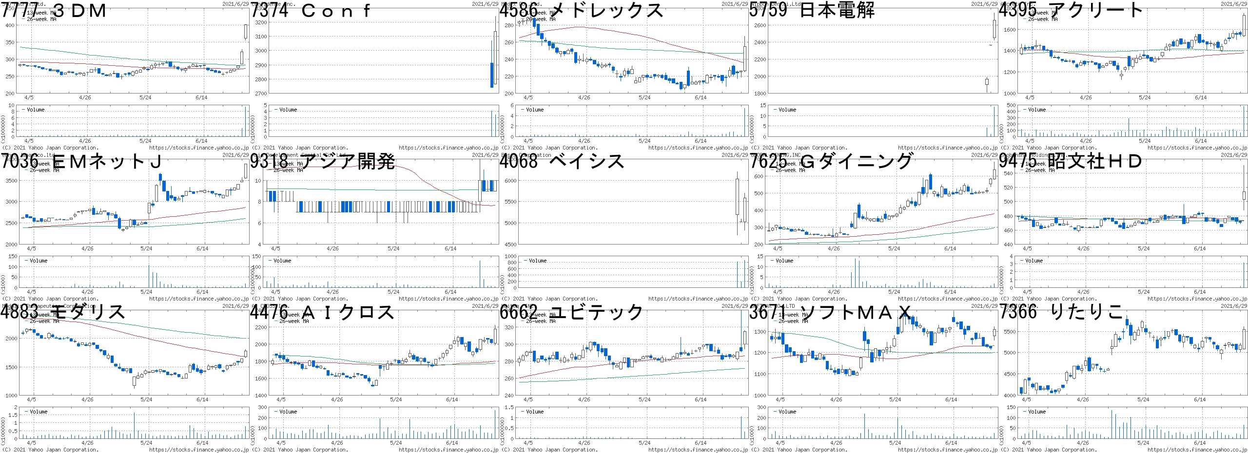 コード,銘柄名,市場,株価,前日比,前日比.1,出来高,PER,PBR,利回り7777,3DM,JG,402,80,+24.84%,9397200,-,14.96,-7374,Conf,東M,3135,395,+14.42%,3440700,28.7,22.44,-4586,メドレックス,東M,255,29,+12.83%,5372200,-,2.66,-5759,日本電解,東M,2657,290,+12.25%,13984000,22.1,3.89,-4395,アクリート,東M,1732,181,+11.67%,478100,38.4,7.41,0.587036,EMネットJ,東M,3890,390,+11.14%,17800,25.5,5.81,1.089318,アジア開発,東2,10,1,+11.11%,4338300,-,4.61,-4068,ベイシス,東M,5580,550,+10.93%,860900,49.3,11.58,-7625,Gダイニング,東2,638,56,+9.62%,1919900,-,2.99,-9475,昭文社HD,東1,514,43,+9.13%,3127700,-,0.7,-4883,モダリス,東M,1779,140,+8.54%,759000,-,7.97,-4476,AIクロス,東M,2177,161,+7.99%,265400,25.9,6.9,-6662,ユビテック,JQ,315,23,+7.88%,327500,-,1.57,0.953671,ソフトMAX,東M,1308,86,+7.04%,48900,23.2,3.26,0.927366,りたりこ,東1,5540,360,+6.95%,64300,82.0,21.66,-コード,銘柄名,市場,株価,前日比,前日比.1,出来高,PER,PBR,利回り1689,WT天然ガス,東E,1,-1,-50.00%,13840100,-,-,-7519,五洋インテ,JQ,30,-30,-50.00%,195700,-,2.55,-6993,大黒屋,東2,92,-31,-25.20%,127393500,22.2,9.21,-8039,築地魚,東2,2426,-500,-17.09%,106200,21.8,0.96,1.443238,セントラル総,東2,388,-49,-11.21%,496000,5.5,0.42,3.094351,山田債権,JQ,840,-93,-9.97%,25900,20.7,1.22,1.193597,自重堂,東2,7060,-780,-9.95%,14500,12.3,0.62,4.251764,工藤建設,東2,2585,-277,-9.68%,15200,10.5,0.68,3.878918,ランド,東1,10,-1,-9.09%,14096900,4.8,3.12,1.003140,イデアインタ,JG,933,-85,-8.35%,202700,36.6,2.91,0.438040,東ソワール,東2,1389,-125,-8.26%,19400,-,0.62,-2370,メディネット,東M,91,-8,-8.08%,13831400,-,3.03,-3474,G-FAC,東M,495,-38,-7.13%,76000,458,2.66,-5355,ルツボ,東2,537,-37,-6.45%,25000,16.4,0.74,1.868097,三愛石,東1,1292,-88,-6.38%,53300,11.9,0.88,2.17にほんブログ村