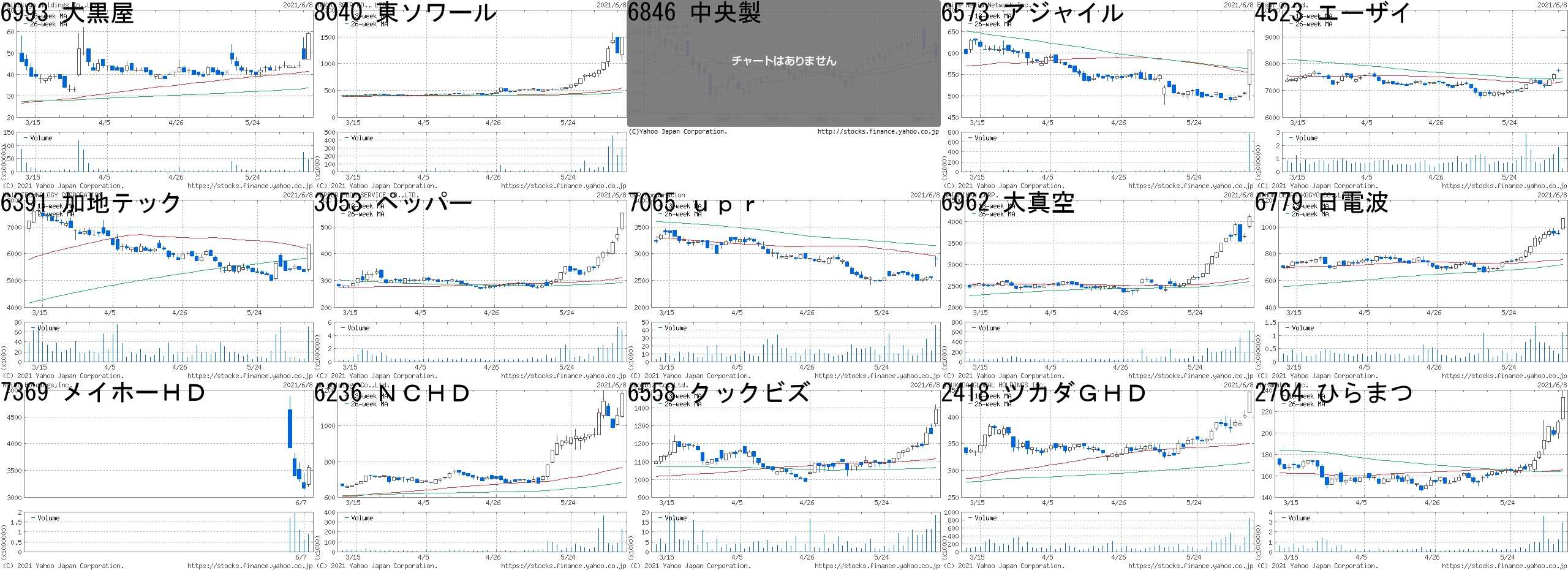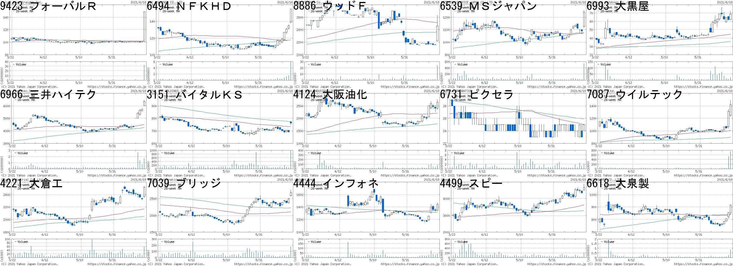 コード,銘柄名,市場,株価,前日比,前日比.1,出来高,PER,PBR,利回り9423,フォーバルR,JQ,149,49,+49.00%,32705000,58.9,8.89,1.346494,NFKHD,JQ,155,20,+14.81%,5889000,-,1.65,-8886,ウッドF,JQ,2461,301,+13.94%,23800,9.7,0.59,2.646539,MSジャパン,東1,1241,151,+13.85%,531700,31.4,3.31,1.216993,大黒屋,東2,69,7,+11.29%,22817400,16.7,6.91,-6966,三井ハイテク,東1,6370,630,+10.98%,1694000,41.6,4.64,0.423151,バイタルKS,東1,762,71,+10.27%,971300,10.5,0.41,3.154124,大阪油化,JQ,2645,245,+10.21%,77000,55.9,1.67,0.956731,ピクセラ,東2,25,2,+8.70%,2237000,178,2.09,-7087,ウイルテック,東2,1420,110,+8.40%,749600,11.5,1.29,2.684221,大倉工,東1,2519,188,+8.07%,58200,10.7,0.6,2.387039,ブリッジ,東M,2695,199,+7.97%,174100,29.5,3.83,-4444,インフォネ,東M,1450,104,+7.73%,39000,44.2,3.15,-4499,スピー,JQ,4670,325,+7.48%,214600,84.0,10.8,-6618,大泉製,東M,914,59,+6.90%,870800,32.6,2.86,0.88コード,銘柄名,市場,株価,前日比,前日比.1,出来高,PER,PBR,利回り7810,クロスフォー,JQ,270,-46,-14.56%,484600,-,2.51,-8518,アジア投資,東1,271,-42,-13.42%,991700,-,0.65,-2370,メディネット,東M,100,-15,-13.04%,117307300,-,3.33,-9318,アジア開発,東2,7,-1,-12.50%,2759500,-,3.23,-4366,ダイトーケミ,東2,921,-115,-11.10%,278900,15.2,0.78,1.094199,ワンプラ,東M,4170,-510,-10.90%,985300,6.4,4.22,-3796,いい生活,東2,458,-50,-9.84%,190400,46.5,1.93,1.096063,EAJ,JQ,1638,-170,-9.40%,218300,-,4.48,-4888,ステラファ,東M,608,-60,-8.98%,4996700,-,75.72,-6982,リード,東2,746,-69,-8.47%,121100,42.7,0.73,0.677214,GMB,東1,1019,-94,-8.45%,37700,13.4,0.27,1.966490,ピラー,東1,2179,-199,-8.37%,324900,12.3,1.12,2.756846,中央製,名2,1260,-115,-8.36%,4200,16.2,0.43,1.594666,パーク24,東1,2111,-185,-8.06%,2673800,-,16.43,-1543,純パラ信託,東E,84600,-7400,-8.04%,779,-,-,-にほんブログ村