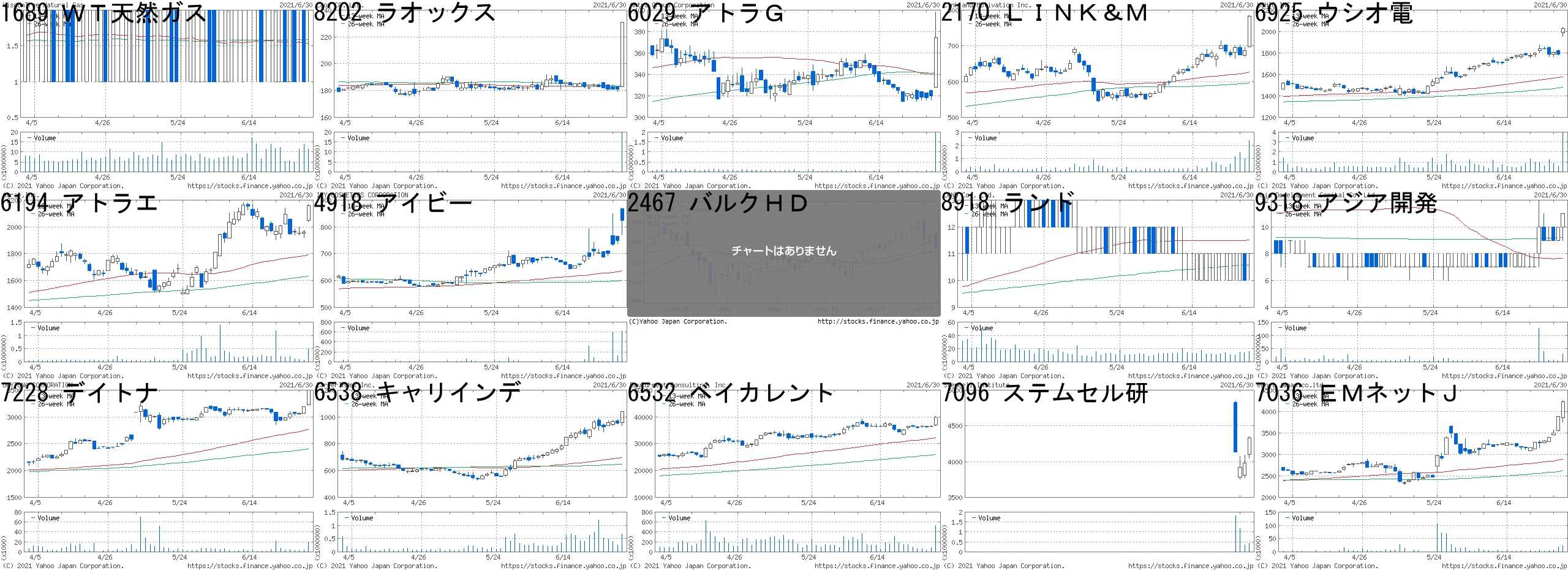 コード,銘柄名,市場,株価,前日比,前日比.1,出来高,PER,PBR,利回り1689,WT天然ガス,東E,2,+1,+100.00%,11367000,-,-,-8202,ラオックス,東2,231,+50,+27.62%,19655500,-,0.81,-6029,アトラG,東1,374,+54,+16.88%,1982700,31.2,2.27,0.942170,LINK&M,東1,782,+95,+13.83%,2344700,144,21.57,0.926925,ウシオ電,東1,2030,+240,+13.41%,3932500,30.6,1.16,1.286194,アトラエ,東1,2161,+201,+10.26%,494600,174,12.04,-4918,アイビー,JQ,825,+76,+10.15%,613300,8.1,2.08,-2467,バルクHD,名C,283,+26,+10.12%,49700,393,24.25,-8918,ランド,東1,11,+1,+10.00%,16093600,5.3,3.43,0.919318,アジア開発,東2,11,+1,+10.00%,29525600,-,4.12,-7228,デイトナ,JQ,3495,+305,+9.56%,20000,7.9,1.91,1.206538,キャリインデ,東1,1040,+89,+9.36%,675100,57.9,7.24,0.246532,ベイカレント,東1,39900,"+3,350",+9.17%,531200,53.1,20.33,0.487096,ステムセル研,東M,4335,+355,+8.92%,438500,163,16.80,-7036,EMネットJ,東M,4230,+340,+8.74%,22600,27.8,6.32,0.99コード,銘柄名,市場,株価,前日比,前日比.1,出来高,PER,PBR,利回り7519,五洋インテ,JQ,23,-7,-23.33%,14523700,-,-,-6993,大黒屋,東2,80,-12,-13.04%,60039600,19.3,8.01,-7699,オムニプラス,東M,1285,-155,-10.76%,948000,-,-,-8039,築地魚,東2,2185,-241,-9.93%,108700,19.6,0.86,1.603035,KTK,JQ,479,-44,-8.41%,490900,10.5,0.75,2.307649,スギHD,東1,8100,-740,-8.37%,685100,22.8,2.47,0.993347,トラスト,東2,239,-21,-8.08%,786600,15.2,0.90,1.674364,マナック,東2,897,-78,-8.00%,190200,12.6,0.72,1.679973,小僧寿し,JQ,59,-5,-7.81%,9391900,57.3,23.41,-2183,リニカル,東1,843,-69,-7.57%,142300,-,3.33,1.667068,フィード,東M,1017,-81,-7.38%,1050000,39.0,11.14,-2035,日経VI,東EN,178,-14,-7.29%,2133693,-,-,-7066,ピアズ,東M,1822,-132,-6.76%,3000,59.8,1.87,-5357,ヨータイ,東1,1258,-87,-6.47%,90500,12.3,0.94,2.544069,ブルーミーム,東M,3115,-215,-6.46%,1239300,67.4,19.06,-にほんブログ村