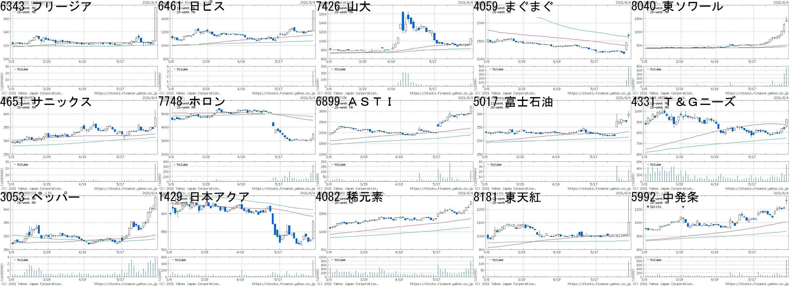 コード,銘柄名,市場,株価,前日比,前日比.1,出来高,PER,PBR,利回り6343,フリージア,東2,177,50,+39.37%,22418400,-,1.03,-6461,日ピス,東1,1517,300,+24.65%,3025600,9.0,0.41,3.967426,山大,JQ,1053,150,+16.61%,37900,78.0,0.34,2.374059,まぐまぐ,JQ,1650,199,+13.71%,475900,50.8,3.41,0.428040,東ソワール,東2,1445,170,+13.33%,455300,-,0.64,-4651,サニックス,東1,385,40,+11.59%,26510800,12.0,2.28,-7748,ホロン,JQ,3480,360,+11.54%,329700,42.4,2.59,0.576899,ASTI,東2,3200,326,+11.34%,107000,7.7,0.56,-5017,富士石油,東1,300,29,+10.70%,23133200,13.6,0.48,-4331,T&Gニーズ,東1,924,86,+10.26%,506200,239,1.66,-3053,ペッパー,東1,443,40,+9.93%,2802900,305,12.4,-1429,日本アクア,東1,578,51,+9.68%,506200,14.3,2.63,3.464082,稀元素,東1,1837,161,+9.61%,806500,21.2,1.48,1.098181,東天紅,東1,1103,95,+9.42%,116100,-,0.35,-5992,中発条,東1,1327,101,+8.24%,853400,13.2,0.55,2.41コード,銘柄名,市場,株価,前日比,前日比.1,出来高,PER,PBR,利回り1689,WT天然ガス,東E,1,-1,-50.00%,7265800,-,-,-6962,大真空,東1,3540,-385,-9.81%,492200,17.9,1.02,-7625,Gダイニング,東2,523,-55,-9.52%,2496600,-,2.45,-3647,ジー・スリー,東2,659,-68,-9.35%,2597600,69.4,4.85,-6063,EAJ,JQ,1632,-164,-9.13%,298000,-,4.46,-2479,ジェイテック,JG,243,-24,-8.99%,1638600,319,2.16,0.416778,アルチザ,東2,1619,-147,-8.32%,1492100,27.9,2.34,1.052404,鉄人化計画,東2,300,-27,-8.26%,1374200,-,171,-3083,シーズメン,JQ,369,-33,-8.21%,85900,7.6,1.15,-7601,ポプラ,東1,329,-29,-8.10%,907100,-,13.61,-6577,ベストワン,東M,3150,-275,-8.03%,25600,-,6.37,-6580,ライトアップ,東M,2609,-221,-7.81%,321300,26.8,6.65,-3900,クラウドW,東M,1599,-135,-7.79%,162100,-,7.21,-4449,ギフティ,東1,3080,-260,-7.78%,716800,118,16.27,-4934,Pアンチエイ,東M,15310,-1140,-6.93%,854700,49.3,23.47,-にほんブログ村