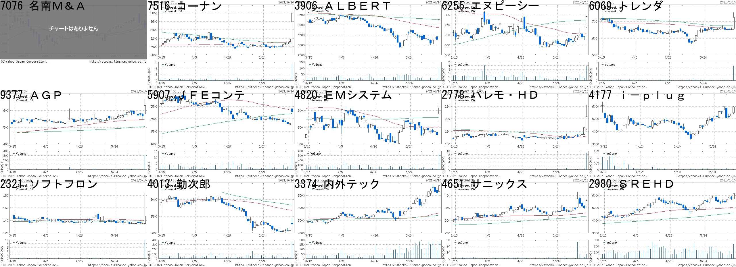 コード,銘柄名,市場,株価,前日比,前日比.1,出来高,PER,PBR,利回り7076,名南M&A,名2,1573,+300,+23.57%,34700,31.0,4.74,0.327516,コーナン,東1,3810,+635,+20.00%,2571200,7.6,0.93,1.683906,ALBERT,東M,6270,"+1,000",+18.98%,103100,104,8.02,-6255,エヌピーシー,東M,791,+100,+14.47%,3753500,52.8,2.4,0.256069,トレンダ,東M,725,+72,+11.03%,2366900,19.1,2.08,2.219377,AGP,JQ,629,+61,+10.74%,316700,-,0.94,-5907,JFEコンテ,東2,5290,+480,+9.98%,11000,-,0.52,-4820,EMシステム,東1,908,+81,+9.79%,351300,47.6,3.72,1.102778,パレモ・HD,東2,204,+18,+9.68%,8932600,24.3,1.37,-4177,i-plug,東M,5930,+520,+9.61%,53600,110,19.89,-2321,ソフトフロン,JG,147,+12,+8.89%,9938200,-,19.86,-4013,勤次郎,東M,2266,+173,+8.27%,349500,41.1,2.42,0.753374,内外テック,JQ,3890,+290,+8.06%,174200,14.6,1.67,1.724651,サニックス,東1,379,+28,+7.98%,6749900,11.8,2.24,-2980,SREHD,東1,6150,+440,+7.71%,229900,114,12.17,-コード,銘柄名,市場,株価,前日比,前日比.1,出来高,PER,PBR,利回り1689,WT天然ガス,東E,1,-1,-50.00%,6932800,-,-,-3053,ペッパー,東1,455,-57,-11.13%,6778400,313,12.73,-7426,山大,JQ,1348,-164,-10.85%,133100,99.9,0.43,1.852762,三光Mフーズ,東2,306,-35,-10.26%,308900,-,9.51,-4888,ステラファ,東M,538,-55,-9.27%,3471800,-,67.00,-6663,太洋工業,JQ,503,-51,-9.21%,635500,56.0,1.20,0.606198,Career,東M,567,-56,-8.99%,685300,480,4.12,-8040,東ソワール,東2,1500,-140,-8.54%,185000,-,0.67,-7369,メイホーHD,東M,3115,-265,-7.84%,246900,18.3,4.74,-6696,ピースリー,東M,733,-62,-7.80%,30600,904,4.39,-6558,クックビズ,東M,1430,-119,-7.68%,38400,-,4.95,-7625,Gダイニング,東2,495,-41,-7.65%,451700,-,2.32,-9812,テーオーHD,JQ,402,-33,-7.59%,116200,-,-,-4582,シンバイオ,JG,2118,-173,-7.55%,6631900,70.7,21.13,-2418,ツカダGHD,東1,429,-34,-7.34%,1325600,53.8,0.86,-にほんブログ村