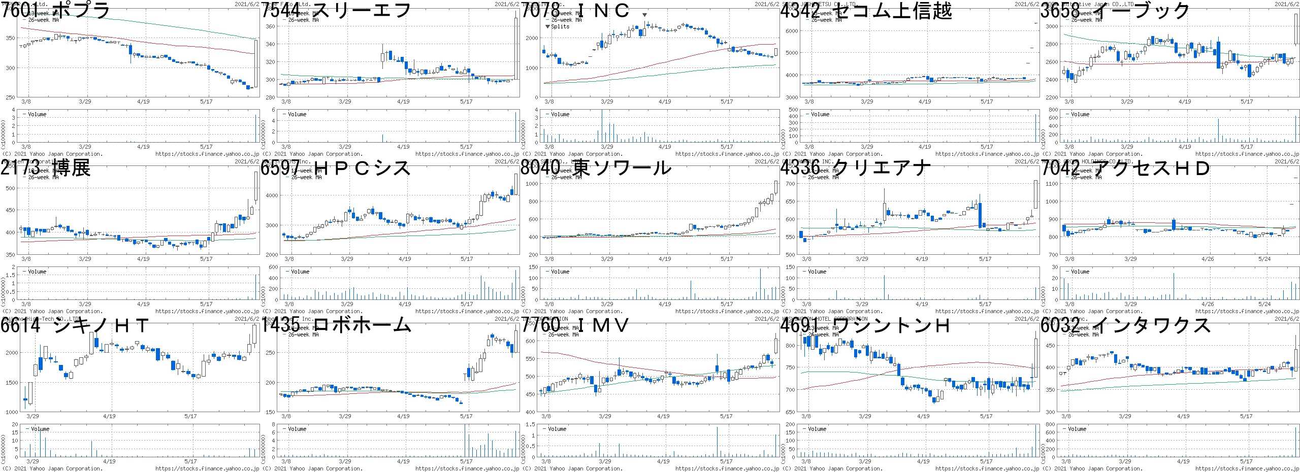 コード,銘柄名,市場,株価,前日比,前日比.1,出来高,PER,PBR,利回り7601,ポプラ,東1,346,+80,+30.08%,3299300,-,14.31,-7544,スリーエフ,東2,369,+69,+23.00%,5468600,-,0.72,2.717078,INC,東M,1654,+300,+22.16%,79900,1173,8.62,-4342,セコム上信越,東2,6330,"+1,110",+21.26%,423200,25.7,1.7,-3658,イーブック,東1,3135,+500,+18.98%,644400,19.6,3.98,-2173,博展,JG,536,+80,+17.54%,1518200,7.0,4.31,-6597,HPCシス,東M,4720,+700,+17.41%,531100,47.0,11.13,-8040,東ソワール,東2,1028,+150,+17.08%,57700,-,0.46,-4336,クリエアナ,JQ,709,+100,+16.42%,54400,15.2,1.37,1.417042,アクセスHD,JQ,1132,+150,+15.27%,14400,-,2.2,-6614,シキノHT,JQ,2462,+322,+15.05%,4537800,63.5,8.7,-1435,ロボホーム,東1,287,+37,+14.80%,6249900,92.9,3.52,-7760,IMV,JQ,606,+70,+13.06%,1005000,15.2,1.34,1.404691,ワシントンH,東2,815,+89,+12.26%,193600,-,1.49,-6032,インタワクス,東1,441,+47,+11.93%,717300,16.6,2.25,3.40コード,銘柄名,市場,株価,前日比,前日比.1,出来高,PER,PBR,利回り9318,アジア開発,東2,7,-1,-12.50%,3291900,-,3.23,-3647,ジー・スリー,東2,696,-79,-10.19%,4410000,73.3,5.12,-3678,メディアドゥ,東1,4925,-535,-9.80%,559600,48.8,6.45,-4978,リプロセル,JG,367,-39,-9.61%,3908200,-,4.88,-3189,ANAP,JQ,500,-48,-8.76%,1498400,-,2.21,-7859,アルメディオ,東2,235,-21,-8.20%,2731300,-,1.39,-4548,生化学,東1,1067,-90,-7.78%,391200,16.5,0.95,2.813891,高度紙,JQ,3540,-270,-7.09%,641300,18.1,2.29,0.627638,NEWART,JQ,1134,-80,-6.59%,122100,10.8,2.03,6.173962,チェンジ,東1,2744,-183,-6.25%,1691600,57.6,6.8,-7363,ベビカレ,東M,7980,-530,-6.23%,118800,68.2,10.1,-4435,カオナビ,東M,3650,-240,-6.17%,79500,1607,43.45,-2479,ジェイテック,JG,262,-17,-6.09%,2028200,344,2.33,0.383787,テクノマセマ,東2,943,-57,-5.70%,69300,-,1.04,-3154,メディアス,東1,1012,-61,-5.68%,137500,13.0,1.4,2.08にほんブログ村