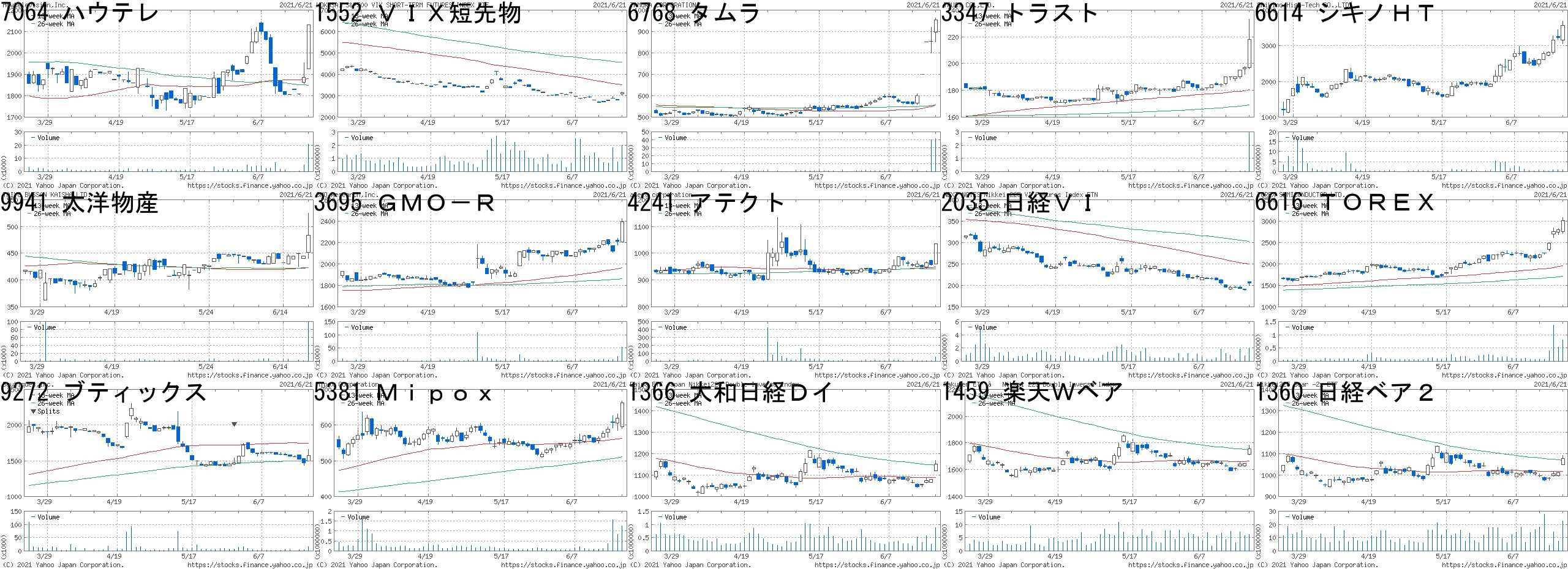 コード,銘柄名,市場,株価,前日比,前日比.1,出来高,PER,PBR,利回り7064,ハウテレ,東M,2130,244,+12.94%,20700,1374,10.68,-1552,VIX短先物,東E,3140,338,+12.06%,1970822,-,-,-6768,タムラ,東1,955,102,+11.96%,41250300,35.6,1.64,1.053347,トラスト,東2,218,21,+10.66%,2797700,13.9,0.82,1.836614,シキノHT,JQ,3575,340,+10.51%,894600,92.2,12.63,-9941,太洋物産,JQ,484,39,+8.76%,98000,91.8,-,-3695,GMO-R,東M,2397,187,+8.46%,52800,20.6,2.60,2.434241,アテクト,JQ,1036,78,+8.14%,54900,30.5,2.68,0.972035,日経VI,東EN,205,15,+7.89%,1954824,-,-,-6616,TOREX,東1,3010,215,+7.69%,806500,23.5,1.66,1.339272,ブティックス,東M,1574,104,+7.07%,15800,110,8.43,-5381,Mipox,JQ,663,43,+6.94%,1253500,31.5,1.80,-1366,大和日経Dイ,東E,1152,73,+6.77%,869687,-,-,-1459,楽天Wベア,東E,1758,111,+6.74%,6191841,-,-,-1360,日経ベア2,東E,1078,68,+6.73%,22570210,-,-,-コード,銘柄名,市場,株価,前日比,前日比.1,出来高,PER,PBR,利回り7519,五洋インテ,JQ,99,-31,-23.85%,2226800,-,8.43,-9423,フォーバルR,JQ,128,-21,-14.09%,15579300,50.6,7.64,1.567623,サンオータス,JQ,436,-69,-13.66%,243500,13.7,0.5,2.296063,EAJ,JQ,1489,-149,-9.10%,243200,-,4.07,-6946,日本アビオ,東2,4325,-410,-8.66%,161000,9.4,1.19,-5702,大紀ア,東1,1154,-107,-8.49%,575900,6.0,1.08,3.126846,中央製,名2,1159,-101,-8.02%,2200,14.9,0.39,1.737014,名村造,東1,172,-15,-8.02%,2587500,-,0.3,-7057,エヌシーエヌ,JQ,1198,-97,-7.49%,16300,19.3,1.98,2.345817,JMACS,東2,533,-43,-7.47%,115500,10.6,0.56,1.884199,ワンプラ,東M,3860,-310,-7.43%,648500,5.9,3.9,-8365,富山銀,東1,2380,-191,-7.43%,12300,17.3,0.39,2.107213,レシップHD,東1,547,-43,-7.29%,70800,34.9,1.42,0.915337,ダントーHD,東1,247,-19,-7.14%,633400,-,0.86,-7578,ニチリョク,JQ,200,-15,-6.98%,315900,11.7,0.65,1.00にほんブログ村