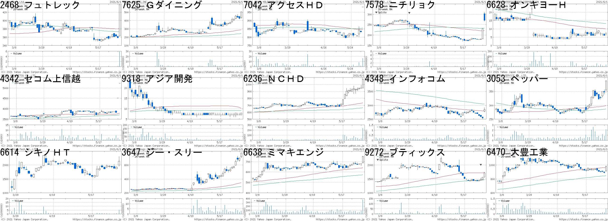 コード,銘柄名,市場,株価,前日比,前日比.1,出来高,PER,PBR,利回り2468,フュトレック,東2,438,80,+22.35%,5797100,32.8,1.72,0.917625,Gダイニング,東2,505,80,+18.82%,2648000,-,2.36,-7042,アクセスHD,JQ,982,150,+18.03%,16100,-,1.91,-7578,ニチリョク,JQ,271,40,+17.32%,6636000,15.8,0.89,0.746628,オンキヨーH,JQ,7,1,+16.67%,35762800,-,-,-4342,セコム上信越,東2,5220,700,+15.49%,800,21.2,1.40,-9318,アジア開発,東2,8,1,+14.29%,3769800,-,3.69,-6236,NCHD,東1,1073,124,+13.07%,233700,13.7,0.74,1.404348,インフォコム,東1,2848,307,+12.08%,1274600,21.4,3.76,1.403053,ペッパー,東1,388,40,+11.49%,2117000,267,10.86,-6614,シキノHT,JQ,2140,215,+11.17%,5223900,55.2,7.56,-3647,ジー・スリー,東2,775,75,+10.71%,3050600,81.7,5.70,-6638,ミマキエンジ,東1,750,71,+10.46%,372700,18.9,1.37,2.009272,ブティックス,東M,1721,158,+10.11%,16200,121,9.22,-6470,大豊工業,東1,982,90,+10.09%,540900,10.2,0.45,-コード,銘柄名,市場,株価,前日比,前日比.1,出来高,PER,PBR,利回り8746,第一商品,JQ,240,-38,-13.67%,2740400,-,0.84,-3326,ランシステム,JQ,694,-109,-13.57%,874700,-,14.80,-4192,スパイダー,東M,2213,-243,-9.89%,519400,-,19.97,-4934,Pアンチエイ,東M,15170,-1630,-9.70%,1155900,48.8,23.26,-7959,オリバー,東1,2865,-290,-9.19%,37200,22.6,1.01,1.503787,テクノマセマ,東2,1000,-100,-9.09%,251600,-,1.11,-8918,ランド,東1,11,-1,-8.33%,8521300,5.3,3.45,0.912798,Ysテーブル,東2,1606,-144,-8.23%,25500,8.3,-,-4556,カイノス,JQ,1387,-120,-7.96%,1286500,14.2,1.22,1.086198,Career,東M,567,-45,-7.35%,676900,480,4.12,-4696,ワタベ,東1,180,-14,-7.22%,523800,-,-,-2929,ファーマF,東1,2956,-199,-6.31%,4660700,61.2,19.89,0.519468,カドカワ,東1,4080,-275,-6.31%,425800,31.9,2.07,1.232673,夢みつけ隊,JQ,181,-12,-6.22%,3411900,-,0.86,-9068,丸全運,東1,3315,-210,-5.96%,43400,9.1,0.68,2.26にほんブログ村