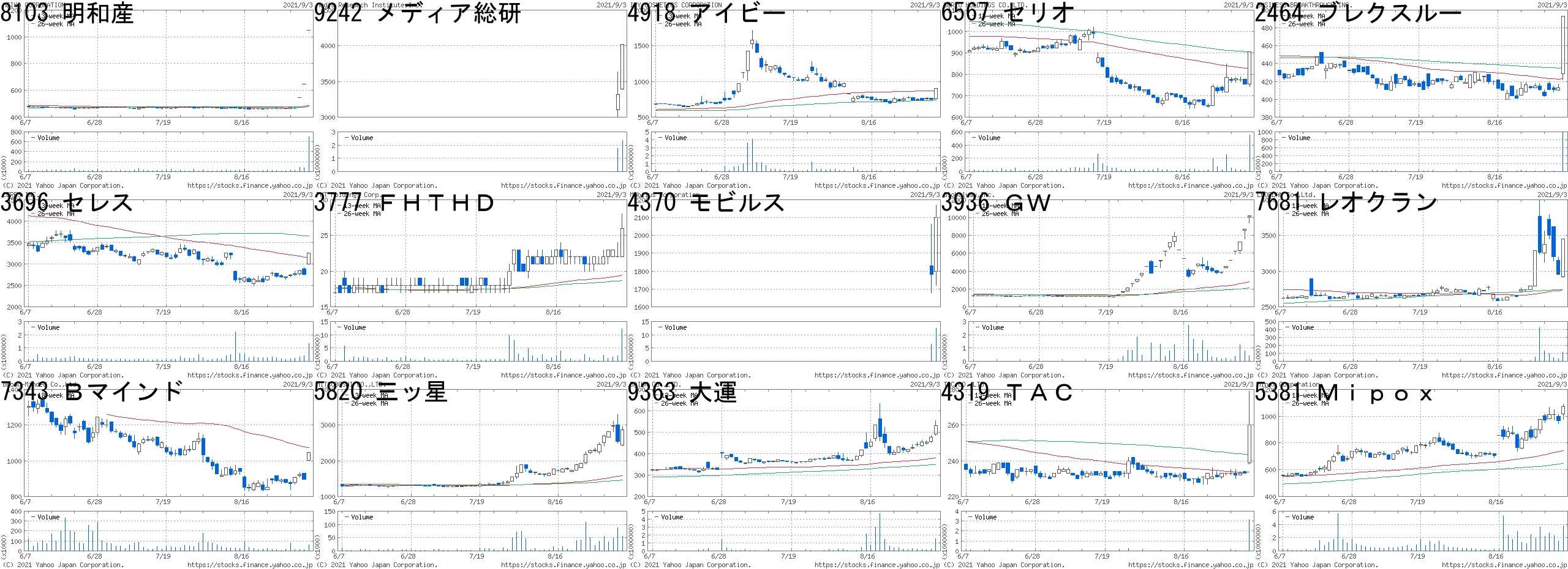 コード,銘柄名,市場,株価,前日比,前日比.1,出来高,PER,PBR,利回り8103,明和産,東1,1047,+400,+61.82%,696700,21.9,1.27,10.989242,メディア総研,東M,4020,+700,+21.08%,2334300,36.5,7.69,-4918,アイビー,JQ,902,+150,+19.95%,535200,9.8,2.77,-6567,セリオ,東M,905,+150,+19.87%,558300,32.6,2.95,0.772464,ブレクスルー,東1,493,+80,+19.37%,985300,56.5,1.66,2.233696,セレス,東1,3250,+500,+18.18%,1331900,11.9,4.38,1.113777,FHTHD,JG,26,+4,+18.18%,12128700,-,4.57,-4370,モビルス,東M,2099,+319,+17.92%,12571100,77.9,8.41,-3936,GW,東M,10240,"+1,500",+17.16%,414800,97.1,46.3,-7681,レオクラン,東2,3450,+500,+16.95%,115800,18.2,1.3,1.167343,Bマインド,東M,1047,+150,+16.72%,63700,20.8,1.89,1.155820,三ッ星,JQ,2865,+325,+12.80%,55600,13.1,0.55,1.759363,大運,東2,532,+56,+11.76%,1506900,32.4,1.11,1.134319,TAC,東1,260,+27,+11.59%,3158400,12.7,0.78,2.315381,Mipox,JQ,1070,+102,+10.54%,3742500,25.4,2.68,-コード,銘柄名,市場,株価,前日比,前日比.1,出来高,PER,PBR,利回り7379,サーキュ,東M,3730,-700,-15.80%,850700,104,93.86,-2934,ジェイフロ,東M,3805,-485,-11.31%,1359200,33.4,13.79,-4575,CANBAS,東M,318,-36,-10.17%,406000,-,7.97,-6532,ベイカレント,東1,52800,-5800,-9.90%,1118000,70.3,26.29,0.363323,レカム,JQ,94,-10,-9.62%,8580400,-,1.67,2.139360,鈴与シンワ,東2,2340,-221,-8.63%,219300,27.5,2.8,1.073750,フラクタル,東2,1352,-126,-8.53%,139000,-,3.63,-2150,ケアネット,東M,5650,-510,-8.28%,352300,41.9,15.0,0.147082,ジモティー,東M,2800,-245,-8.05%,252500,54.3,17.9,-2776,新都HD,JQ,71,-6,-7.79%,1363500,44.9,2.22,-2780,コメ兵HD,東2,1607,-135,-7.75%,333300,12.0,0.95,1.493825,リミックス,東2,194,-16,-7.62%,11555000,9.1,3.79,-9073,京極運,JQ,1056,-84,-7.37%,43900,26.2,0.87,0.764395,アクリート,東M,2185,-165,-7.02%,399200,48.5,8.84,0.464165,プレイド,東M,2623,-189,-6.72%,745200,-,20.26,-にほんブログ村