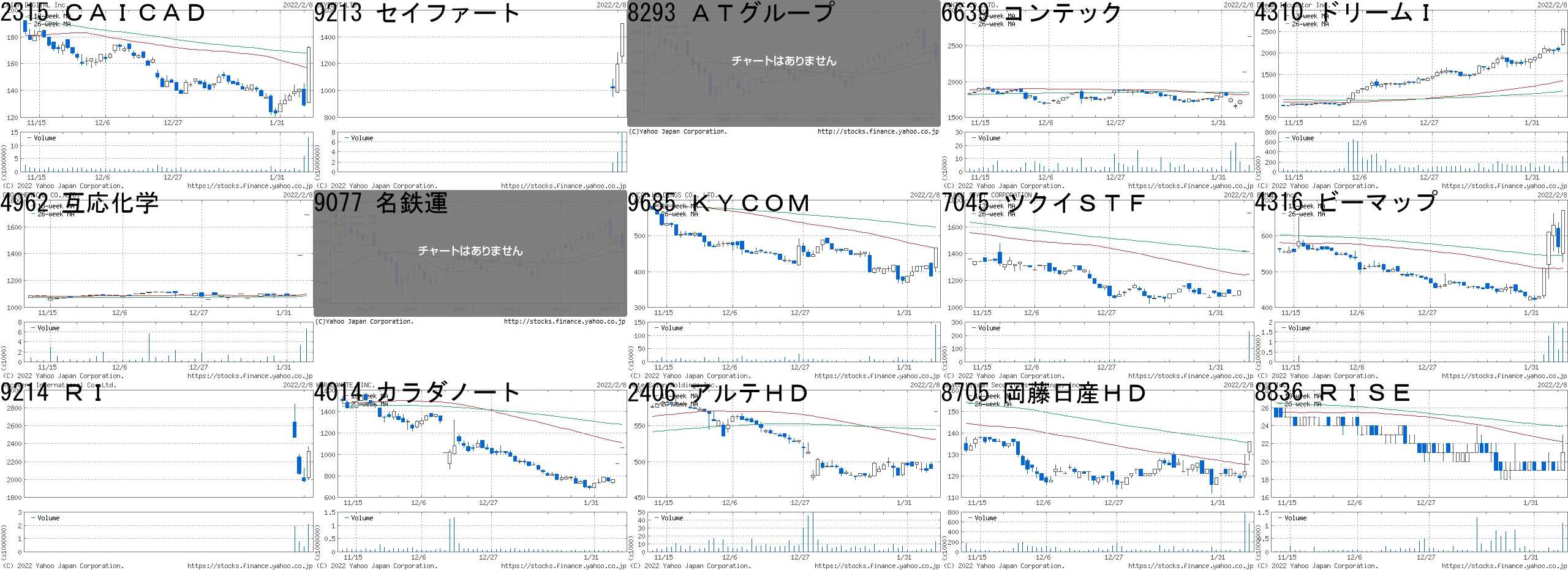 コード,銘柄名,市場,株価,前日比,前日比.1,出来高,PER,PBR,利回り2315,CAICAD,JQ,172,43,+33.33%,12872200,41.6,1.77,-9213,セイファート,JQ,1499,300,+25.02%,7743000,13.9,4.20,1.338293,ATグループ,名2,2506,500,+24.93%,2500,11.1,0.34,0.806639,コンテック,東2,2635,500,+23.42%,4900,13.4,1.27,0.764310,ドリームI,東1,2555,481,+23.19%,307600,-,2.60,-4962,互応化学,東2,1690,300,+21.58%,6600,30.8,0.75,-9077,名鉄運,名2,2820,500,+21.55%,-,7.3,0.45,-9685,KYCOM,JQ,467,80,+20.67%,141400,9.1,0.80,-7045,ツクイSTF,JQ,1702,280,+19.69%,230600,195,1.36,0.884316,ビーマップ,JG,670,100,+17.54%,1677200,54.0,3.60,-9214,RI,東M,2314,332,+16.75%,2060000,32.7,19.68,-4014,カラダノート,東M,1064,150,+16.41%,13700,37.5,6.81,-2406,アルテHD,JQ,570,80,+16.33%,13300,-,1.93,-8705,岡藤日産HD,JQ,136,14,+11.48%,564200,-,0.61,3.688836,RISE,JQ,21,2,+10.53%,1084700,-,-,-コード,銘柄名,市場,株価,前日比,前日比.1,出来高,PER,PBR,利回り9176,佐渡汽,JQ,72,-50,-40.98%,43300,-,-,-6541,グレイス,東1,37,-11,-22.92%,25457800,1.3,0.34,-7089,フォースタ,東M,2736,-679,-19.88%,265000,21.2,6.94,-6548,旅工房,東M,650,-150,-18.75%,13000,-,6.05,-5698,エンビプロ,東1,1400,-270,-16.17%,629300,10.6,1.49,2.363186,ネクステージ,東1,2498,-434,-14.80%,2940300,16.0,4.61,0.843936,GW,東M,289,-49,-14.50%,4581500,34.8,23.53,-4427,エデュラボ,東1,661,-90,-11.98%,237600,5.3,0.59,-6195,ホープ,東M,170,-22,-11.46%,457900,-,-,-6298,ワイエイシイ,東1,1100,-132,-10.71%,1502900,9.1,0.68,3.274631,DIC,東1,2695,-302,-10.08%,1274300,63.8,0.74,3.718918,ランド,東1,9,-1,-10.00%,13604300,4.3,2.04,1.113632,グリー,東1,765,-82,-9.68%,8648100,-,1.53,-4326,インテージH,東1,1684,-177,-9.51%,214100,18.5,2.25,2.088114,デサント,東1,3130,-325,-9.41%,437400,38.1,2.84,0.64にほんブログ村