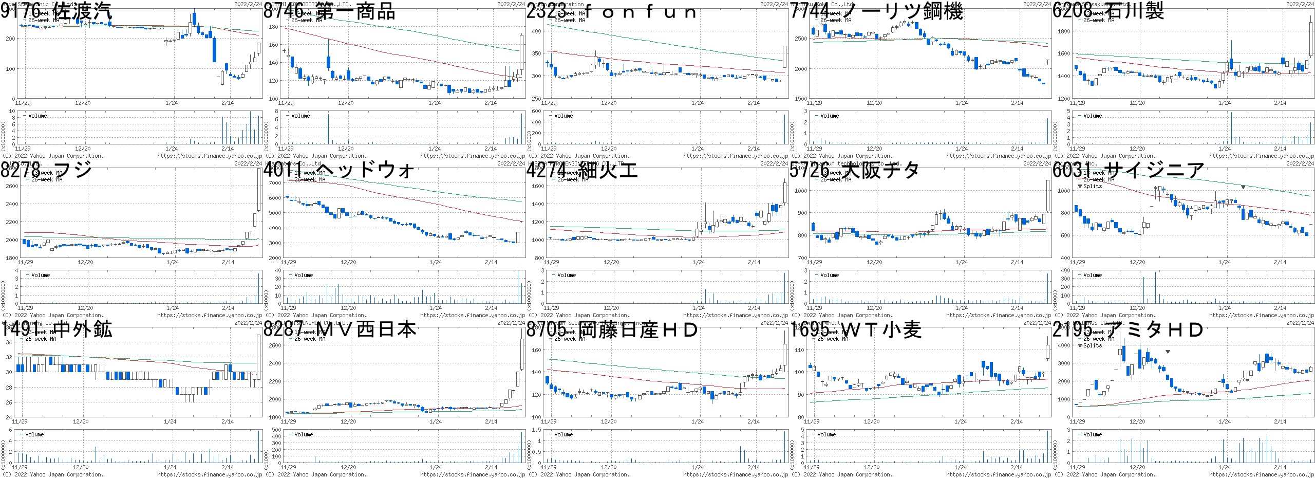 コード,銘柄名,市場,株価,前日比,前日比.1,出来高,PER,PBR,利回り9176,佐渡汽,JQ,185.0,50.0,+37.04%,8492600,-,-,-8746,第一商品,JQ,170.0,43.0,+33.86%,7224200,-,0.71,-2323,fonfun,JQ,366.0,80.0,+27.97%,524000,-,2.24,-7744,ノーリツ鋼機,東1,2140.0,400.0,+22.99%,2294100,0.8,0.69,7.106208,石川製,東1,1878.0,341.0,+22.19%,3222100,119,2.98,-8278,フジ,東1,2792.0,500.0,+21.82%,3548900,20.9,1.11,0.904011,ヘッドウォ,東M,4400.0,700.0,+18.92%,23900,164,5.15,-4274,細火工,JQ,1635.0,254.0,+18.39%,2707400,54.5,2.32,0.435726,大阪チタ,東1,1044.0,150.0,+16.78%,2690500,-,1.35,-6031,サイジニア,東M,698.0,100.0,+16.72%,6400,-,2.87,-1491,中外鉱,東2,35.0,5.0,+16.67%,5699800,36.1,1.47,-8287,MV西日本,東2,2671.0,371.0,+16.13%,463800,40.1,1.36,1.508705,岡藤日産HD,JQ,165.0,22.0,+15.38%,1413500,-,0.75,3.031695,WT小麦,東E,112.0,12.4,+12.45%,4759800,-,-,-2195,アミタHD,JG,2784.0,304.0,+12.26%,292500,26.9,11.19,0.29コード,銘柄名,市場,株価,前日比,前日比.1,出来高,PER,PBR,利回り3841,ジーダット,JQ,1823,-497,-21.42%,135500,25.0,1.15,2.193083,シーズメン,JQ,752,-150,-16.63%,1820100,43.4,1.81,-4882,ペルセウス,東M,416,-80,-16.13%,5337700,-,1.46,-3094,スーパーV,JQ,935,-171,-15.46%,323500,394,2.11,1.076541,グレイス,東1,17,-3,-15.00%,5512700,0.6,0.15,-9272,ブティックス,東M,1764,-276,-13.53%,27100,30.8,7.77,-4316,ビーマップ,JG,491,-72,-12.79%,256700,-,2.64,-7895,中央化学,JQ,295,-43,-12.72%,64500,7.4,0.56,-4393,バンクオブイ,東M,1702,-243,-12.49%,107900,-,12.03,-2586,フルッタ,東M,64,-9,-12.33%,794400,-,1.19,-7352,Bエンジニア,東M,868,-122,-12.32%,22000,82.3,15.47,-6026,GMOテック,東M,1200,-168,-12.28%,4000,-,2.59,-4584,キッズバイオ,東M,330,-46,-12.23%,508500,-,5.26,-4932,アルマード,JQ,743,-101,-11.97%,4415700,13.5,2.69,5.384582,シンバイオ,JG,695,-94,-11.91%,5941500,18.0,4.29,-にほんブログ村