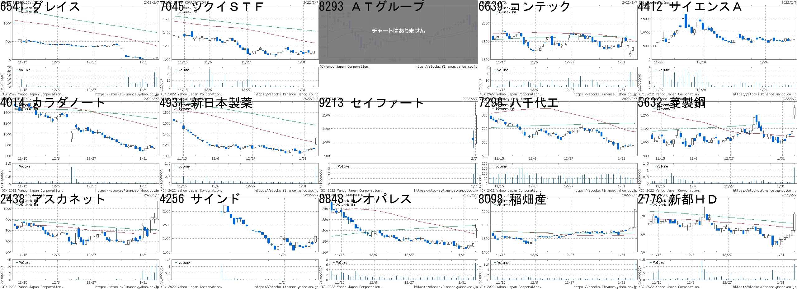 コード,銘柄名,市場,株価,前日比,前日比.1,出来高,PER,PBR,利回り6541,グレイス,東1,48,+15,+45.45%,25460100,1.7,0.44,-7045,ツクイSTF,JQ,1422,+300,+26.74%,200,163,1.14,1.058293,ATグループ,名2,2006,+400,+24.91%,1700,8.9,0.28,1.006639,コンテック,東2,2135,+400,+23.05%,1000,10.8,1.03,0.944412,サイエンスA,東M,8560,"+1,500",+21.25%,739400,-,52.59,-4014,カラダノート,東M,914,+150,+19.63%,6600,32.2,5.85,-4931,新日本製薬,東1,1325,+202,+17.99%,1276300,13.7,1.79,2.269213,セイファート,JQ,1199,+181,+17.78%,3915000,11.2,3.36,1.677298,八千代工,JQ,680,+100,+17.24%,26600,4.1,0.28,2.655632,菱製鋼,東1,1255,+176,+16.31%,1184000,6.4,0.49,3.982438,アスカネット,東M,1070,+150,+16.30%,11340600,89.9,3.10,0.654256,サインド,東M,2080,+287,+16.01%,22700,68.2,25.61,-8848,レオパレス,東1,204,+28,+15.91%,6685800,37.3,-,-8098,稲畑産,東1,2032,+266,+15.06%,1847400,5.7,0.69,5.412776,新都HD,JQ,71,+9,+14.52%,1164800,44.9,2.50,-コード,銘柄名,市場,株価,前日比,前日比.1,出来高,PER,PBR,利回り9176,佐渡汽,JQ,122.0,-80.0,-39.60%,567300,-,-,-6205,OKK,東1,758.0,-150.0,-16.52%,630200,-,2.29,-8157,都築電,東1,1402.0,-269.0,-16.10%,1538200,9.2,0.79,3.356548,旅工房,東M,800.0,-150.0,-15.79%,11700,-,7.45,-6943,NKK,JQ,5140.0,-850.0,-14.19%,8900,7.3,0.38,2.924970,東洋合成,JQ,10810.0,-1670.0,-13.38%,198500,30.6,5.77,0.289896,JKHD,東1,994.0,-149.0,-13.04%,607600,4.9,0.62,3.021689,WT天然ガス,東E,2.1,-0.3,-12.50%,22534700,-,-,-3998,すららネット,東M,1069.0,-150.0,-12.31%,349900,23.7,4.18,-7733,オリンパス,東1,2263.0,-315.0,-12.22%,14299100,26.5,6.04,0.624350,メディシス,東1,540.0,-73.0,-11.91%,237200,7.1,1.25,2.226867,リーダー電子,JQ,540.0,-70.0,-11.48%,59500,17.3,0.52,-9211,エフ・コード,東M,3850.0,-475.0,-10.98%,212000,53.9,27.52,-6032,インタワクス,東1,375.0,-46.0,-10.93%,55000,17.1,1.90,4.007133,ヒュウガプラ,東M,4685.0,-575.0,-10.93%,311500,49.2,21.51,-にほんブログ村
