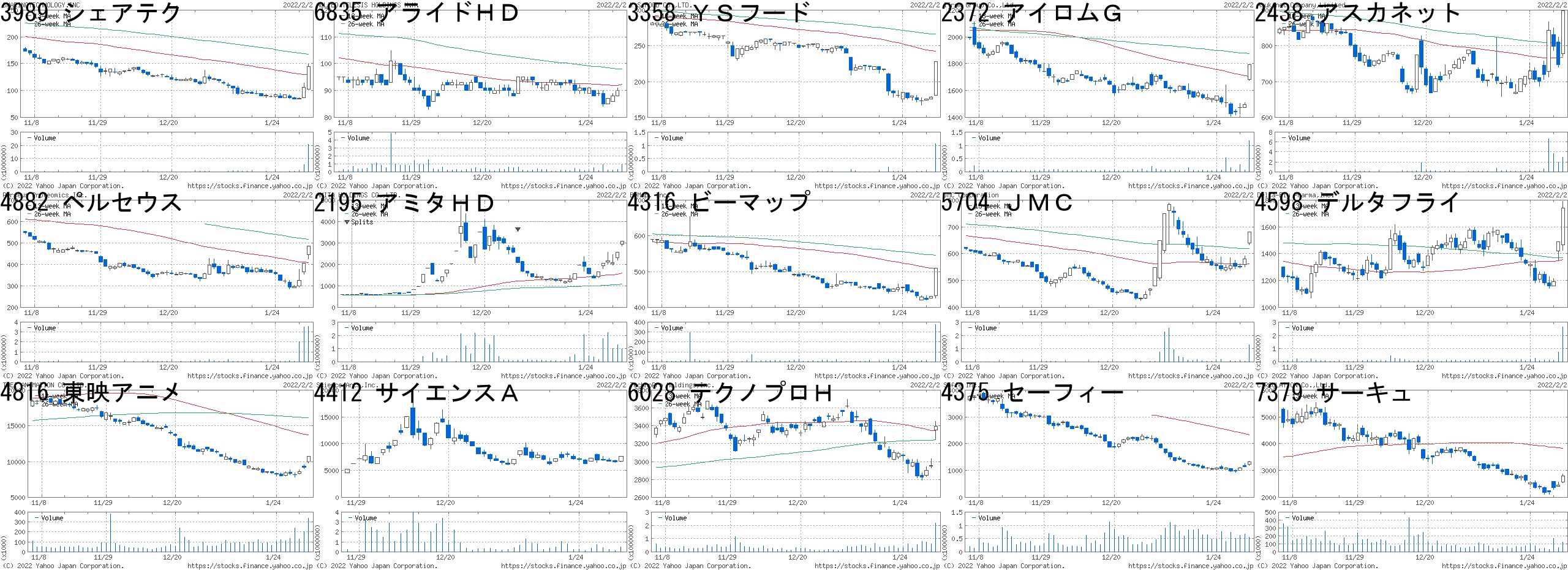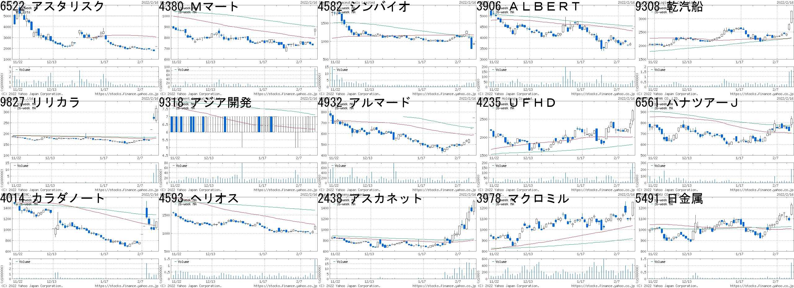 コード,銘柄名,市場,株価,前日比,前日比.1,出来高,PER,PBR,利回り6522,アスタリスク,東M,2166,400,+22.65%,26000,58.8,8.42,-4380,Mマート,東M,880,150,+20.55%,91600,23.1,4.08,1.144582,シンバイオ,JG,944,150,+18.89%,3221000,24.5,5.82,-3906,ALBERT,東M,4420,700,+18.82%,62100,44.2,5.21,-9308,乾汽船,東1,3285,503,+18.08%,1670400,8.2,3.13,5.699827,リリカラ,JQ,316,46,+17.04%,13695000,4.9,0.57,4.599318,アジア開発,東2,7,1,+16.67%,16129700,-,2.66,-4932,アルマード,JQ,745,100,+15.50%,19800,13.5,2.7,5.374235,UFHD,JQ,2737,365,+15.39%,194100,23.6,2.11,1.246561,ハナツアーJ,東M,837,111,+15.29%,201300,-,8.22,-4014,カラダノート,東M,1149,150,+15.02%,780100,40.5,7.35,-4593,ヘリオス,東M,1198,153,+14.64%,1457000,-,7.65,-2438,アスカネット,東M,1527,184,+13.70%,10773700,128,4.42,0.463978,マクロミル,東1,1253,151,+13.70%,442900,18.3,1.61,1.285491,日金属,東1,1228,140,+12.87%,1202000,4.1,0.36,-コード,銘柄名,市場,株価,前日比,前日比.1,出来高,PER,PBR,利回り4073,ジィ・シィ,東M,672,-146,-17.85%,158500,-,1.62,-6464,ツバキナカ,東1,1158,-221,-16.03%,1743700,19.3,0.88,2.592158,フロンテオ,東M,1993,-357,-15.19%,9202000,71.2,13.90,0.354267,ライトW,東M,2844,-456,-13.82%,3309000,65.2,21.12,0.494415,ブロードE,東M,989,-140,-12.40%,184000,35.8,1.35,-7383,ネットプロ,東1,650,-79,-10.84%,5557000,233,3.32,-9246,プロカン,東M,2399,-246,-9.30%,618600,28.8,6.48,-7072,インテM,東M,1285,-131,-9.25%,124800,197,3.12,-3989,シェアテク,東M,138,-14,-9.21%,19248100,-,11.60,-3288,オープンH,東1,5230,-520,-9.04%,766200,9.2,2.13,2.374261,アジアQ,東M,2756,-274,-9.04%,297100,16.7,4.24,-1552,VIX短先物,東E,1972,-194,-8.96%,1306995,-,-,-3260,エスポア,名C,1001,-97,-8.83%,500,135,1.54,-2124,ジェイエイシ,東1,1783,-171,-8.75%,586200,17.4,5.38,4.214274,細火工,JQ,1206,-114,-8.64%,223800,40.2,1.71,0.58にほんブログ村