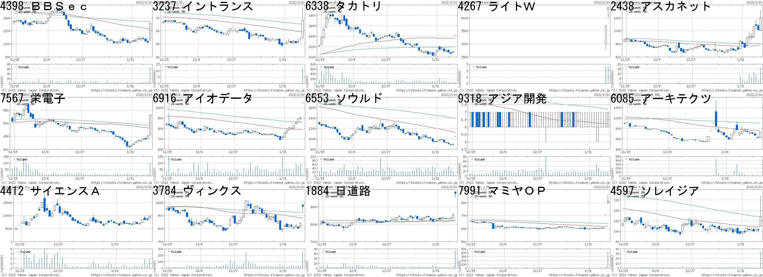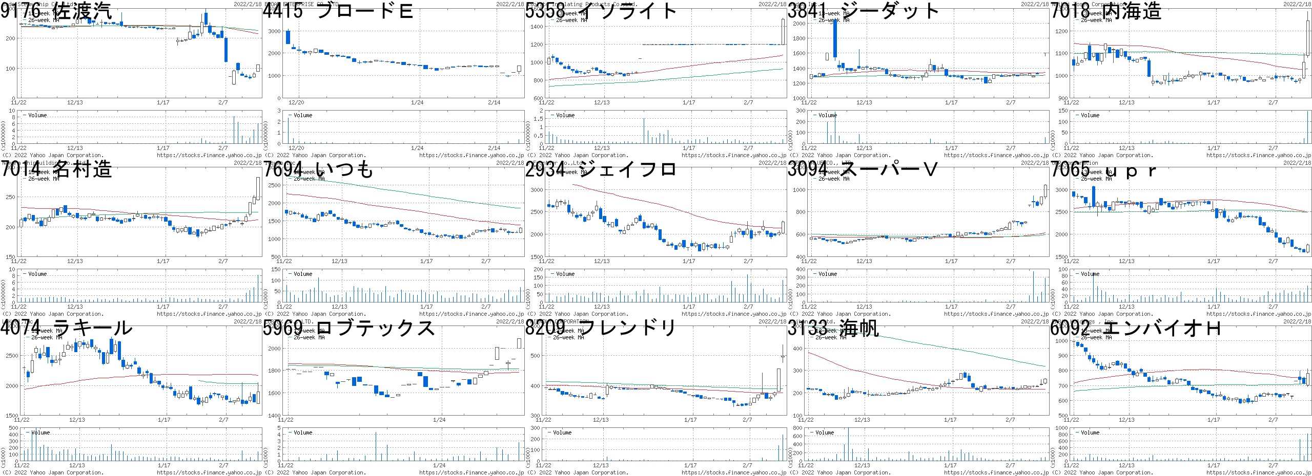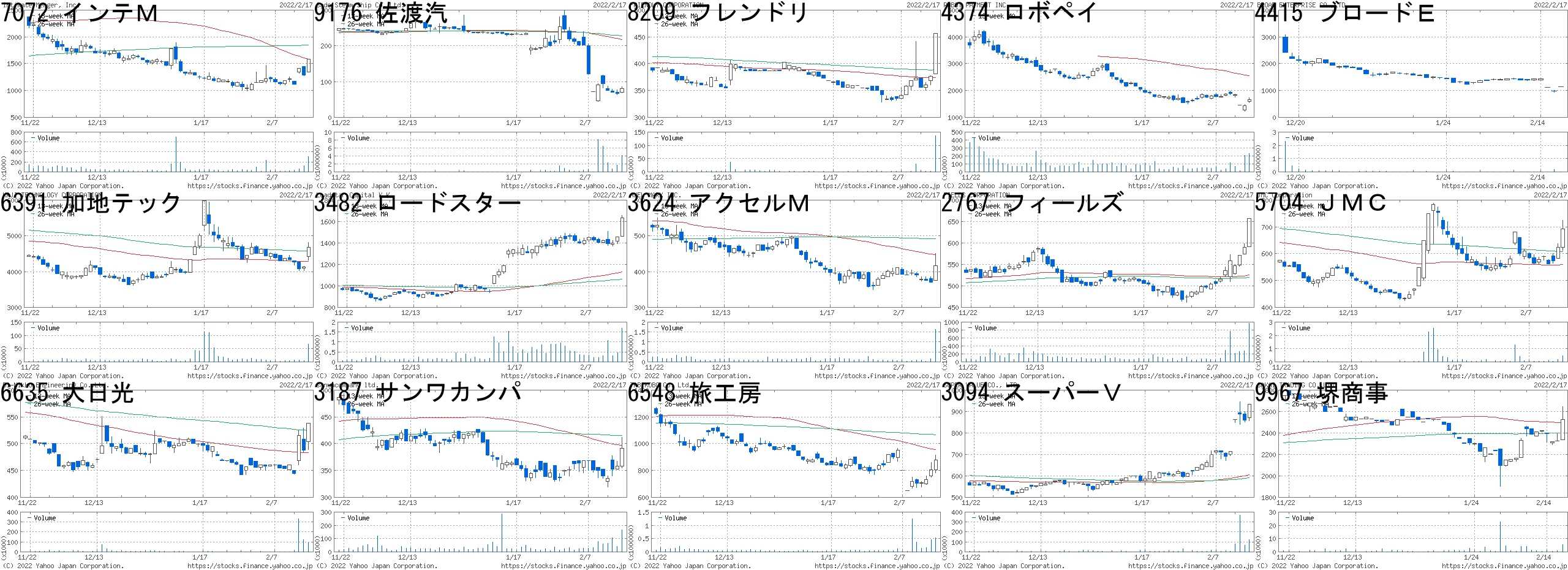 コード,銘柄名,市場,株価,前日比,前日比.1,出来高,PER,PBR,利回り7072,インテM,東M,1585,300,+23.35%,305800,243,3.85,-9176,佐渡汽,JQ,81,15,+22.73%,4177900,-,-,-8209,フレンドリ,東2,456,80,+21.28%,136800,-,-,-4374,ロボペイ,東M,1663,233,+16.29%,230500,-,10.60,-4415,ブロードE,東M,1139,150,+15.17%,5100,41.3,1.56,-6391,加地テック,東2,4680,555,+13.45%,67100,25.0,1.19,0.853482,ロードスター,東M,1636,181,+12.44%,1693900,6.0,2.47,2.483624,アクセルM,東M,416,45,+12.13%,1618900,-,5.69,-2767,フィールズ,東1,657,67,+11.36%,962200,-,0.72,-5704,JMC,東M,693,69,+11.06%,445100,21.4,1.67,-6635,大日光,JQ,538,50,+10.25%,94900,5.4,0.85,1.863187,サンワカンパ,東M,391,33,+9.22%,167000,20.5,3.77,-6548,旅工房,東M,878,73,+9.07%,530200,-,8.17,-3094,スーパーV,JQ,935,76,+8.85%,121000,394,2.11,1.079967,堺商事,東2,2525,200,+8.60%,5700,7.0,0.54,3.56コード,銘柄名,市場,株価,前日比,前日比.1,出来高,PER,PBR,利回り6541,グレイス,東1,19,-5,-20.83%,4124900,0.7,0.17,-2158,フロンテオ,東M,1593,-400,-20.07%,12536700,56.9,11.11,0.444371,CCT,東M,5160,-930,-15.27%,336400,33.5,10.28,-4174,アピリッツ,JQ,810,-128,-13.65%,54400,24.1,1.75,0.624377,ワンキャリア,東M,2143,-296,-12.14%,262300,31.7,6.68,-9213,セイファート,JQ,881,-114,-11.46%,593600,7.1,2.33,-2978,ツクルバ,東M,637,-79,-11.03%,62700,-,5.1,-4267,ライトW,東M,2535,-309,-10.86%,1790800,58.1,18.83,0.559308,乾汽船,東1,2939,-346,-10.53%,2692000,7.4,2.8,6.364592,サンバイオ,東M,1473,-173,-10.51%,2326900,-,21.17,-7353,Kラーニング,東M,767,-88,-10.29%,305400,34.7,4.37,-4179,ジーネクスト,東M,362,-40,-9.95%,31500,-,2.84,-4414,フレクト,東M,2201,-237,-9.72%,57700,26.8,6.22,-4598,デルタフライ,東M,1597,-168,-9.52%,538700,-,6.35,-4014,カラダノート,東M,1042,-107,-9.31%,1736600,36.7,6.67,-にほんブログ村
