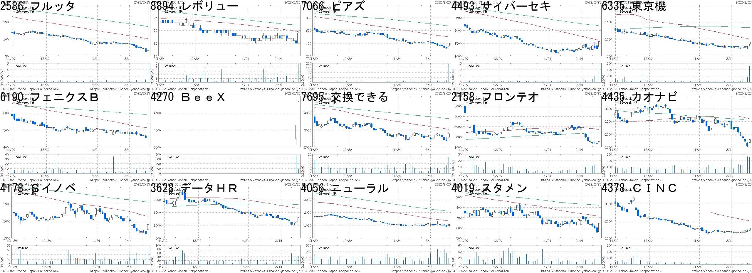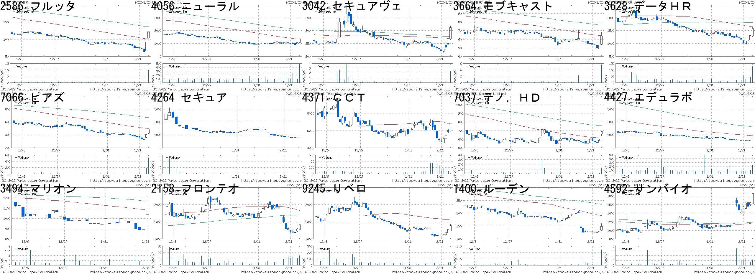 コード,銘柄名,市場,株価,前日比,前日比.1,出来高,PER,PBR,利回り2586,フルッタ,東M,92,28,+43.75%,5772900,-,1.7,-8894,レボリュー,東2,19,4,+26.67%,4811500,67.9,4.58,-7066,ピアズ,東M,406,80,+24.54%,191700,-,0.89,-4493,サイバーセキ,東M,1569,291,+22.77%,2450500,56.8,15.6,-6335,東京機,東1,914,150,+19.63%,516400,-,1.17,-6190,フェニクスB,東M,536,80,+17.54%,11000,-,1.69,-4270,BeeX,東M,4855,700,+16.85%,159800,84.6,12.47,-7695,交換できる,東M,2781,400,+16.80%,67000,189,7.6,-2158,フロンテオ,東M,1582,224,+16.49%,11668800,56.5,11.03,0.444435,カオナビ,東M,1802,255,+16.48%,253200,300,18.14,-4178,Sイノベ,東M,1900,268,+16.42%,64500,24.3,4.82,-3628,データHR,東M,1317,185,+16.34%,44900,58.3,9.55,0.514056,ニューラル,東M,1070,150,+16.30%,97900,7642,11.69,-4019,スタメン,東M,646,88,+15.77%,24200,90.9,5.9,-4378,CINC,東M,1590,216,+15.72%,21700,35.3,4.09,-コード,銘柄名,市場,株価,前日比,前日比.1,出来高,PER,PBR,利回り3945,スパバッグ,東2,1651,-500,-23.25%,40000,-,0.93,-4274,細火工,JQ,1271,-364,-22.26%,1625600,42.4,1.80,0.556208,石川製,東1,1532,-346,-18.42%,1986200,97.7,2.43,-4011,ヘッドウォ,東M,3800,-600,-13.64%,50800,142,4.45,-7847,グラファイト,JQ,633,-85,-11.84%,274600,9.4,0.88,5.533223,SLD,JQ,584,-76,-11.52%,13300,-,-,-5271,トーヨアサノ,東2,1439,-186,-11.45%,9800,13.3,0.56,3.472747,北雄ラッキー,JQ,2869,-361,-11.18%,12400,13.9,0.70,1.743177,ありがとうS,JQ,2085,-256,-10.94%,25400,9.4,0.91,4.803384,アークコア,名C,429,-51,-10.63%,42600,12.7,1.70,-2055,日和産,東2,320,-35,-9.86%,28000,20.6,0.34,1.886203,豊和工,東1,816,-89,-9.83%,774800,13.1,0.59,2.451552,VIX短先物,東E,2251,-224,-9.05%,2693843,-,-,-3073,DDHD,東1,491,-47,-8.74%,171400,38.7,277,-5982,マルゼン,東2,1802,-161,-8.20%,16600,10.5,0.71,1.66にほんブログ村