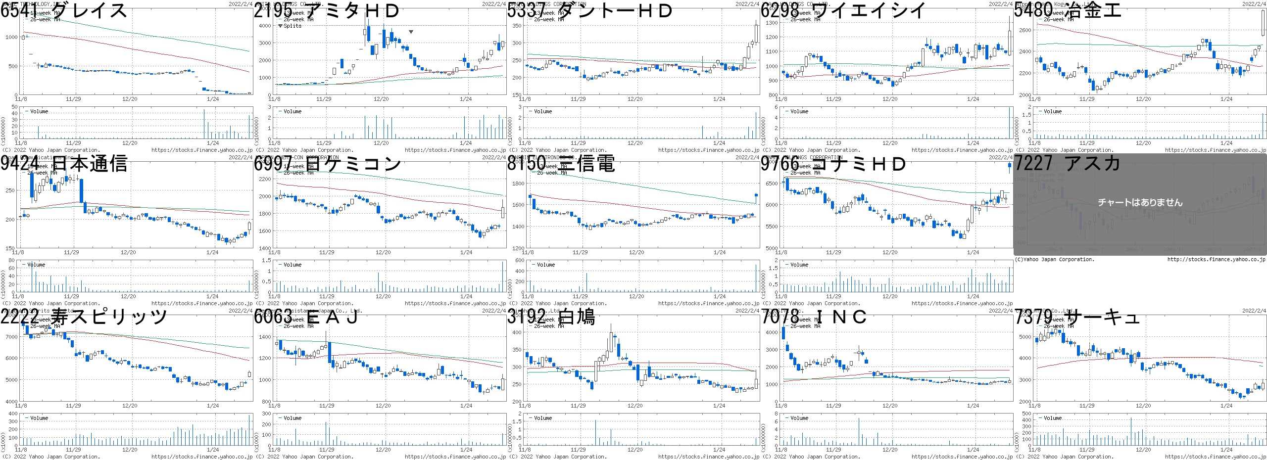 コード,銘柄名,市場,株価,前日比,前日比.1,出来高,PER,PBR,利回り6541,グレイス,東1,33,18,+120.00%,36285000,1.2,0.3,-2195,アミタHD,JG,3080,502,+19.47%,1786000,144,15.99,-5337,ダントーHD,東1,351,48,+15.84%,2430200,-,1.27,-6298,ワイエイシイ,東1,1242,152,+13.94%,5856300,10.3,0.77,2.905480,冶金工,東1,2778,332,+13.57%,1562600,4.4,0.66,4.329424,日本通信,東1,194,23,+13.45%,28249400,-,54.49,-6997,日ケミコン,東1,1868,216,+13.08%,1417800,-,0.95,-8150,三信電,東1,1679,176,+11.71%,509800,8.9,0.72,5.969766,コナミHD,東1,6870,720,+11.71%,1552400,-,2.76,1.067227,アスカ,名2,1090,114,+11.68%,6700,5.7,0.72,3.492222,寿スピリッツ,東1,5340,500,+10.33%,375100,175,8.36,0.566063,EAJ,JQ,1010,93,+10.14%,112400,13.1,2.55,0.993192,白鳩,JQ,264,24,+10.00%,446000,-,0.76,-7078,INC,東M,1206,109,+9.94%,431600,-,6.38,-7379,サーキュ,東M,2839,251,+9.70%,91000,71.5,10.68,-コード,銘柄名,市場,株価,前日比,前日比.1,出来高,PER,PBR,利回り3744,サイオス,東2,420,-88,-17.32%,530900,60.7,1.98,2.389214,RI,東M,2067,-405,-16.38%,768300,29.2,17.58,-5741,UACJ,東1,2396,-340,-12.43%,1312900,5.0,0.55,3.553989,シェアテク,東M,122,-16,-11.59%,2340800,-,13.86,-8918,ランド,東1,9,-1,-10.00%,14492100,4.3,2.04,1.116205,OKK,東1,908,-96,-9.56%,327900,-,2.75,-4385,メルカリ,東M,3810,-380,-9.07%,7187000,-,15.54,-3913,sMedio,東M,714,-66,-8.46%,36000,-,1.23,-4372,ユミルリンク,東M,1200,-108,-8.26%,105300,16.3,2.93,-2795,プリメックス,JQ,712,-63,-8.13%,7100,12.0,0.6,2.813236,プロパスト,JQ,137,-12,-8.05%,2052000,6.8,0.69,1.465202,板硝子,東1,470,-41,-8.02%,4840700,5.3,1.35,-1518,三井松島HD,東1,1676,-145,-7.96%,5770200,5.5,0.66,3.588256,プロルート,JQ,113,-9,-7.38%,3842600,25.7,3.56,-1966,高田工,東2,685,-49,-6.68%,48900,5.5,0.4,1.46にほんブログ村