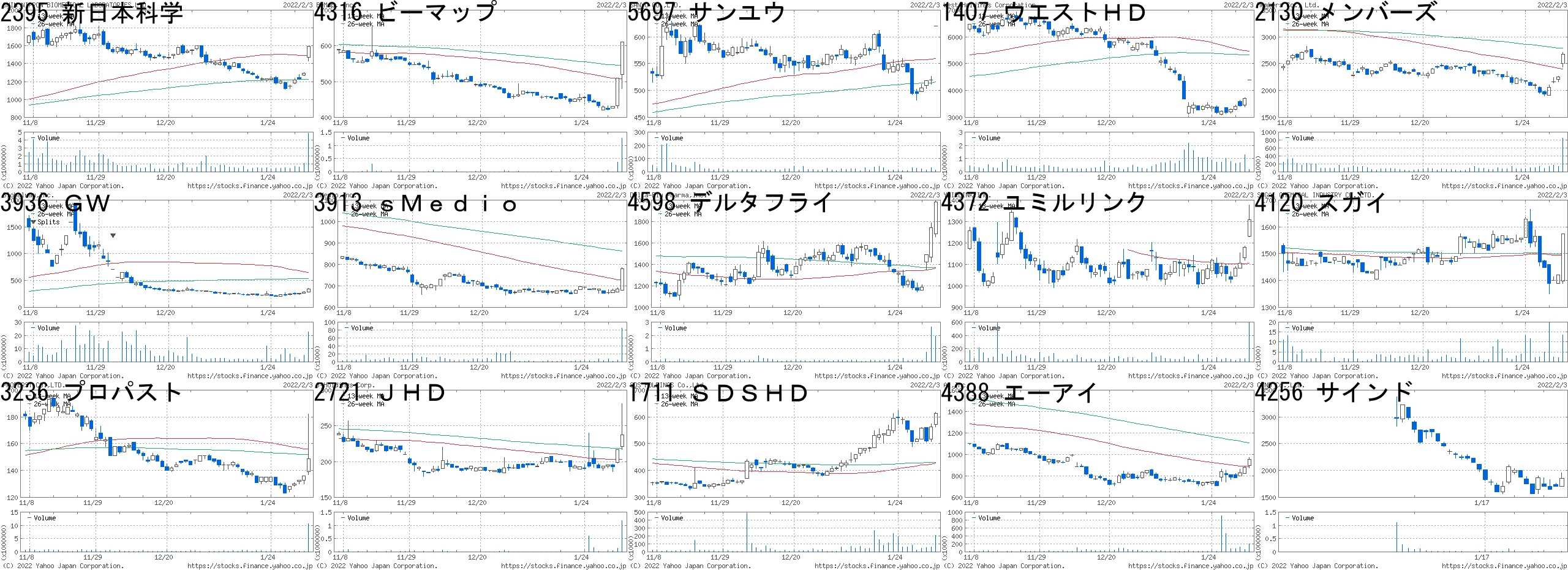 コード,銘柄名,市場,株価,前日比,前日比.1,出来高,PER,PBR,利回り2395,新日本科学,東1,1592,300,+23.22%,4818300,11.4,3.57,2.514316,ビーマップ,JG,610,100,+19.61%,1278000,49.2,3.28,-5697,サンユウ,東2,620,100,+19.23%,12000,6.5,0.43,4.681407,ウエストHD,JQ,4400,700,+18.92%,178000,25.1,7.62,1.252130,メンバーズ,東1,2674,415,+18.37%,842500,32.7,6.8,0.883936,GW,東M,339,49,+16.90%,22821400,40.8,27.61,-3913,sMedio,東M,780,95,+13.87%,84900,-,1.35,-4598,デルタフライ,東M,1980,240,+13.79%,1936000,-,6.54,-4372,ユミルリンク,東M,1308,129,+10.94%,591200,17.8,3.19,-4120,スガイ,東2,1574,154,+10.85%,13500,6.7,0.35,2.223236,プロパスト,JQ,149,13,+9.56%,10644700,7.4,0.75,1.342721,JHD,JQ,237,20,+9.22%,1165500,-,4.39,-1711,SDSHD,東2,613,51,+9.07%,205500,-,79.4,-4388,エーアイ,東M,954,73,+8.29%,196600,86.0,3.82,0.214256,サインド,東M,1852,141,+8.24%,13500,60.7,22.81,-コード,銘柄名,市場,株価,前日比,前日比.1,出来高,PER,PBR,利回り2195,アミタHD,JG,2578,-497,-16.16%,2210900,120,13.38,-4616,川上塗,東2,1378,-223,-13.93%,16700,7.6,0.54,1.819107,川崎汽,東1,6220,-980,-13.61%,13994900,1.1,0.88,4.827133,ヒュウガプラ,東M,5410,-840,-13.44%,867600,56.8,24.84,-4375,セーフィー,東M,1146,-174,-13.18%,689900,-,6.26,-9698,クレオ,JQ,870,-126,-12.65%,322000,8.9,1.08,4.486095,メドピア,東1,2754,-396,-12.57%,878400,33.6,8.88,-3923,ラクス,東1,2199,-296,-11.86%,3277900,437,49.11,0.096908,イリソ電子,東1,4090,-550,-11.85%,424800,24.1,1.66,1.475704,JMC,東M,600,-80,-11.76%,393300,27.8,1.53,-4192,スパイダー,東M,926,-121,-11.56%,241800,-,6.54,-4882,ペルセウス,東M,430,-55,-11.34%,6572600,-,1.45,-6193,バーチャレク,東M,1173,-147,-11.14%,227200,8.9,3.66,-4017,クリーマ,東M,792,-98,-11.01%,145400,18.1,4.1,-4480,メドレー,東M,1941,-231,-10.64%,903400,247,3.99,-にほんブログ村