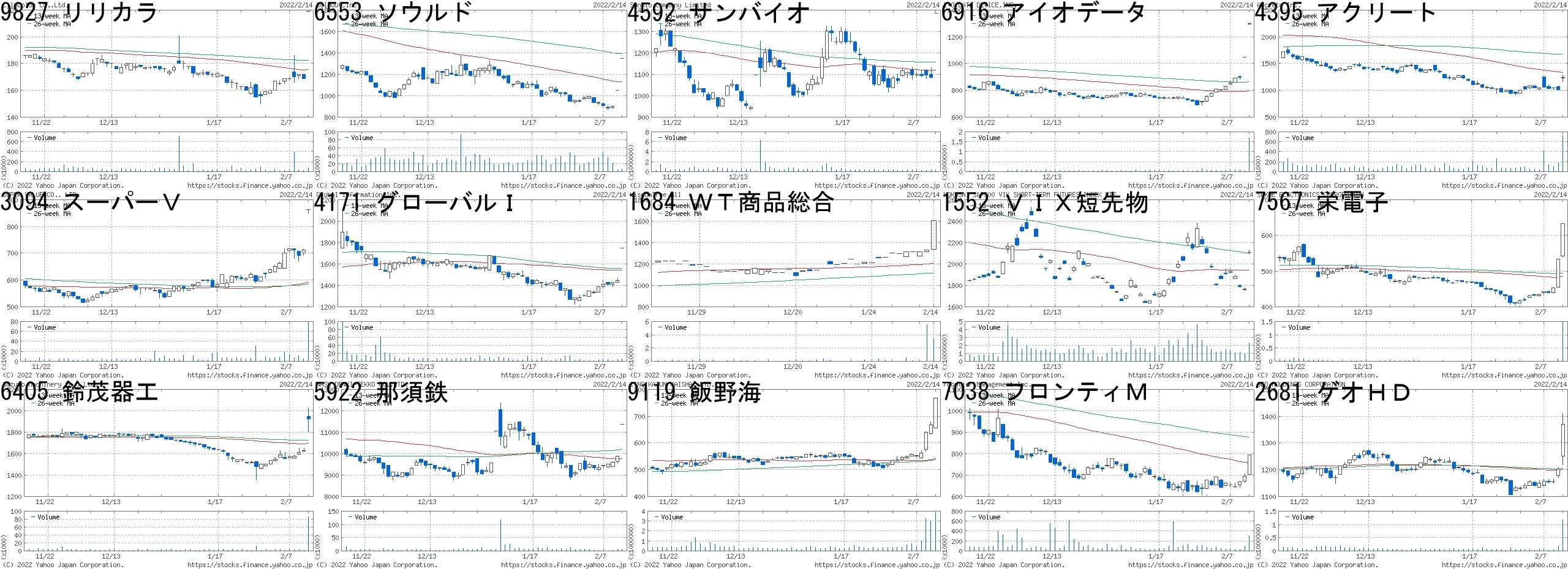 コード,銘柄名,市場,株価,前日比,前日比.1,出来高,PER,PBR,利回り9827,リリカラ,JQ,219.0,+50,+29.59%,73000,3.4,0.40,6.626553,ソウルド,東1,1350.0,+300,+28.57%,6600,-,4.47,-4592,サンバイオ,東M,1385.0,+300,+27.65%,78400,-,19.91,-6916,アイオデータ,東1,1301.0,+255,+24.38%,1702200,41.8,0.58,-4395,アクリート,東M,1238.0,+219,+21.49%,723000,19.7,4.49,0.813094,スーパーV,JQ,863.0,+150,+21.04%,77300,364,1.95,1.164171,グローバルI,JQ,1748.0,+300,+20.72%,6600,11.8,2.90,2.571684,WT商品総合,東E,1603.0,+271.0,+20.35%,3460,-,-,-1552,VIX短先物,東E,2110.0,+345,+19.55%,2305369,-,-,-7567,栄電子,JQ,633.0,+100,+18.76%,1463900,6.9,0.95,1.116405,鈴茂器工,JQ,1923.0,+292,+17.90%,85900,10.8,0.95,2.085922,那須鉄,東2,11380.0,"+1,500",+15.18%,4700,4.9,0.59,1.769119,飯野海,東1,768.0,+100,+14.97%,3747000,8.1,0.94,3.787038,フロンティM,東1,794.0,+100,+14.41%,312000,18.1,3.76,-2681,ゲオHD,東1,1370.0,+167,+13.88%,1172200,14.5,0.77,1.75コード,銘柄名,市場,株価,前日比,前日比.1,出来高,PER,PBR,利回り1400,ルーデン,JG,143,-58,-28.86%,805500,-,0.85,-4475,HENNGE,東M,945,-300,-24.10%,1068400,112,15.88,-4476,AIクロス,東M,1020,-292,-22.26%,159200,24.9,2.63,-4263,サスメド,東M,1264,-344,-21.39%,377800,-,4.52,-3696,セレス,東1,1502,-400,-21.03%,64000,15.3,1.86,1.336541,グレイス,東1,27,-7,-20.59%,7356200,1.0,0.25,-4264,セキュア,東M,1158,-300,-20.58%,11000,46.0,5.53,-9212,GEI,東M,847,-215,-20.24%,2366200,120,5.26,-9176,佐渡汽,JQ,75,-19,-20.21%,2305600,-,-,-3923,ラクス,東1,1911,-482,-20.14%,4092900,379,41.65,0.106698,ヴィスコ,東2,816,-200,-19.69%,202600,11.6,1.63,-4179,ジーネクスト,東M,415,-100,-19.42%,18200,-,3.30,-6035,IRジャパン,東1,4200,-1000,-19.23%,224900,18.4,11.15,2.693937,Ubicom,東1,1922,-450,-18.97%,211700,28.0,6.71,-4068,ベイシス,東M,2995,-700,-18.94%,91400,19.7,3.65,-にほんブログ村