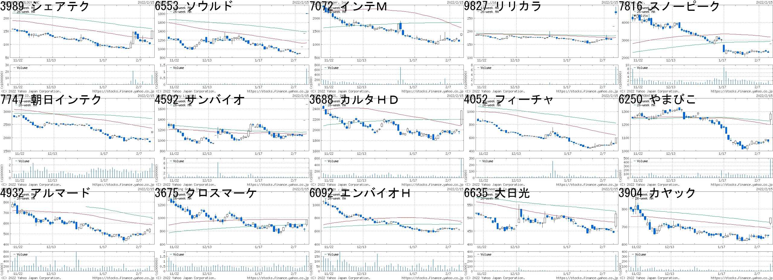 コード,銘柄名,市場,株価,前日比,前日比.1,出来高,PER,PBR,利回り3989,シェアテク,東M,152,50,+49.02%,14121600,-,12.77,-6553,ソウルド,東1,1804,454,+33.63%,1194100,-,5.98,-7072,インテM,東M,1416,300,+26.88%,57000,217,3.44,-9827,リリカラ,JQ,270,51,+23.29%,7288600,4.2,0.49,5.377816,スノーピーク,東1,2791,500,+21.82%,164800,32.0,7.63,0.437747,朝日インテク,東1,2238,400,+21.76%,2205800,57.9,5.55,0.524592,サンバイオ,東M,1685,300,+21.66%,213700,-,24.22,-3688,カルタHD,東1,2364,400,+20.37%,591800,14.8,2.21,2.284052,フィーチャ,東M,603,100,+19.88%,124200,255,6.43,-6250,やまびこ,東1,1280,207,+19.29%,478000,6.3,0.77,4.064932,アルマード,JQ,645,100,+18.35%,19400,11.7,2.34,6.203675,クロスマーケ,東1,977,150,+18.14%,1610700,13.8,3.68,0.866092,エンバイオH,東M,730,100,+15.87%,5900,8.3,0.83,1.106635,大日光,JQ,515,70,+15.73%,334800,5.1,0.81,1.943904,カヤック,東M,750,100,+15.38%,148600,11.4,3.49,0.52コード,銘柄名,市場,株価,前日比,前日比.1,出来高,PER,PBR,利回り4582,シンバイオ,JG,794.0,-300.0,-27.42%,2488000,20.6,4.89,-9245,リベロ,東M,1228.0,-400.0,-24.57%,135400,62.0,3.55,-4374,ロボペイ,東M,1451.0,-400.0,-21.61%,16100,-,9.25,-4415,ブロードE,東M,1129.0,-300.0,-20.99%,7400,40.9,1.54,-6694,ズーム,JQ,1161.0,-300.0,-20.53%,15600,12.4,0.85,4.314597,ソレイジア,東M,101.0,-25.0,-19.84%,8620400,-,5.21,-1684,WT商品総合,東E,1290.0,-313.0,-19.53%,9960,-,-,-3925,ダブスタ,東1,1926.0,-452.0,-19.01%,1000900,23.0,7.76,1.827809,寿屋,JQ,4350.0,-1000.0,-18.69%,266800,9.8,2.80,1.381724,シンクレイヤ,JQ,676.0,-148.0,-17.96%,311700,6.8,0.62,1.786235,オプトラン,東1,1882.0,-402.0,-17.60%,688900,17.7,1.77,2.232158,フロンテオ,東M,2350.0,-500.0,-17.54%,603000,83.9,16.39,0.304267,ライトW,東M,3300.0,-700.0,-17.50%,4530100,75.6,24.51,0.426067,インパクト,東M,2410.0,-500.0,-17.18%,259000,-,3.91,-7383,ネットプロ,東1,729.0,-150.0,-17.06%,966200,262,3.72,-にほんブログ村
