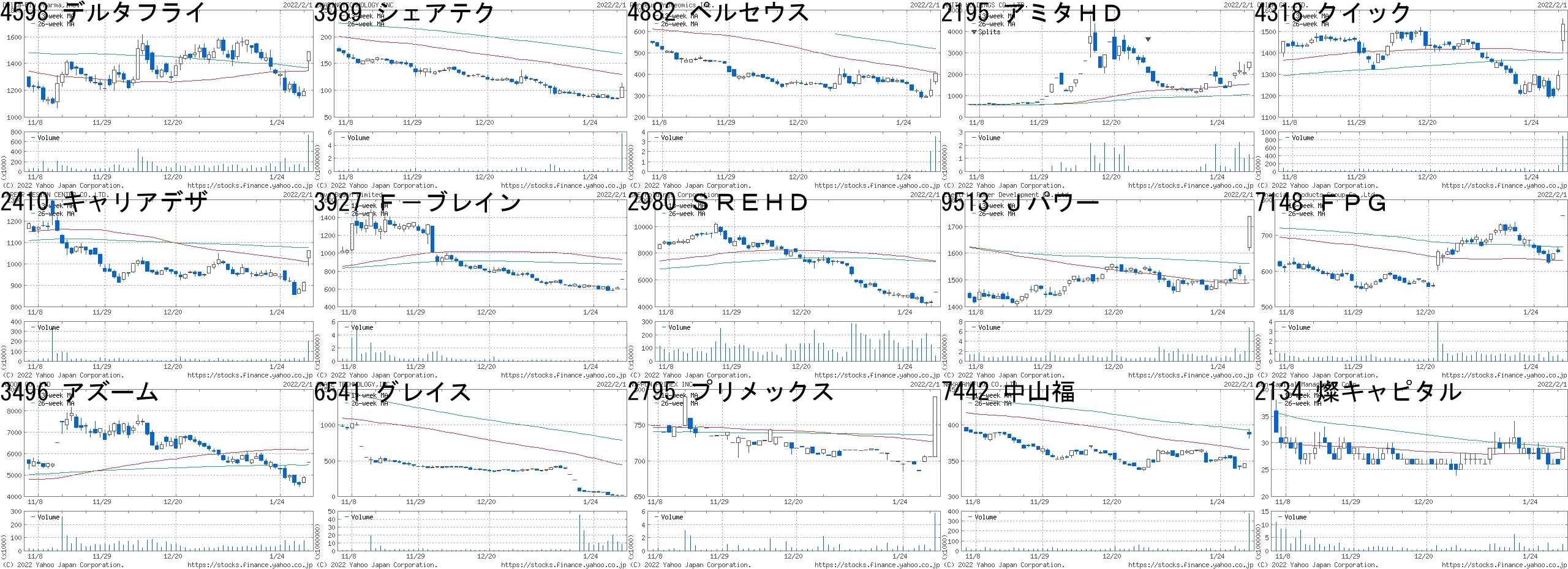 コード,銘柄名,市場,株価,前日比,前日比.1,出来高,PER,PBR,利回り4598,デルタフライ,東M,1490,300,+25.21%,734800,-,4.92,-3989,シェアテク,東M,106,21,+24.71%,5690500,-,12.05,-4882,ペルセウス,東M,405,80,+24.62%,3536100,-,1.37,-2195,アミタHD,JG,2574,500,+24.11%,1271000,120,13.36,-4318,クイック,東1,1535,242,+18.72%,885300,12.9,2.32,3.132410,キャリアデザ,東1,1064,150,+16.41%,200700,14.7,2.5,-3927,F-ブレイン,東M,710,100,+16.39%,7000,-,2.92,-2980,SREHD,東1,5090,705,+16.08%,39500,94.8,9.23,-9513,Jパワー,東1,1738,237,+15.79%,6735800,6.9,0.37,4.327148,FPG,東1,755,100,+15.27%,203500,11.9,2.14,4.243496,アズーム,東M,5600,705,+14.40%,6500,30.4,11.9,0.546541,グレイス,東1,16,2,+14.29%,8394500,0.6,0.15,-2795,プリメックス,JQ,790,84,+11.90%,5700,13.4,0.66,2.537442,中山福,東1,387,41,+11.85%,374500,20.0,0.36,2.582134,燦キャピタル,JQ,29,3,+11.54%,2463900,-,2.05,-コード,銘柄名,市場,株価,前日比,前日比.1,出来高,PER,PBR,利回り2352,ワオワールド,東1,1092.0,-300.0,-21.55%,266600,22.8,2.77,2.757433,伯東,東1,2220.0,-305.0,-12.08%,1339500,9.9,0.71,5.413762,テクマト,東1,1433.0,-187.0,-11.54%,868300,23.7,3.64,1.336961,エンプラス,東1,2581.0,-320.0,-11.03%,440200,10.8,0.58,1.749176,佐渡汽,JQ,219.0,-27.0,-10.98%,435700,-,-,-3137,ファンデリー,東M,322.0,-39.0,-10.80%,86200,30.1,0.79,0.939425,日本テレホン,JQ,342.0,-41.0,-10.70%,188700,-,1.95,-6471,日精工,東1,694.0,-83.0,-10.68%,14613200,18.3,0.60,3.604080,田中化研,JQ,2017.0,-241.0,-10.67%,1918900,100,5.00,-5410,合同鉄,東1,1265.0,-144.0,-10.22%,326800,-,0.19,-3326,ランシステム,JQ,391.0,-44.0,-10.11%,53500,-,-,-3402,東レ,東1,652.0,-73.1,-10.08%,23134300,11.2,0.80,2.454771,F&M,JQ,1575.0,-176.0,-10.05%,114900,17.1,2.67,1.903294,イーグランド,東1,1312.0,-146.0,-10.01%,178800,5.3,0.91,5.265074,テスHD,東1,1311.0,-144.0,-9.90%,715400,18.3,1.90,1.60にほんブログ村