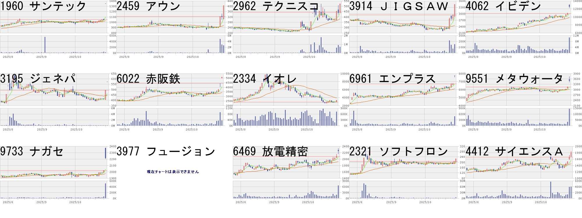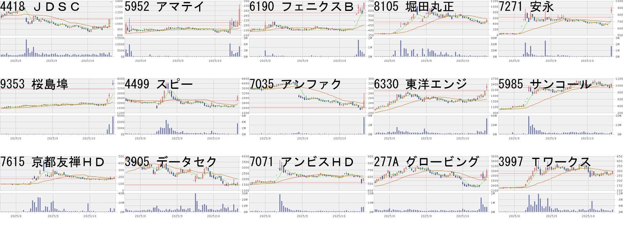 コード,銘柄名,市場,株価,前日比,前日比.1,出来高,PER,PBR,利回り4418,JDSC,東G,1381,300,+27.75%,57300,51.5,5.17,-5952,アマテイ,東S,266,55,+26.07%,4900900,21.7,2.13,1.886190,フェニクスB,東G,678,100,+17.30%,283100,17.1,2.03,-8105,堀田丸正,東S,544,80,+17.24%,2921200,1026,11.8,-7271,安永,東S,870,110,+14.47%,1665200,12.8,0.83,1.389353,桜島埠,東S,3575,425,+13.49%,844100,20.9,0.78,1.264499,スピー,東S,2920,334,+12.92%,3464400,-,4.33,-7035,アンファク,東S,248,26,+11.71%,3612000,-,3.15,-6330,東洋エンジ,東P,2287,237,+11.56%,33953200,26.8,1.95,1.095985,サンコール,東S,1040,102,+10.87%,1907300,8.8,1.12,0.967615,京都友禅HD,東S,188,18,+10.59%,6800400,89.5,1.47,-3905,データセク,東G,1634,156,+10.55%,5355700,17.6,7.73,-7071,アンビスHD,東P,570,53,+10.25%,5105200,15.4,1.57,0.70277A,グロービング,東G,2993,249,+9.07%,532000,33.3,15.38,-3997,Tワークス,東S,296,24,+8.82%,1348400,115,6.89,0.68コード,銘柄名,市場,株価,前日比,前日比.1,出来高,PER,PBR,利回り8995,誠建設,東S,1111,-300,-21.26%,804900,37.3,0.57,2.257711,助川電気,東S,9250,-1870,-16.82%,4229100,61.5,10.6,0.433113,UNIVA,東S,87,-15,-14.71%,6471800,-,4.39,-1850,南海辰村,東S,556,-75,-11.89%,1640400,10.5,0.91,1.086736,サン電子,東S,10380,-1330,-11.36%,189100,52.1,4.74,-3692,FFRI,東G,11830,-1240,-9.49%,3871800,130,32.56,0.12186A,アストロHD,東G,835,-81,-8.84%,16108700,-,7.76,-9307,杉村倉,東S,990,-95,-8.76%,400300,17.8,0.96,1.21143A,イシン,東G,996,-92,-8.46%,32400,147,1.6,-189A,DMカンパニ,東G,1182,-109,-8.44%,41300,17.9,1.27,1.696946,日本アビオ,東S,4720,-380,-7.45%,476800,31.7,4.9,0.213681,ブイキューブ,東P,138,-11,-7.38%,773500,35.8,6.13,-198A,ポスプラ,東G,354,-28,-7.33%,91100,103,3.76,-3810,サイステップ,東S,372,-28,-7.00%,1143300,-,7.19,-3370,フジタコーポ,東S,394,-29,-6.86%,272400,11.2,11.22,0.76にほんブログ村