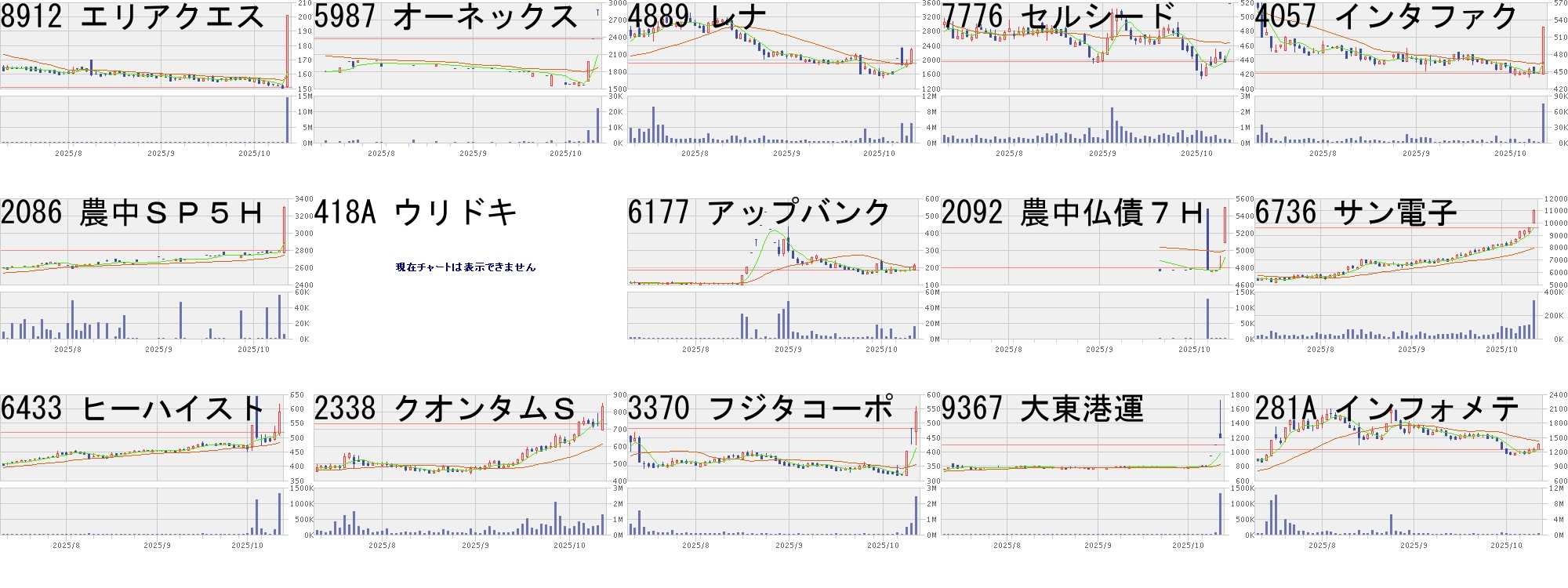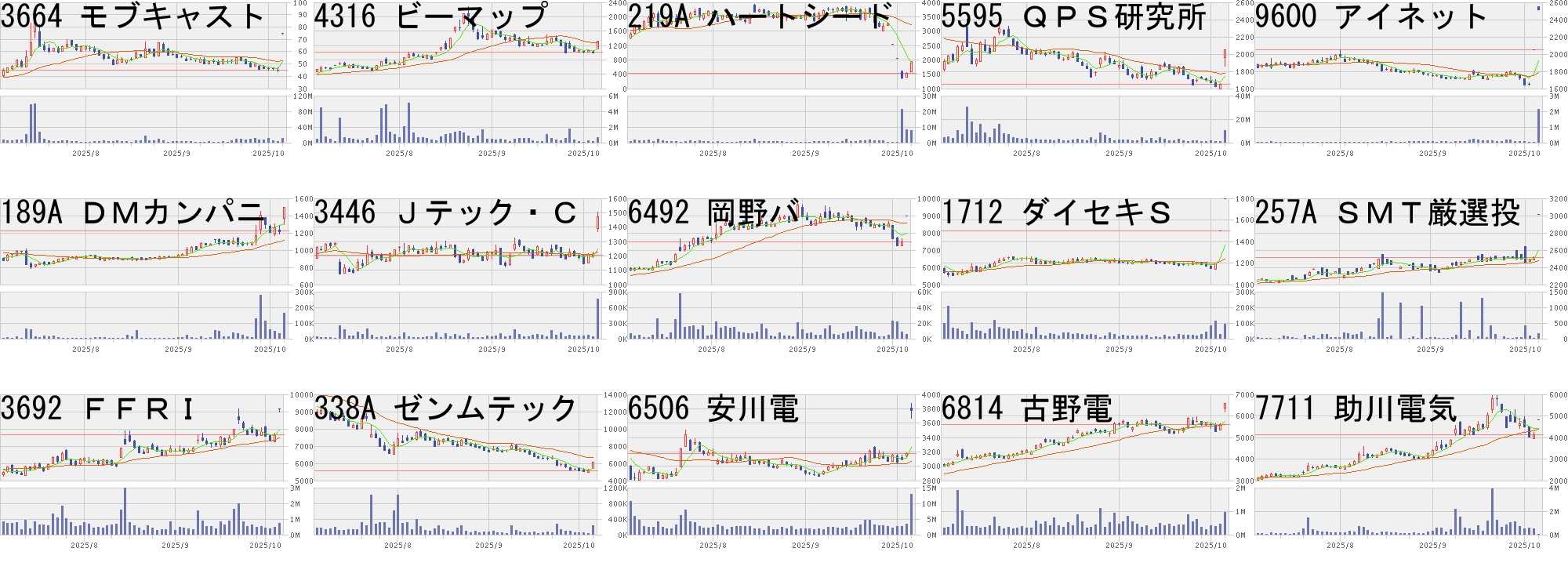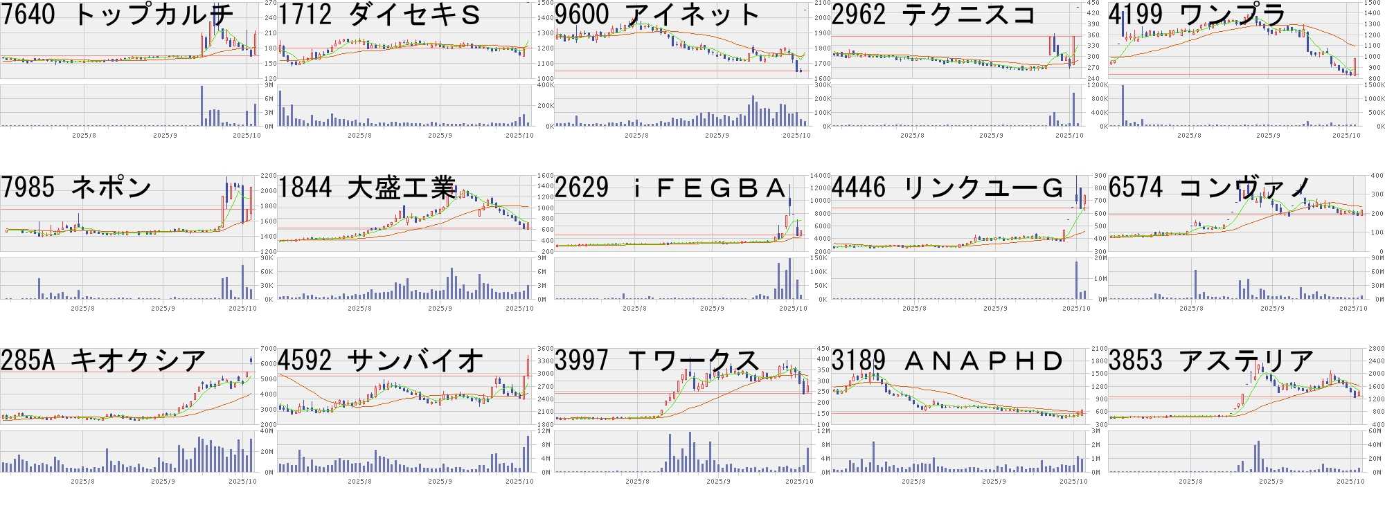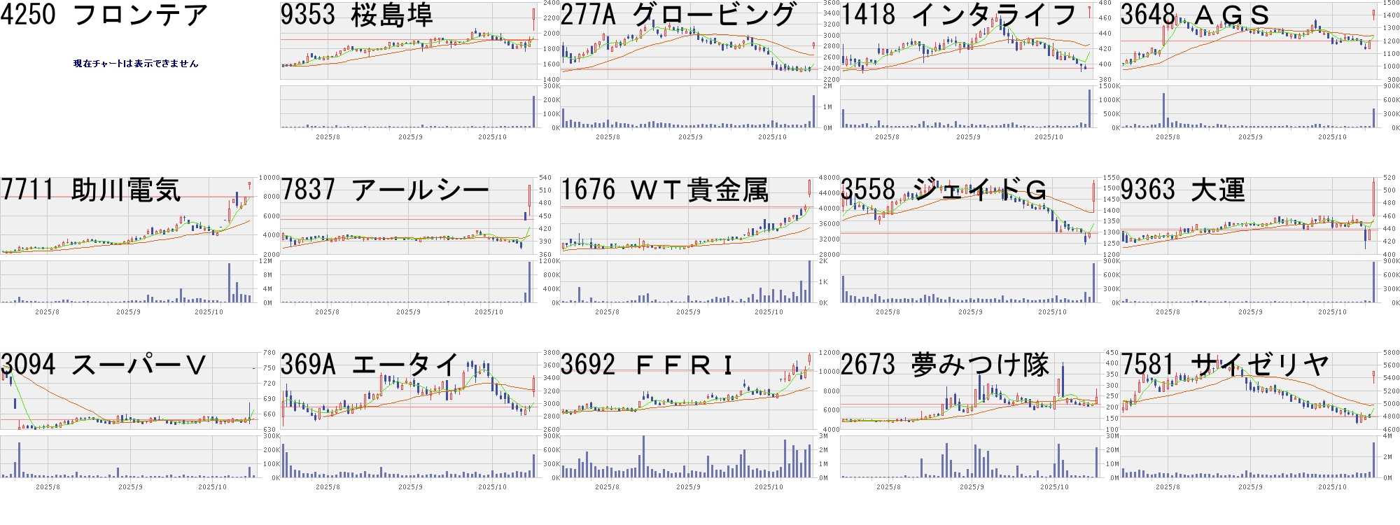 コード,銘柄名,市場,株価,前日比,前日比.1,出来高,PER,PBR,利回り4250,フロンテア,福Q,1480,300,+25.42%,7900,14.1,1.99,2.369353,桜島埠,東S,2316,400,+20.88%,220600,16.0,0.51,1.73277A,グロービング,東G,2854,484,+20.42%,1524800,31.7,14.66,-1418,インタライフ,東S,474,80,+20.30%,1346200,9.7,1.58,5.273648,AGS,東S,1437,241,+20.15%,397500,14.2,1.62,2.237711,助川電気,東S,9460,1500,+18.84%,1930900,62.9,10.84,0.427837,アールシー,東S,521,80,+18.14%,1147500,-,0.95,-1676,WT貴金属,東E,47190,6980,+17.36%,1989,-,-,-3558,ジェイドG,東G,1519,224,+17.30%,829900,-,2.41,1.979363,大運,東S,512,74,+16.89%,865700,8.9,0.71,2.543094,スーパーV,東S,748,100,+15.43%,14600,30.6,5.45,-369A,エータイ,東G,3390,450,+15.31%,488200,25.2,4.54,1.593692,FFRI,東G,11700,1540,+15.16%,2310900,129,32.20,0.122673,夢みつけ隊,東S,245,32,+15.02%,21078100,41.3,1.00,-7581,サイゼリヤ,東P,5500,705,+14.70%,3309000,21.8,2.32,0.55コード,銘柄名,市場,株価,前日比,前日比.1,出来高,PER,PBR,利回り373A,リップス,東G,2575,-700,-21.37%,7100,13.4,1.82,-6224,JRC,東G,1348,-323,-19.33%,844800,15.1,3.30,2.084592,サンバイオ,東G,3000,-695,-18.81%,5492400,-,200,-4446,リンクユーG,東P,1309,-286,-17.93%,2566500,60.2,7.17,-423A,ライオン事務,東S,374,-80,-17.62%,17970800,14.4,0.98,1.347351,グッドパッチ,東G,716,-150,-17.32%,426500,15.3,1.52,1.402884,ヨシムラHD,東P,734,-150,-16.97%,736200,20.6,1.52,-6177,アップバンク,東G,190,-37,-16.30%,4906800,-,32.82,-4015,ペイクラウド,東G,544,-100,-15.53%,807100,24.0,1.98,-325A,テンシャル,東G,4290,-700,-14.03%,583300,15.8,6.99,-1490,上場ベータヘ,東E,8110,-1290,-13.72%,41,-,-,-304A,フォルシア,東G,2100,-325,-13.40%,47500,15.1,1.32,-3440,日創グループ,東S,986,-144,-12.74%,157200,12.2,0.50,4.263547,串カツ田中,東S,2214,-323,-12.73%,736000,32.8,6.37,-4571,ナノMRNA,東G,208,-30,-12.61%,21804200,-,5.67,-にほんブログ村