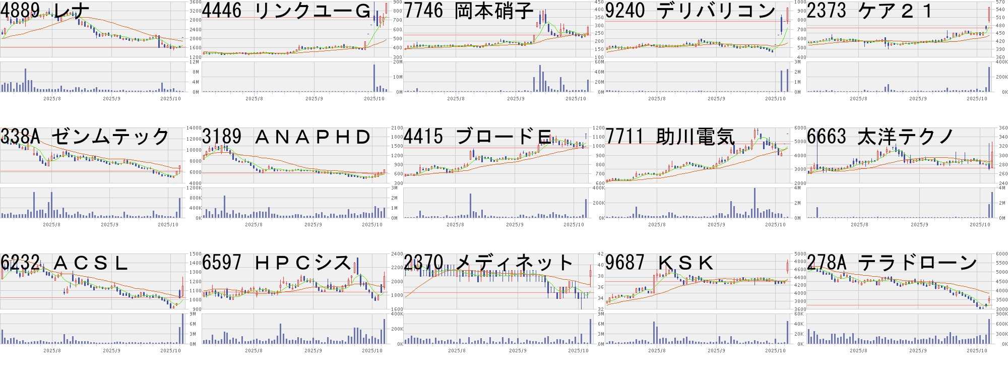 コード,銘柄名,市場,株価,前日比,前日比.1,出来高,PER,PBR,利回り4889,レナ,東G,2034,400,+24.48%,26900,-,15.64,-4446,リンクユーG,東P,880,150,+20.55%,1463100,40.5,4.82,-7746,岡本硝子,東S,286,48,+20.17%,23323800,344,3.86,-9240,デリバリコン,東G,932,150,+19.18%,2229400,34.6,4.05,-2373,ケア21,東S,549,80,+17.06%,325100,29.7,1.73,3.10338A,ゼンムテック,東G,7180,1000,+16.18%,760100,61.4,15.3,-3189,ANAPHD,東S,733,100,+15.80%,996500,-,48.8,-4415,ブロードE,東G,1130,150,+15.31%,246300,17.3,4.71,-7711,助川電気,東S,5530,700,+14.49%,72700,36.8,6.34,0.726663,太洋テクノ,東S,307,35,+12.87%,3352000,59.3,0.76,1.956232,ACSL,東G,1149,128,+12.54%,8922700,-,44.69,-6597,HPCシス,東G,2071,224,+12.13%,322000,17.9,3.3,1.552370,メディネット,東G,39,4,+11.43%,7203300,-,2.57,-9687,KSK,東S,4760,470,+10.96%,44700,14.6,1.75,3.42278A,テラドローン,東G,3550,335,+10.42%,725900,-,5.08,-コード,銘柄名,市場,株価,前日比,前日比.1,出来高,PER,PBR,利回り2629,iFEGBA,東E,3947,-700,-15.06%,43736,-,-,-1382,ホーブ,東S,1929,-316,-14.08%,60700,35.8,1.94,2.599082,大和自,東S,1532,-245,-13.79%,192700,136,0.75,0.523905,データセク,東G,1899,-301,-13.68%,4997200,20.4,8.98,-257A,SMT厳選投,東E,2653,-357,-11.86%,2481,-,-,-3664,モブキャスト,東G,67,-8,-10.67%,23063100,-,8.54,-189A,DMカンパニ,東G,1346,-153,-10.21%,122600,20.2,1.44,1.492467,VLCセキュ,名N,227,-22,-8.84%,115500,48.4,4.35,-6734,ニューテック,東S,1891,-179,-8.65%,56800,13.6,1.32,2.648105,堀田丸正,東S,539,-48,-8.18%,5203600,1016,11.69,-299A,クラシル,東G,1550,-136,-8.07%,452000,28.2,5.83,-6380,オリチェン,東S,2130,-171,-7.43%,21600,27.6,1.60,1.41194A,ウルフハンド,東G,1085,-87,-7.42%,107000,12.6,2.99,-3353,メディ一光G,東S,2880,-230,-7.40%,35400,8.7,0.74,4.174316,ビーマップ,東G,1213,-97,-7.40%,2046300,141,12.38,-にほんブログ村