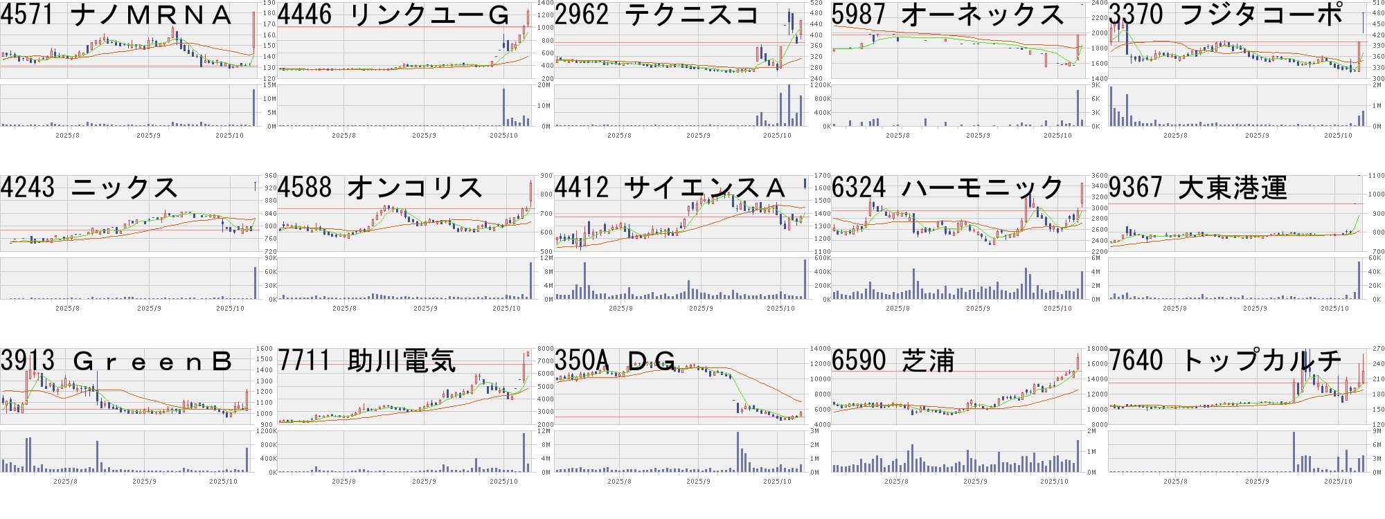 コード,銘柄名,市場,株価,前日比,前日比.1,出来高,PER,PBR,利回り4571,ナノMRNA,東G,181,50,+38.17%,13089200,-,4.93,-4446,リンクユーG,東P,1252,237,+23.35%,3526800,57.6,6.85,-2962,テクニスコ,東S,452,80,+21.51%,862500,138,2.55,-5987,オーネックス,東S,2366,400,+20.35%,1300,60.3,0.75,0.853370,フジタコーポ,東S,481,80,+19.95%,731500,13.6,13.70,0.624243,ニックス,東S,937,150,+19.06%,68800,12.8,0.50,2.134588,オンコリス,東G,859,137,+18.98%,10490900,-,15.41,-4412,サイエンスA,東G,1609,241,+17.62%,566500,116,9.91,-6324,ハーモニック,東S,3450,500,+16.95%,3959500,251,4.29,0.589367,大東港運,東S,1099,150,+15.81%,53900,14.2,1.01,2.183913,GreenB,東G,1198,160,+15.41%,682900,25.8,2.22,-7711,助川電気,東S,7700,1000,+14.93%,2372400,51.2,8.83,0.52350A,DG,東G,5550,635,+12.92%,533500,24.3,4.33,-6590,芝浦,東P,16740,1830,+12.27%,1501800,29.3,4.74,1.197640,トップカルチ,東S,224,23,+11.44%,3572900,-,-,-コード,銘柄名,市場,株価,前日比,前日比.1,出来高,PER,PBR,利回り9240,デリバリコン,東G,790.0,-292.0,-26.99%,6106900,29.3,3.43,-5577,アイデミー,東G,1484.0,-216.0,-12.71%,157900,-,5.12,-218A,リベラウェア,東G,1899.0,-251.0,-11.67%,3430200,-,39.35,-4825,WNIウェザ,東P,4315.0,-475.0,-9.92%,1009000,27.4,4.45,2.092670,ABCマート,東P,2650.0,-256.0,-8.81%,3182300,14.4,1.72,2.643664,モブキャスト,東G,53.0,-5.0,-8.62%,7705800,-,6.75,-7445,ライトオン,東S,271.0,-25.0,-8.45%,411500,318,21.09,-5243,ノート,東G,1513.0,-131.0,-7.97%,2961400,76.3,9.17,-3628,データHR,東G,590.0,-51.0,-7.96%,49300,11.9,78.04,-5597,ブルーイノベ,東G,2066.0,-174.0,-7.77%,170400,-,21.71,-2585,Lドリンク,東P,2073.0,-171.0,-7.62%,1522400,24.2,7.38,0.683905,データセク,東G,1517.0,-123.0,-7.50%,6895900,16.3,7.17,-219A,ハートシード,東G,1725.0,-136.0,-7.31%,2497900,429,5.47,-5131,リンカーズ,東G,218.0,-16.0,-6.84%,844900,-,2.69,-4957,ヤスハラケミ,東S,1025.0,-72.0,-6.56%,41000,9.1,0.43,1.17にほんブログ村